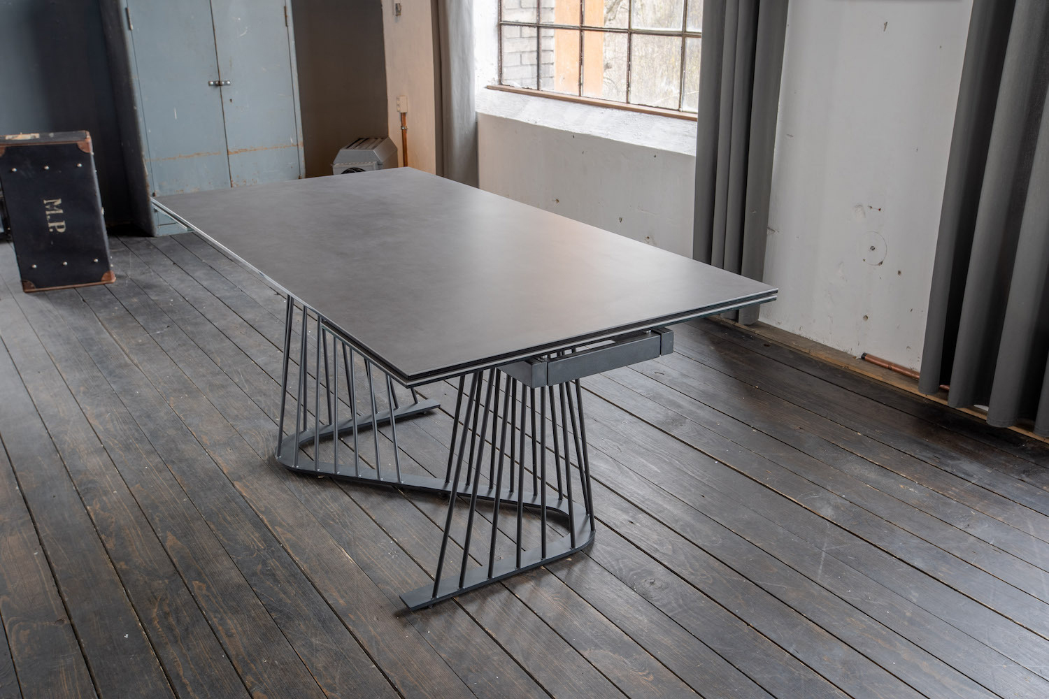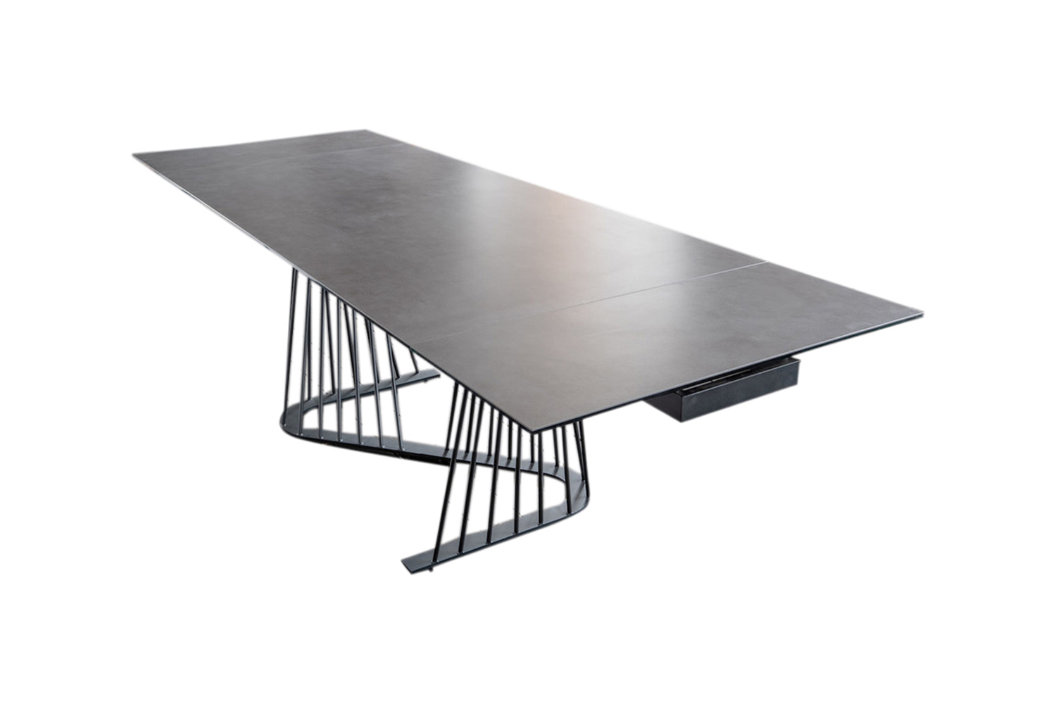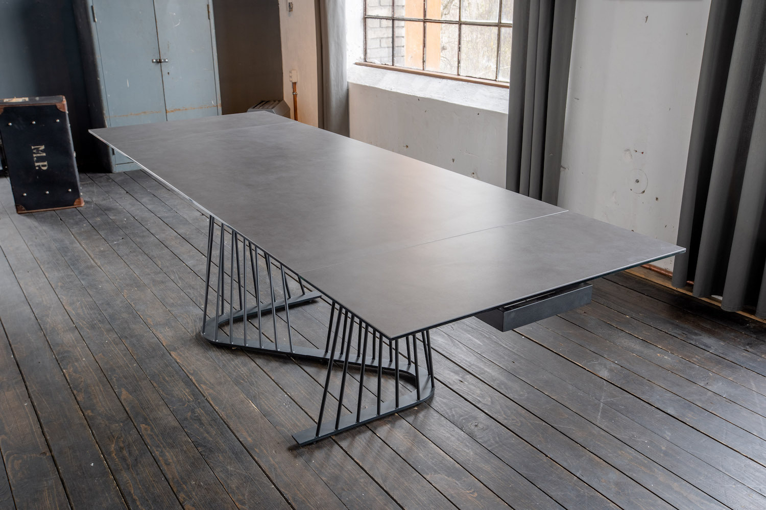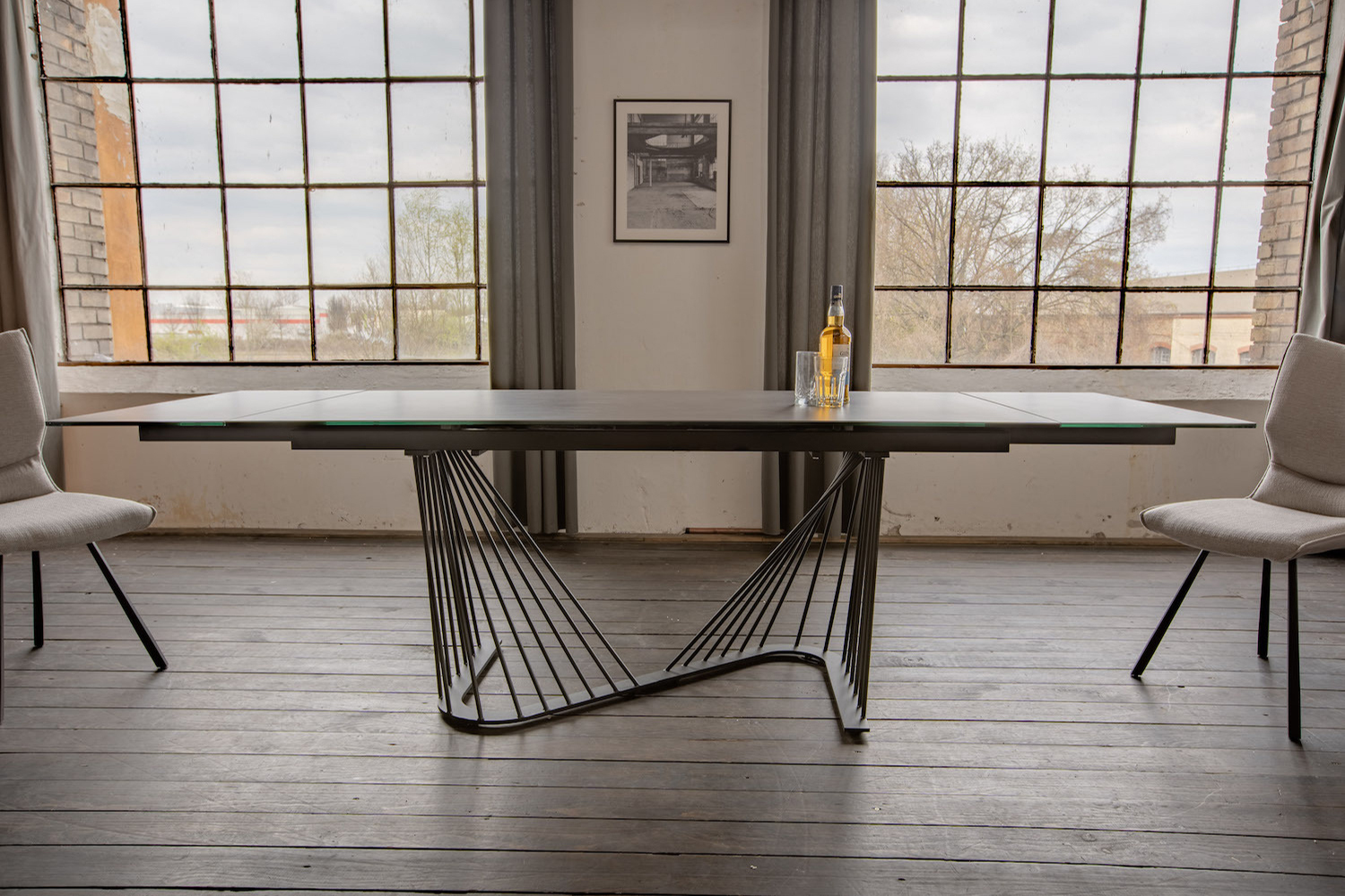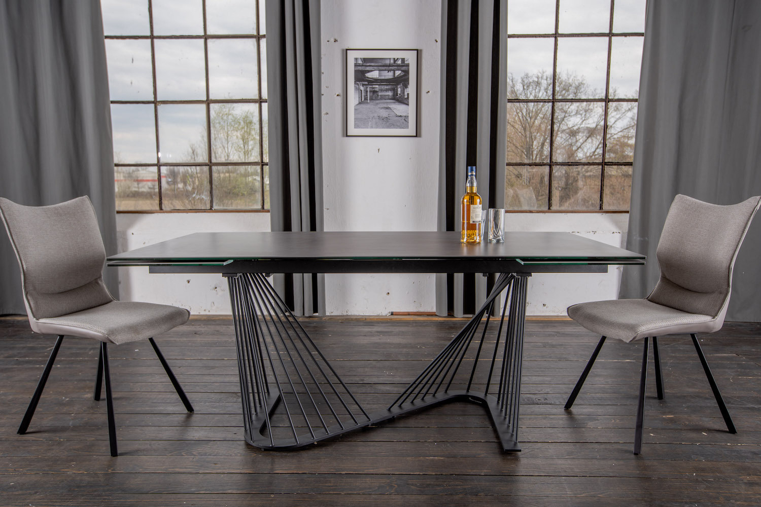 Der spannende Esszimmertisch ELOISE von KAWOLA bietet eine gekonnte Designkombination aus robusten Materialien in filigraner Optik. Der s-förmige Fuß aus dunklem Metall kontrastiert wunderbar mit der grauen Keramikplatte des Tischs. Durch die vielen Zwischenstreben gewinnt der Fuß an Leichtigkeit. Besonders praktisch an diesem Tisch ist, dass er auf bis zu 260 cm erweitert werden kann. Dies ist durch die an beiden Tischenden ausziehbare Tischplatte. Ob zu Hause bei einem Abend mit Freunden, oder bei einer Konferenz im Büro, dieser Tisch bietet Platz für jedermann.