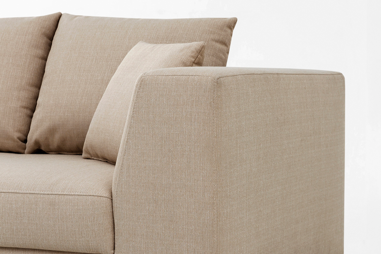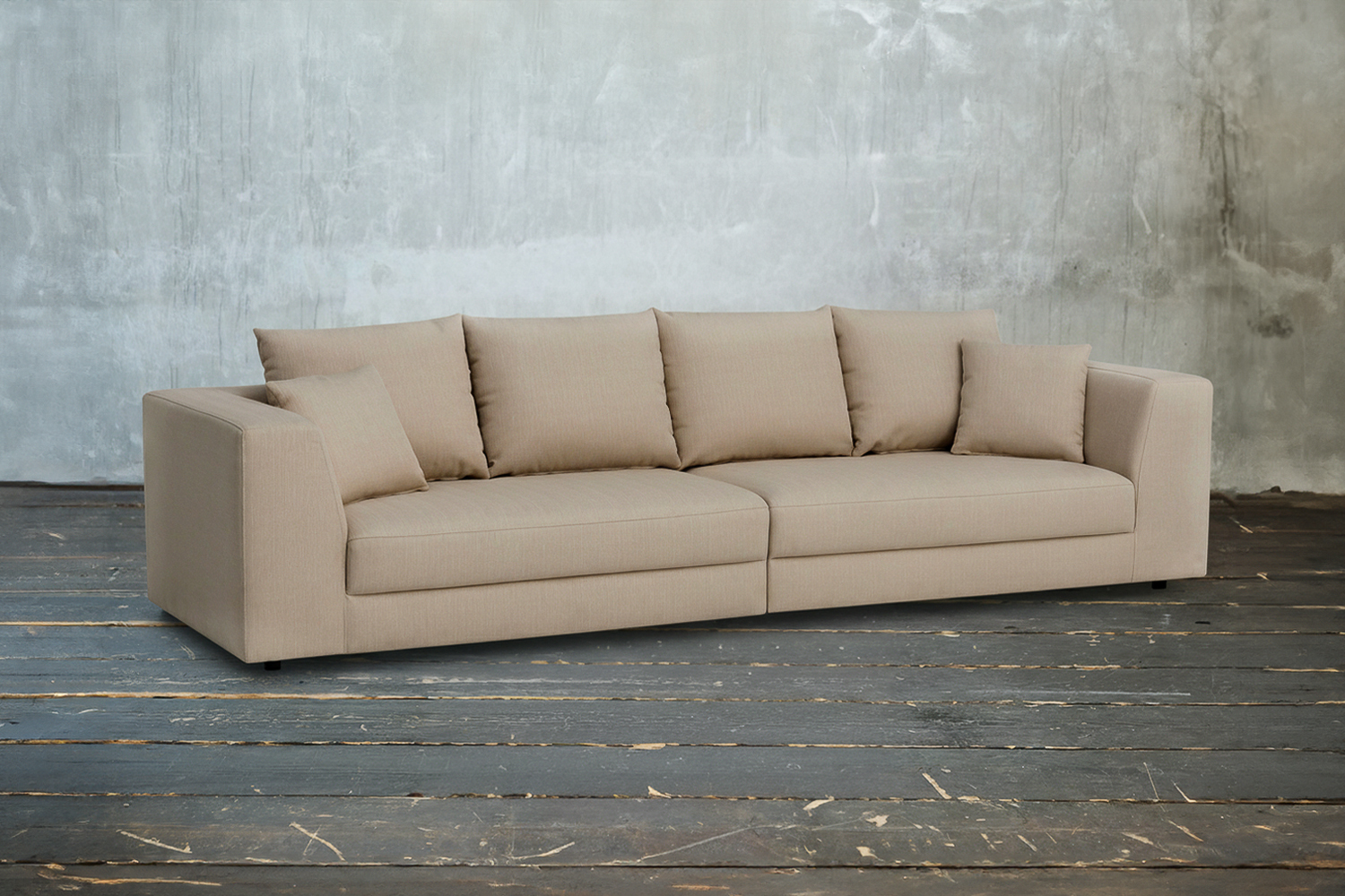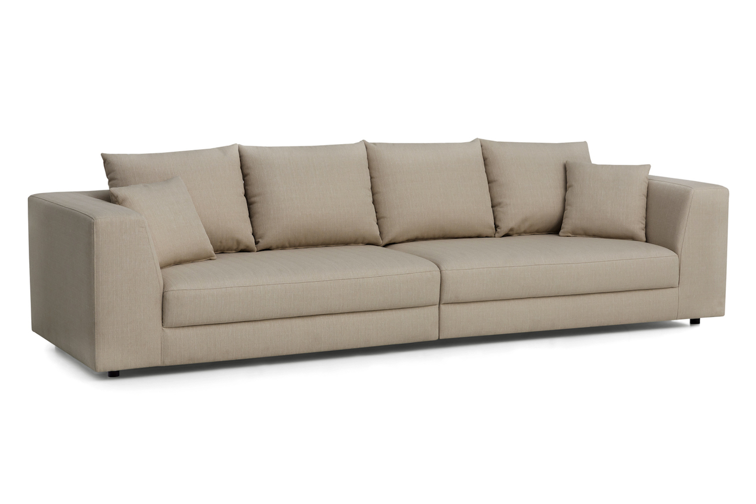 Das Big Sofa MERA ist trotz, oder gerade wegen seines zurückhaltenden Designs unglaublich elegant. Die Armlehnen sind sanft abgeschrägt und wirken von vorne fast trapezartig, allgemein ist die XXL-Couch sehr geradlinig gestaltet. Das Polstermöbelstück ist rundherum mit robustem Stoff bezogen und kann so frei in den Raum gestellt werden. Robust ist nicht nur der Bezug, denn die tragenden Teile der Couch MERA sind aus Massivholz gefertigt. Die Rückenkissen können nach Bedarf anders platziert werden. Die kleinen Füße aus Kunststoff sind kaum sichtbar und lassen das Megasofa schwebend wirken. Elegant, modern, minimalistisch und vor allem der perfekte Ort zum Relaxen mit der ganzen Familie - das ist MERA von KAWOLA.