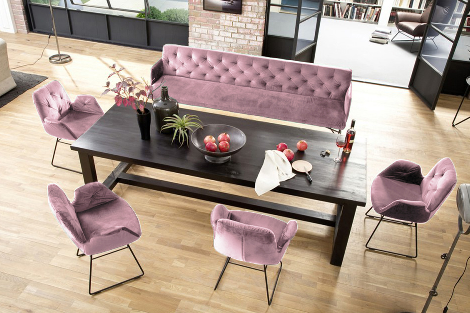 Die KAWOLA Esszimmerbank CHARME in der Farbe Velvet Rosa bringt Vintage-Feeling in jeden Raum. Dank des minimalistischen Designs eignet sich die bequeme Polsterbank CHARME für jedes Heim und lädt ein zu gemeinsamen Spieleabenden mit Freunden oder Familie. Die Bank zeichnet sich durch Ihre legere Polsterung und den damit verbundenen hohen Sitzkomfort aus. Des Weiteren bringt die Rückenlehne mit ihrem Chesterfield-Stil den gewünschten Old-School-Look in ihr Wohnzimmer. Durch den legeren Sitzaufbau ist eine modellbedingte und gestalterisch gewünschte Wellenbildung warentypisch und unterstreicht den gemütlichen Faktor der Sitzbank. Die behagliche Polsterung wird durch den samtigen Velvet-Bezug noch einmal zusätzlich unterstrichen, sodass auch die Haptik der Bank gemütlich und kuschelig erscheint. Da CHARME rundum mit Stoff bezogen ist, kann die komfortable Bank auch frei in den Raum gestellt werden. Die Polsterbank fügt sich durch ihre Drahtfüße und dem samtigen Polsterbezug passend in Ihr Zuhause ein. Auf 186cm Länge finden bis zu vier Personen Platz, die uneingeschränkten Sitzkomfort genießen können. Durch ihre Optik eignet sich die Esszimmerbank hervorragend als Ergänzung zu den in unserem Sortiment befindlichen ZAJA-Esszimmerstühlen.