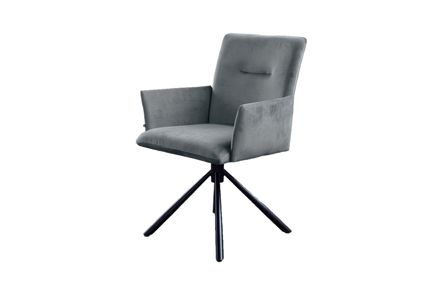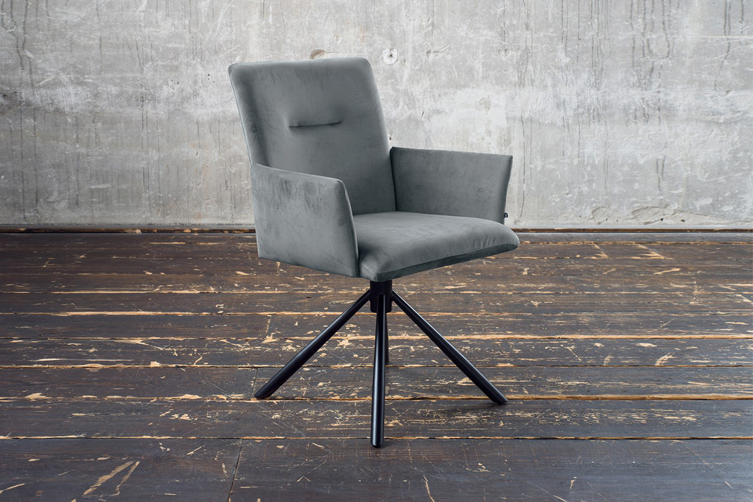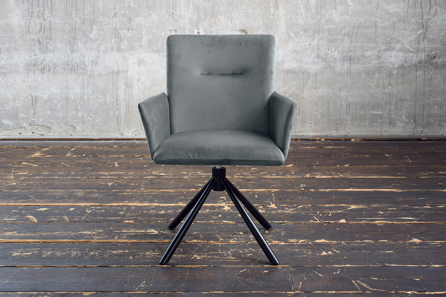 Der KAWOLA Esszimmerstuhl KYRA vereint luxuriösen Komfort und modernes Design und ist die perfekte Ergänzung für jedes stilvolle Esszimmer. Der mit edlem Velvet bezogene Stuhl bietet mit einer Breite von 64 cm, einer Tiefe von 61 cm und einer Höhe von 88 cm viel Raum für bequemen Sitzkomfort. Dank der Sitzhöhe von 49 cm, einer Sitztiefe von 46 cm und einer Sitzbreite von 49 cm lädt der Stuhl zu langen, entspannten Abenden ein. Das besondere Highlight ist das 360° drehbare Gestell mit Auto-Return-Funktion, das sich nach jeder Drehung automatisch in die Ausgangsposition zurückdreht – ideal für flexible und praktische Nutzung am Esstisch. Die stabilen, pulverbeschichteten Füße aus schwarzem Eisen sorgen für sicheren Stand und eine moderne Optik. Die integrierten Armlehnen machen den Esszimmerstuhl noch bequemer und stilvoller. Der Stuhl KYRA ist die ideale Wahl für alle, die Sitzkomfort und Funktionalität mit einem Hauch von Luxus verbinden möchten.-