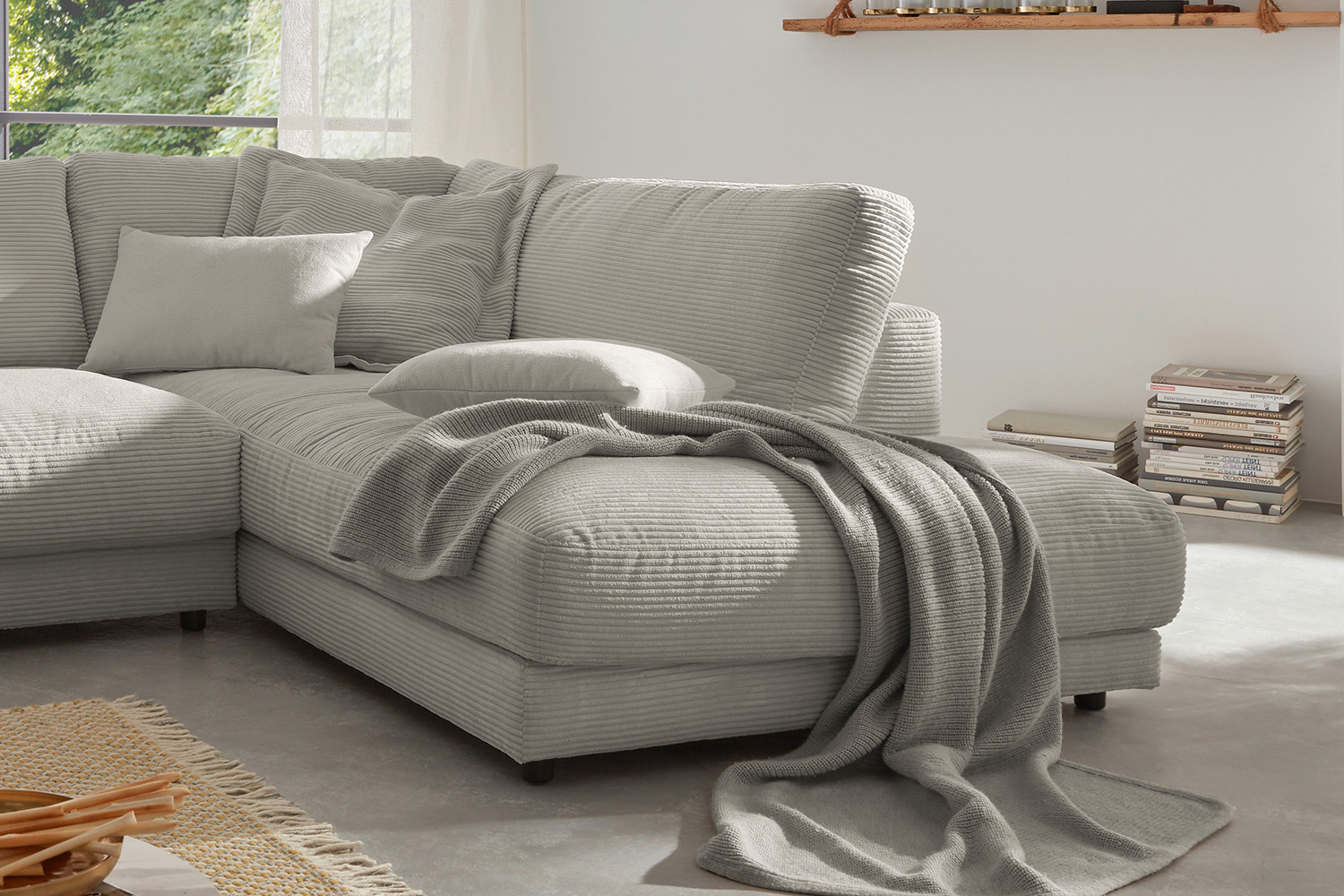 Das KAWOLA Ecksofa MADELINE besticht durch seinen hervorragenden Sitzkomfort, der durch die äußerst legere Polsterung zustande kommt und zum Verweilen und Entspannen einlädt. Die Polsterung passt sich der Körperform an; Sitzabdrücke sowie Wellenbildung der Bezüge sind warentypisch. Der Sitz besteht aus einer Unterfederung mit dauerelastischen Stahl-Wellenfedern und einer oberseitigen Abdeckung sowie losen Sitzkissen aus PUR-Schaum. Sitz und Rücken sind abgedeckt mit einem Inlett, welches befüllt ist mit hochwertigen Füllstoffen, die eine Beimischung von Federn enthalten. Der Bezug aus trendigem Cord-Stoff verleiht dem Big Sofa eine zeitlose Eleganz. Wenn Sie Ihrem Wohnzimmer einen außergewöhnlichen Anstrich verleihen wollen, ist das Sofa MADELINE definitiv das Richtige für Sie!