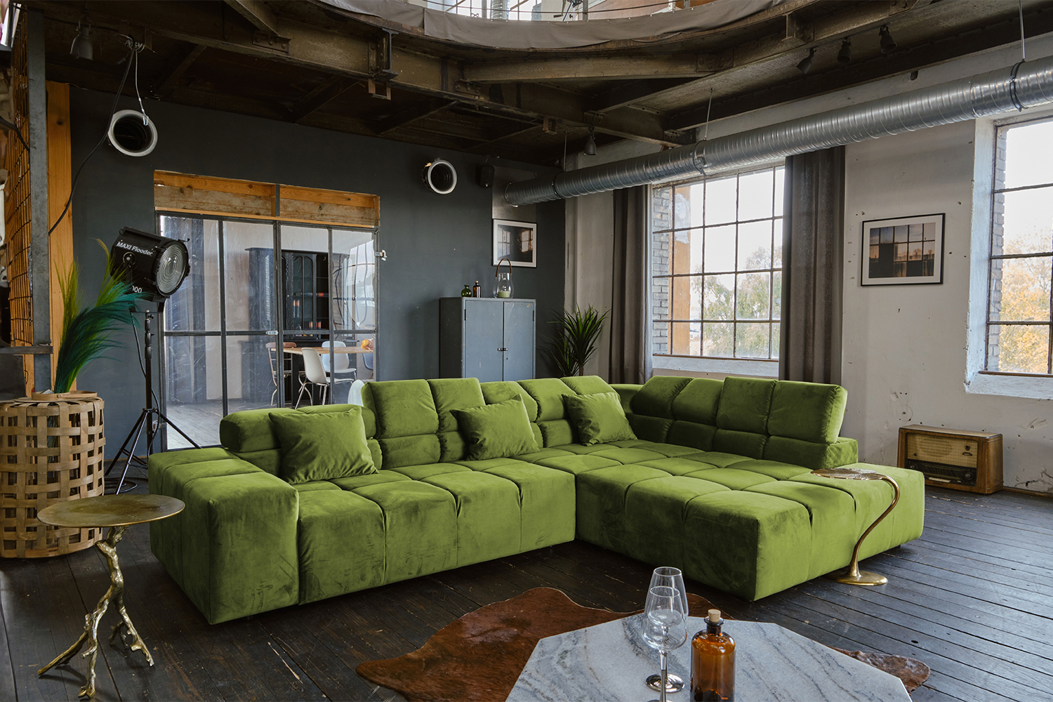Sitzkomfort: weicher und legerer Polsteraufbau; die Polsterung passt sich der Körperform an; Sitzabdrücke sowie Wellenbildung der Bezüge sind warentypisch
