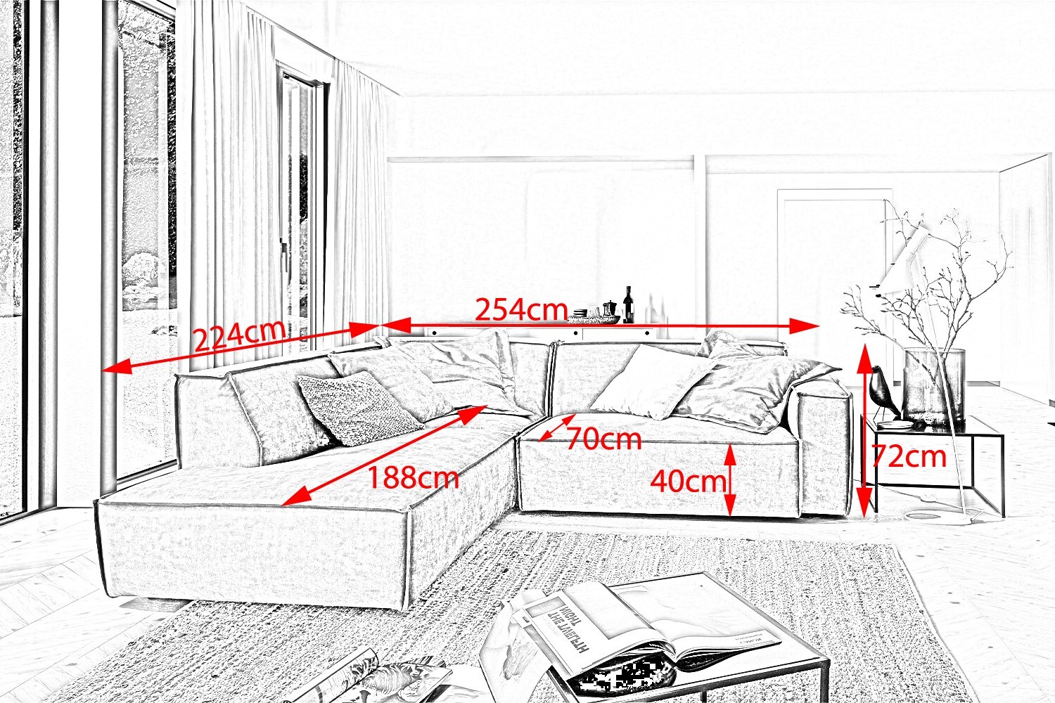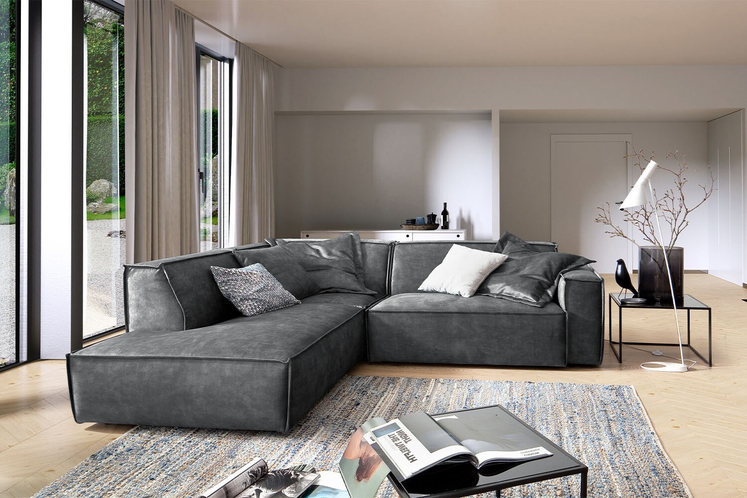 Das KAWOLA Ecksofa SAMU besticht durch seinen hervorragenden Sitzkomfort, der durch den äußerst weichen und legeren Polsteraufbau zustande kommt und zum Verweilen und Entspannen einlädt. Die Polsterung passt sich der Körperform an; Sitzabdrücke sowie Wellenbildung der Bezüge sind warentypisch. Seine moderne und urbane Form verleihen dem Sofa sein unverwechselbares Aussehen und bieten ausreichend Platz, um gemütliche Abende zu verbringen. Mit seinem zeitlosen Design fügt es sich nahtlos in jede Umgebung ein und macht auch frei im Raum stehend eine gute Figur. Wenn Sie Ihrem Wohnzimmer einen außergewöhnlichen Anstrich verleihen wollen, ist das Sofa SAMU definitiv das Richtige für Sie!