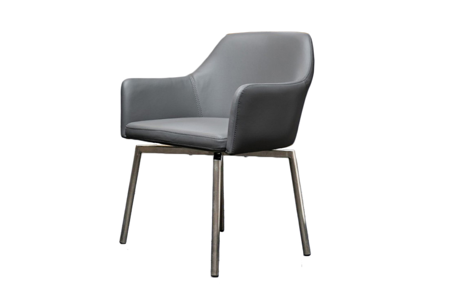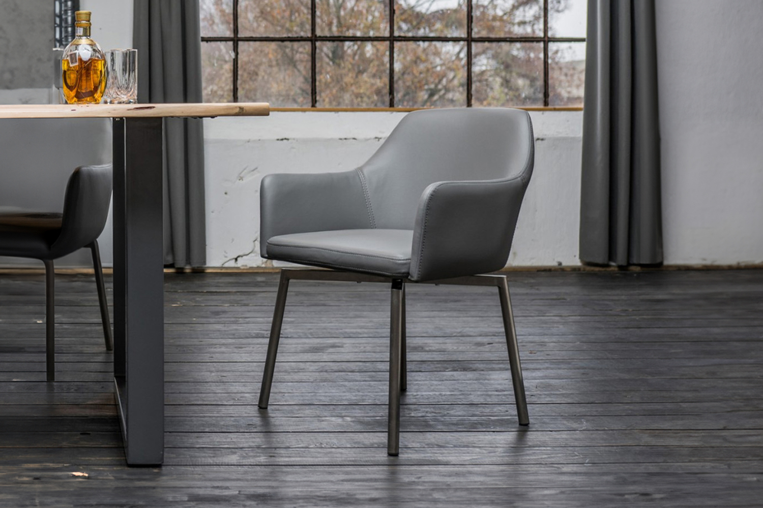 Der Stuhl Loui überzeugt durch sein schlichtes und elegantes Design. Der Esszimmerstuhl vereint das Klassische mit dem Modernen auf gekonnte Art und Weise. Durch sein klassisches und zugleich modernes Aussehen kann der Stuhl Loui in jedes bestehende Wohnambiente integriert werden. Das Gestell in Edelstahl harmonisiert hervorragend mit der Wahl des Bezuges und verleht dem Stuhl seinen modernen Charakter. Der Clou des Stuhls liegt darin, dass die Sitzschale über eine Drehfunktion verfügt. Der Bezug in Lederimitat ist pflegeleicht und Verschmutzungen können mit einem feuchten Tuch einfach entfernt werden. Durch die Wahl des Bezuges eignet sich der Stuhl mit Armlehnen für jeden Einsatzbereich; ganz gleich ob im Esszimmer, im Konferenzraum oder im Wartebereich der Stuhl Loui macht überall eine gute Figur.