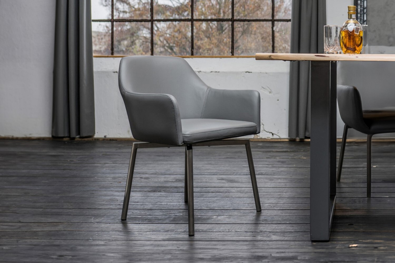 Der Stuhl Loui überzeugt durch sein schlichtes und elegantes Design. Der Esszimmerstuhl vereint das Klassische mit dem Modernen auf gekonnte Art und Weise. Durch sein klassisches und zugleich modernes Aussehen kann der Stuhl Loui in jedes bestehende Wohnambiente integriert werden. Das Gestell in Edelstahl harmonisiert hervorragend mit der Wahl des Bezuges und verleht dem Stuhl seinen modernen Charakter. Der Clou des Stuhls liegt darin, dass die Sitzschale über eine Drehfunktion verfügt. Der Bezug in Lederimitat ist pflegeleicht und Verschmutzungen können mit einem feuchten Tuch einfach entfernt werden. Durch die Wahl des Bezuges eignet sich der Stuhl mit Armlehnen für jeden Einsatzbereich; ganz gleich ob im Esszimmer, im Konferenzraum oder im Wartebereich der Stuhl Loui macht überall eine gute Figur.