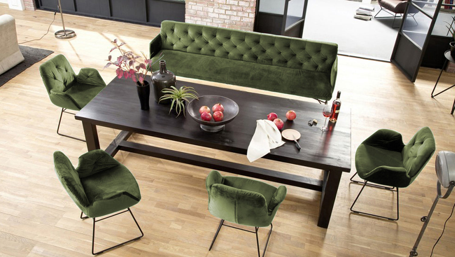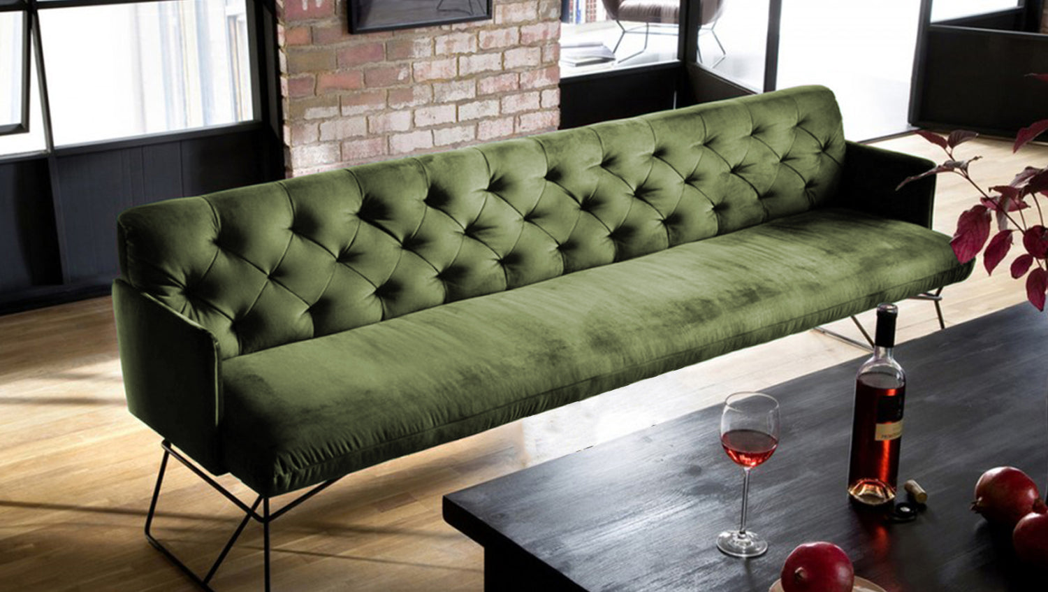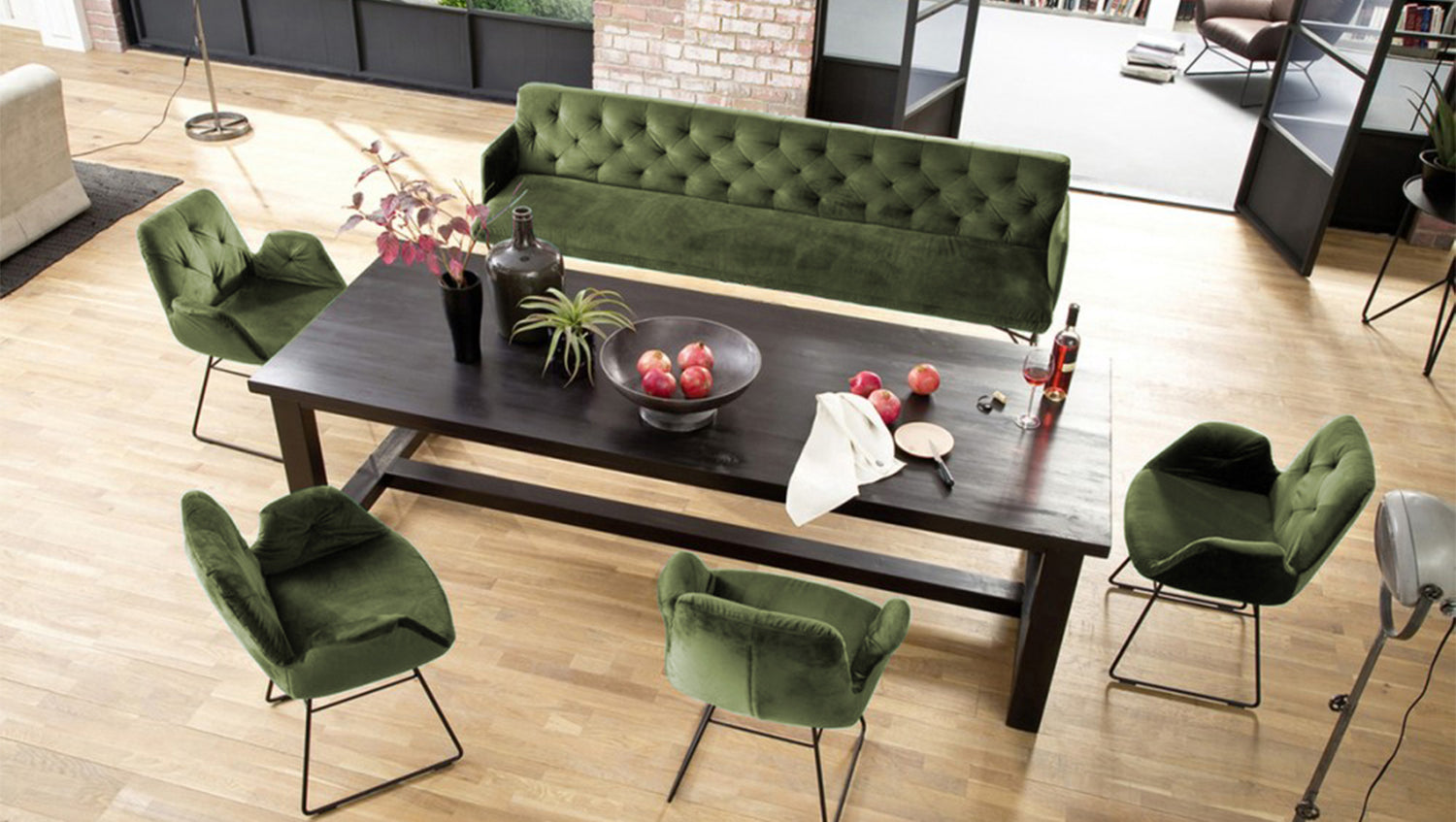 Die KAWOLA Esszimmerbank CHARME in der Farbe Velvet Oliv bringt Vintage-Feeling in jeden Raum.