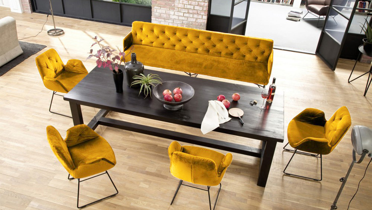 Die KAWOLA Esszimmerbank CHARME in der Farbe Velvet Curry bringt Vintage-Feeling in jeden Raum.