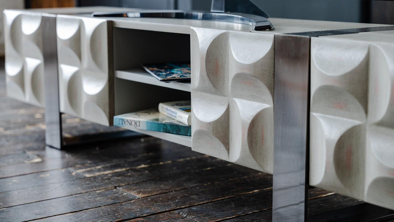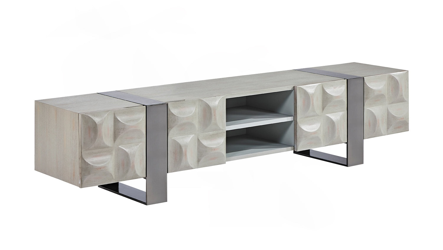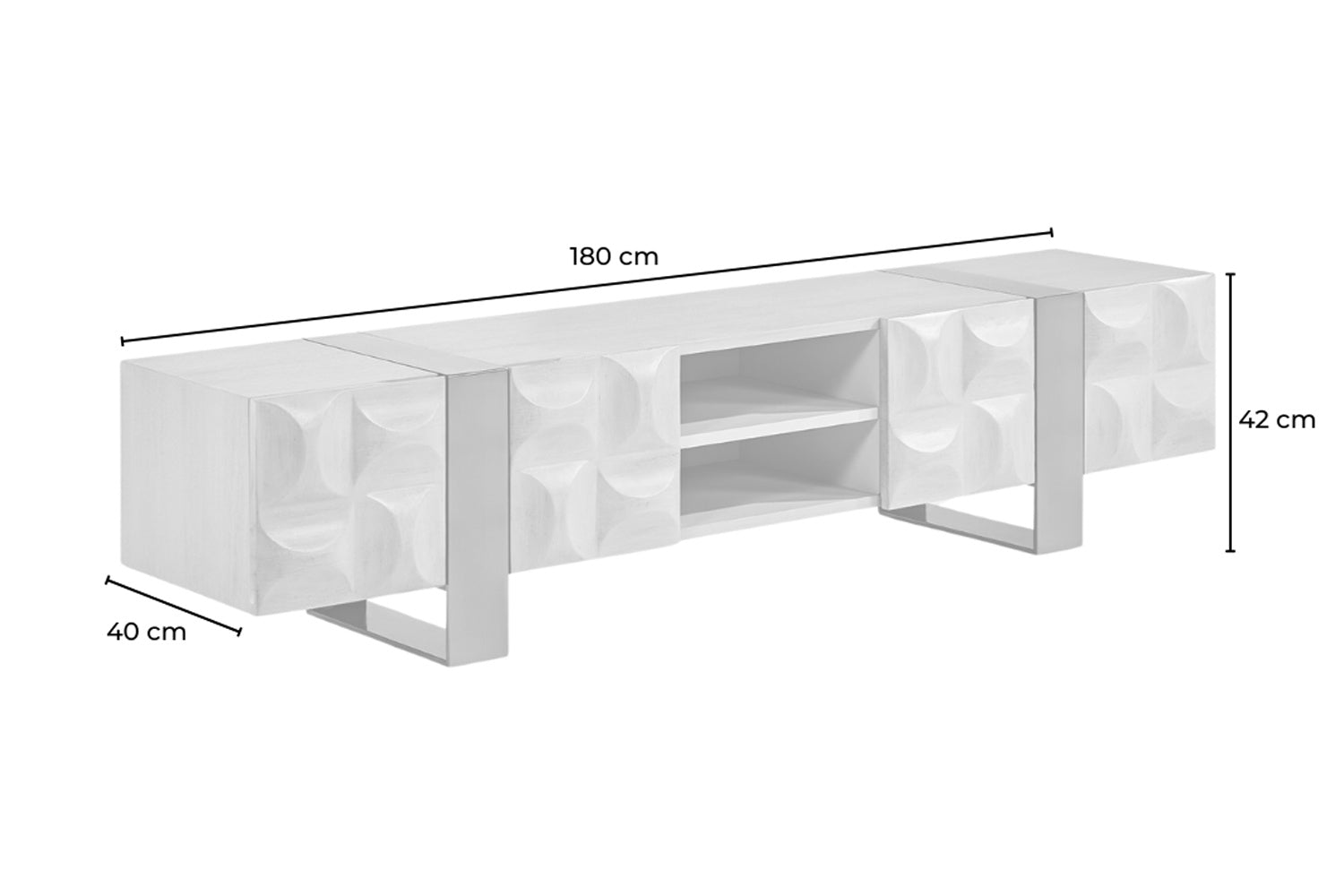 Das KAWOLA Lowboard MARGO besticht durch seine elegante Kombination aus modernem Design und praktischer Funktionalität. Mit seiner Breite von 180 cm ist es der ideale Platz für Ihren Fernseher. Der Korpus und die Türen sind stilvoll mit hochwertigem grauen Ulmenholz furniert, das dem Möbelstück eine luxuriöse Optik verleiht. Die zwei Türen und insgesamt vier Fächer bieten großzügigen Stauraum, die Türen lassen sich dank des Muldengriffes an der Oberseite mühelos öffnen. Die silberfarbenen Kufenfüße aus gebürstetem Edelstahl sorgen für einen modernen, zeitlosen Look und bieten gleichzeitig stabile Standfestigkeit. Das TV-Board MARGO von KAWOLA fügt sich perfekt in jedes Wohnambiente ein und ist ideal für Liebhaber von ausgefallenen, aber dennoch eleganten Möbelstücken. Entdecken Sie die perfekte Kombination aus Design und Funktionalität mit dem Lowboard MARGO!