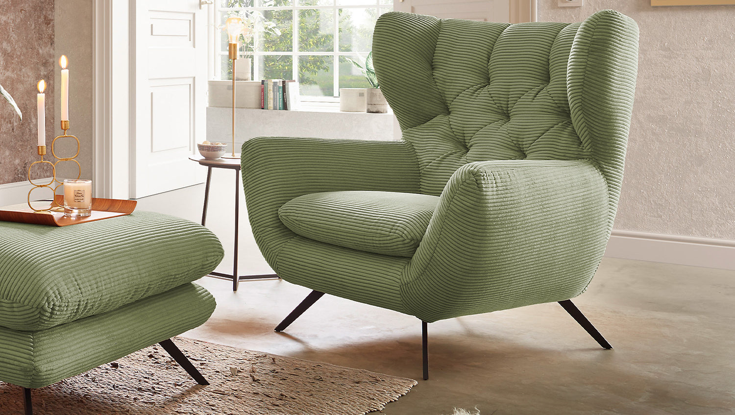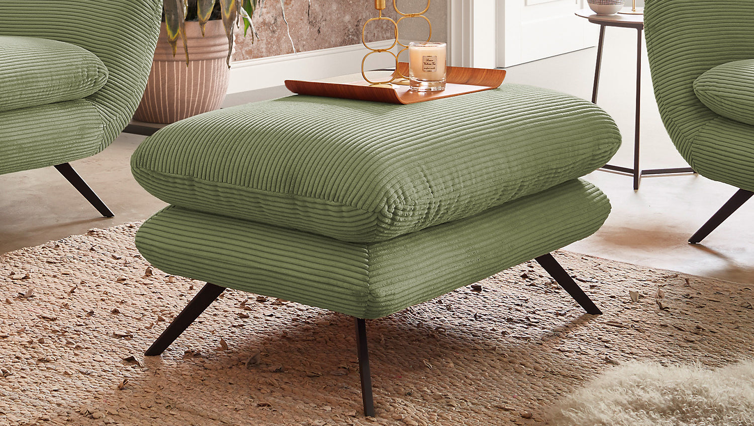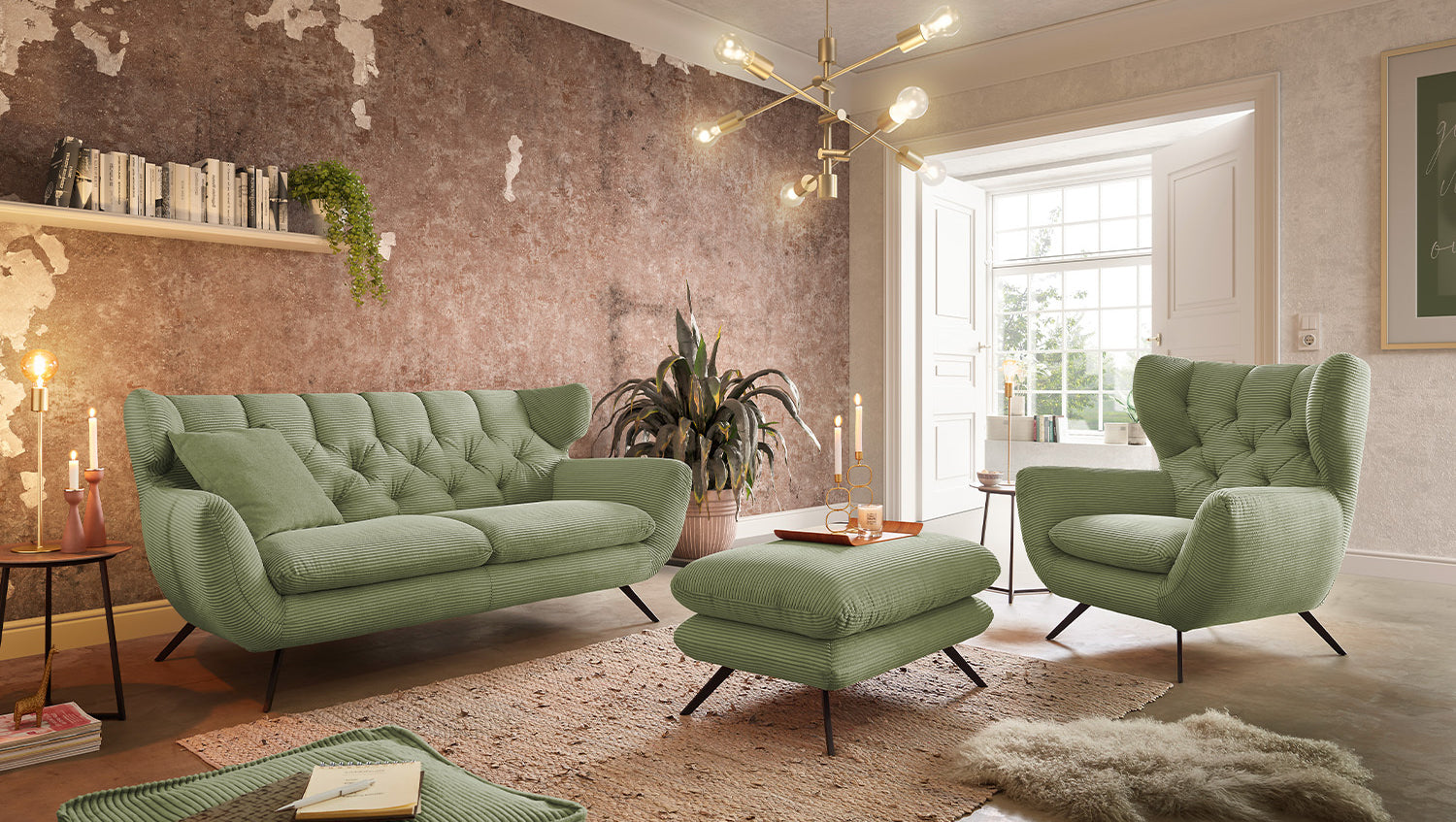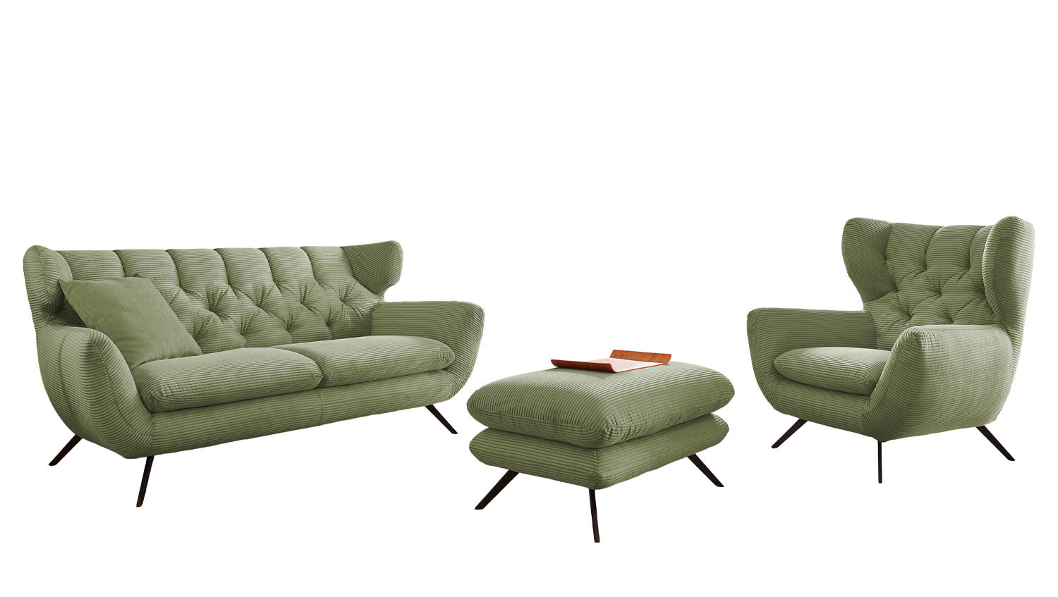 KAWOLA Sitzgruppe CHARME Sofa Sessel Hockerbank Cord olivgrün