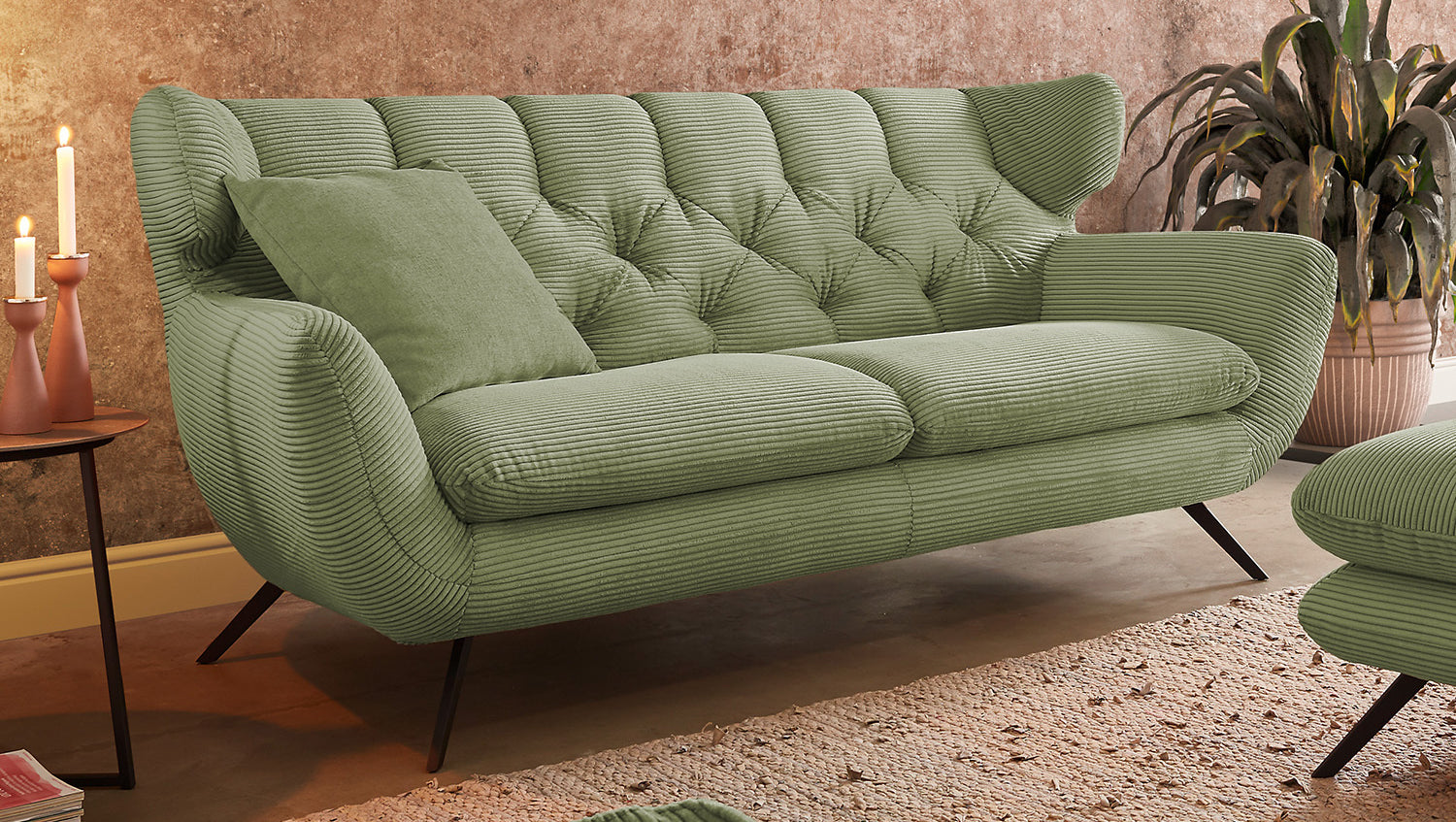 Die KAWOLA Sitzgruppe CHARME, bestehend aus einem Sofa, einem Sessel und einem Hocker, wurde komplett mit Cord überzogen. Auch der Rücken wurde mit Cord überzogen, so dass das Sofa und der Sessel bei Bedarf auch frei in den Raum gestellt werden können. Der Stil erinnert an die sechziger Jahre: Die Rücken des Sofas und des Sessels wurden aufwendig abgesteppt ohne Knöpfe; die Rückenlehnen wurden an den beiden Seiten leicht nach vorne gewölbt und erinnern an die Form eines Ohrensessels; die Füße aus schwarzem Metall sind leicht ausgestellt. Die Polsterung der KAWOLA Kollektion CHARME besteht aus PUR-Schaum und besticht durch ihren weichen und legeren Sitzkomfort. Die Sitzkissen passen sich der Körperform angenehm an. Wer nicht nur eine Sitzgelegenheit sucht, sondern ein ganz besonderes Highlight, der liegt mit der Sitzgruppe CHARME goldrichtig!