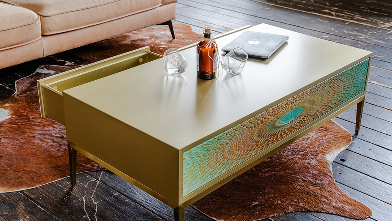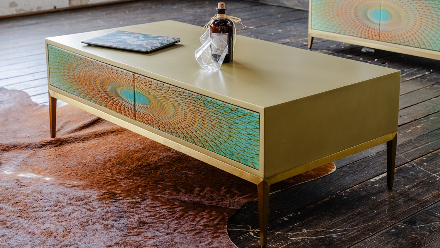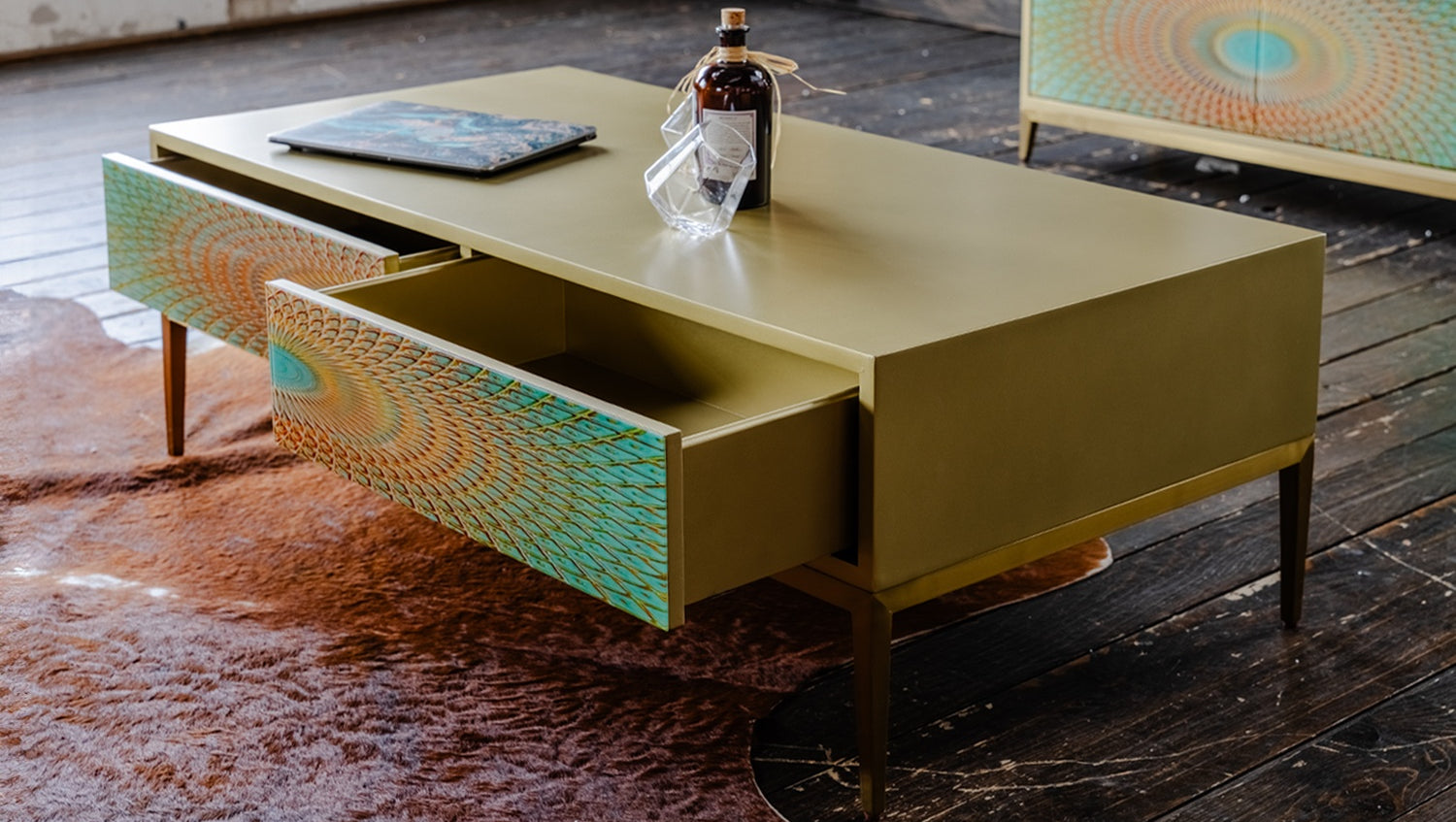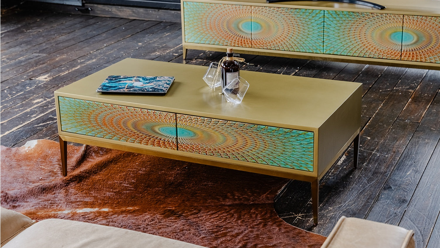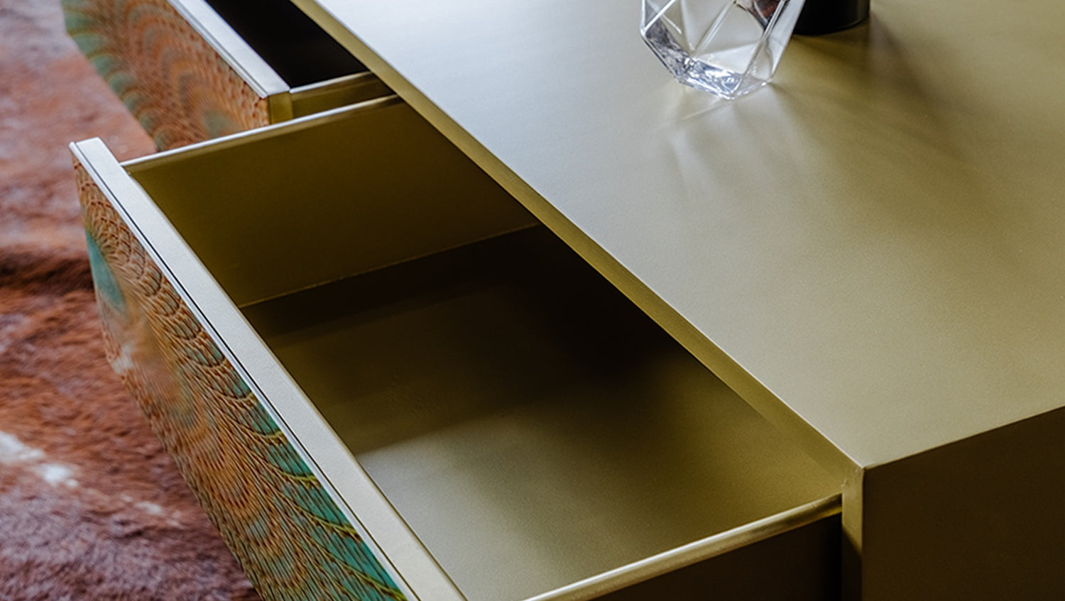 Das KAWOLA Lowboard LAGO besticht durch seine elegante Kombination aus ausgefallenem Design und praktischer Funktionalität. Es eignet sich auch ideal als Couchtisch oder Beistelltisch. Die Schubladen sind mit Hartglas beschichtet und weisen goldfarbene Verzierungen auf, die die Form eines Pfauenauges ergeben. Die zwei Schubladen bieten großzügigen Stauraum, die Türen lassen sich dank des komfortablen Push-to-Open-Mechanismus mühelos öffnen. Die goldfarbenen Füße aus gebürstetem Edelstahl sorgen für einen modernen, zeitlosen Look und bieten gleichzeitig stabile Standfestigkeit. Das Lowboard LAGO von KAWOLA fügt sich perfekt in jedes Wohnambiente ein und ist ideal für Liebhaber von außergewöhnlichen, eleganten Möbelstücken. Entdecken Sie die perfekte Kombination aus Design und Funktionalität mit dem Lowboard LAGO!