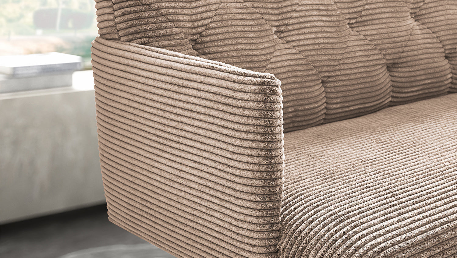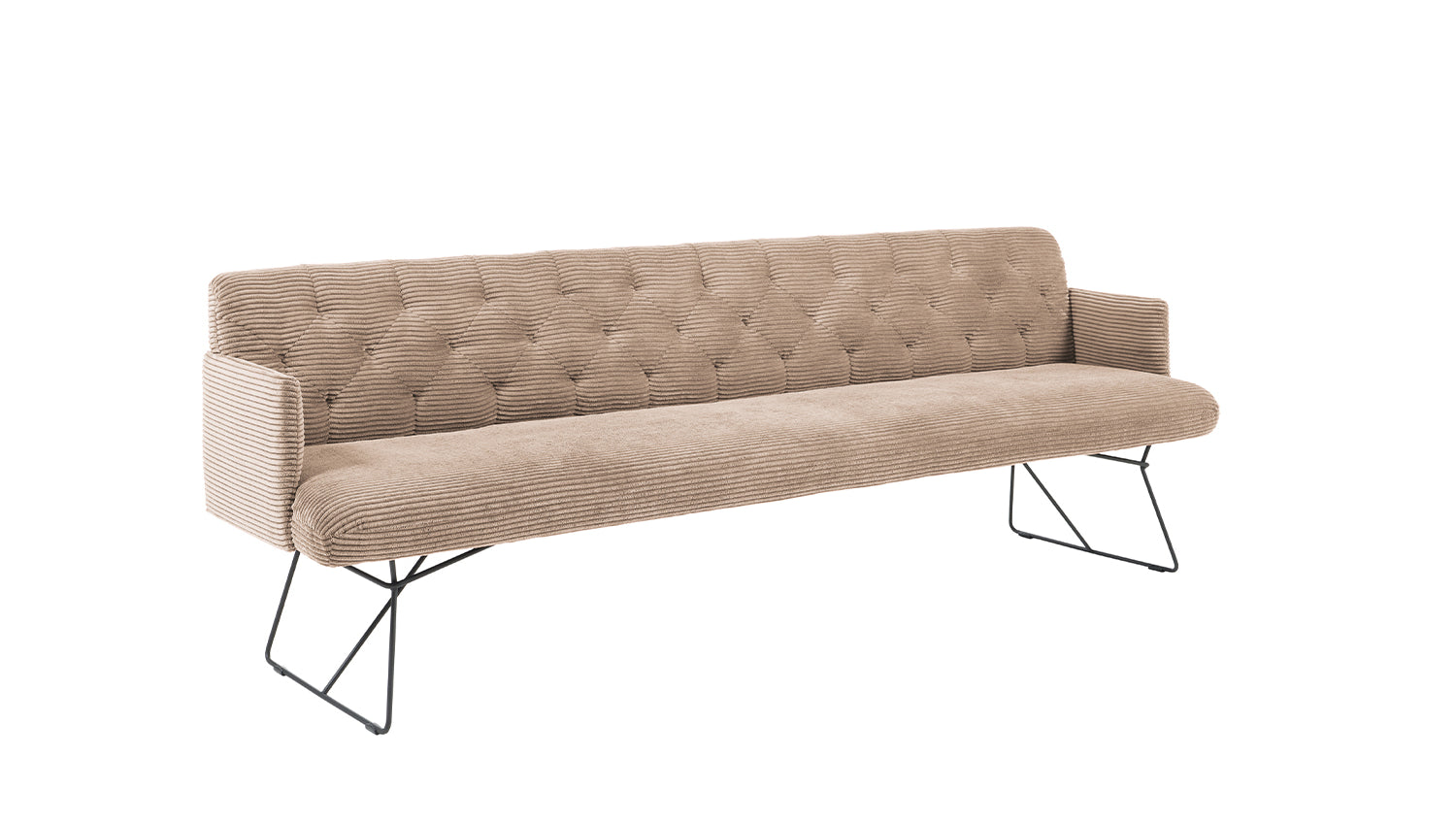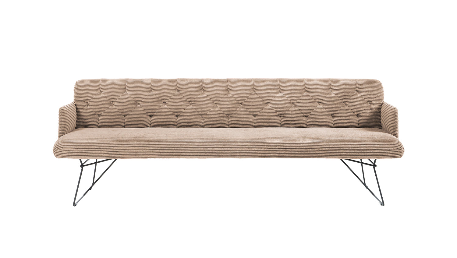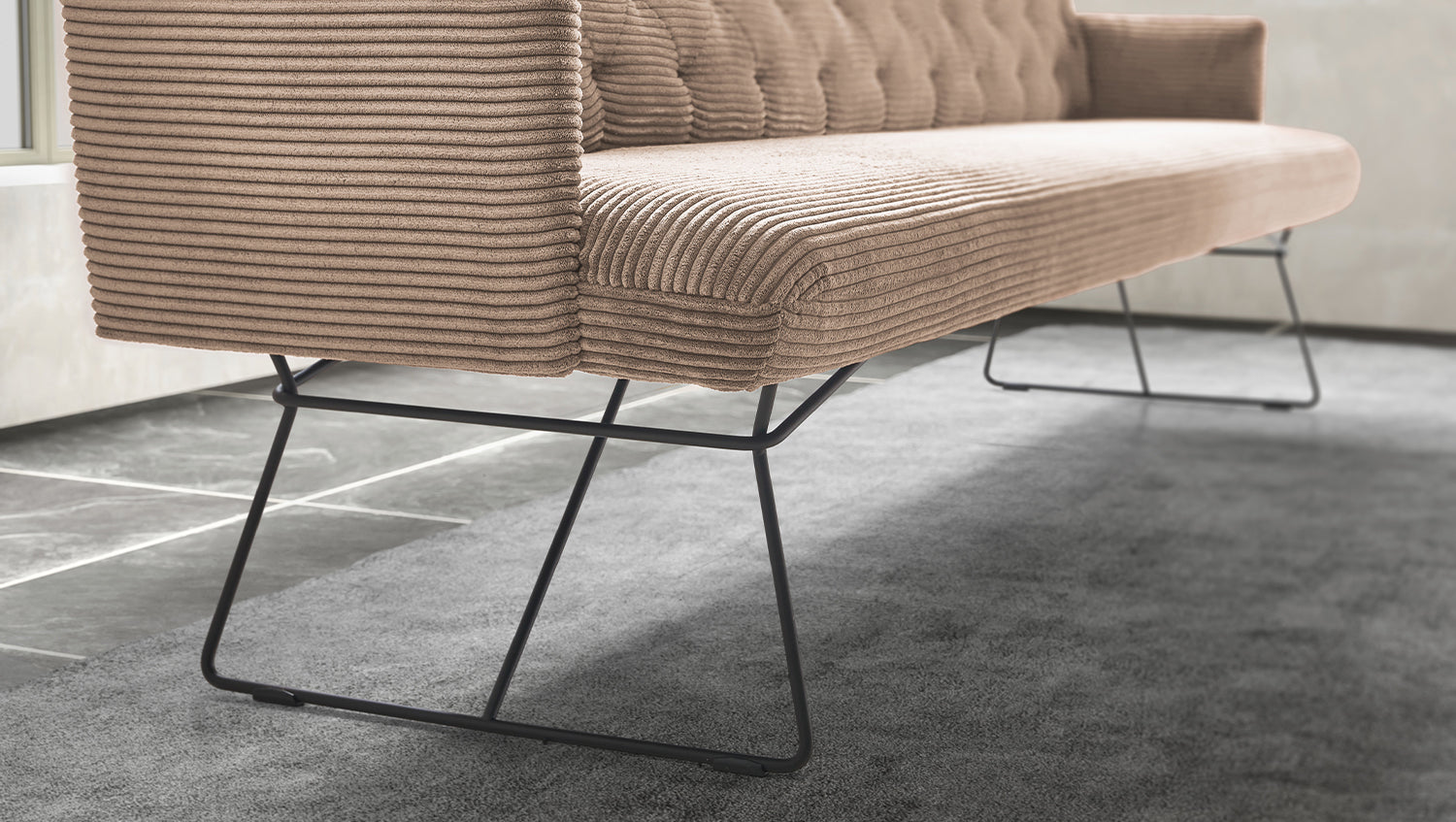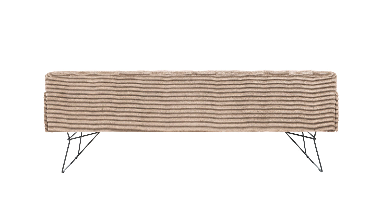 Durch den legeren Sitzaufbau ist eine modellbedingte und gestalterisch gewünschte Wellenbildung warentypisch und unterstreicht den gemütlichen Faktor der Sitzbank. Die behagliche Polsterung wird durch den weichen Bezug aus angesagtem Cord-Stoff noch einmal zusätzlich unterstrichen, sodass auch die Haptik der Bank gemütlich und kuschelig erscheint.