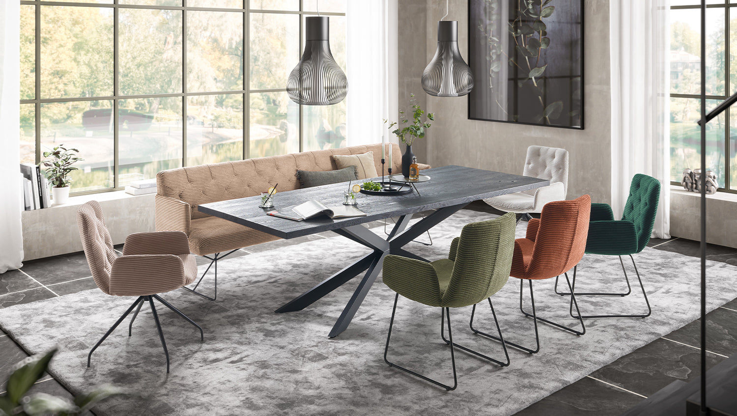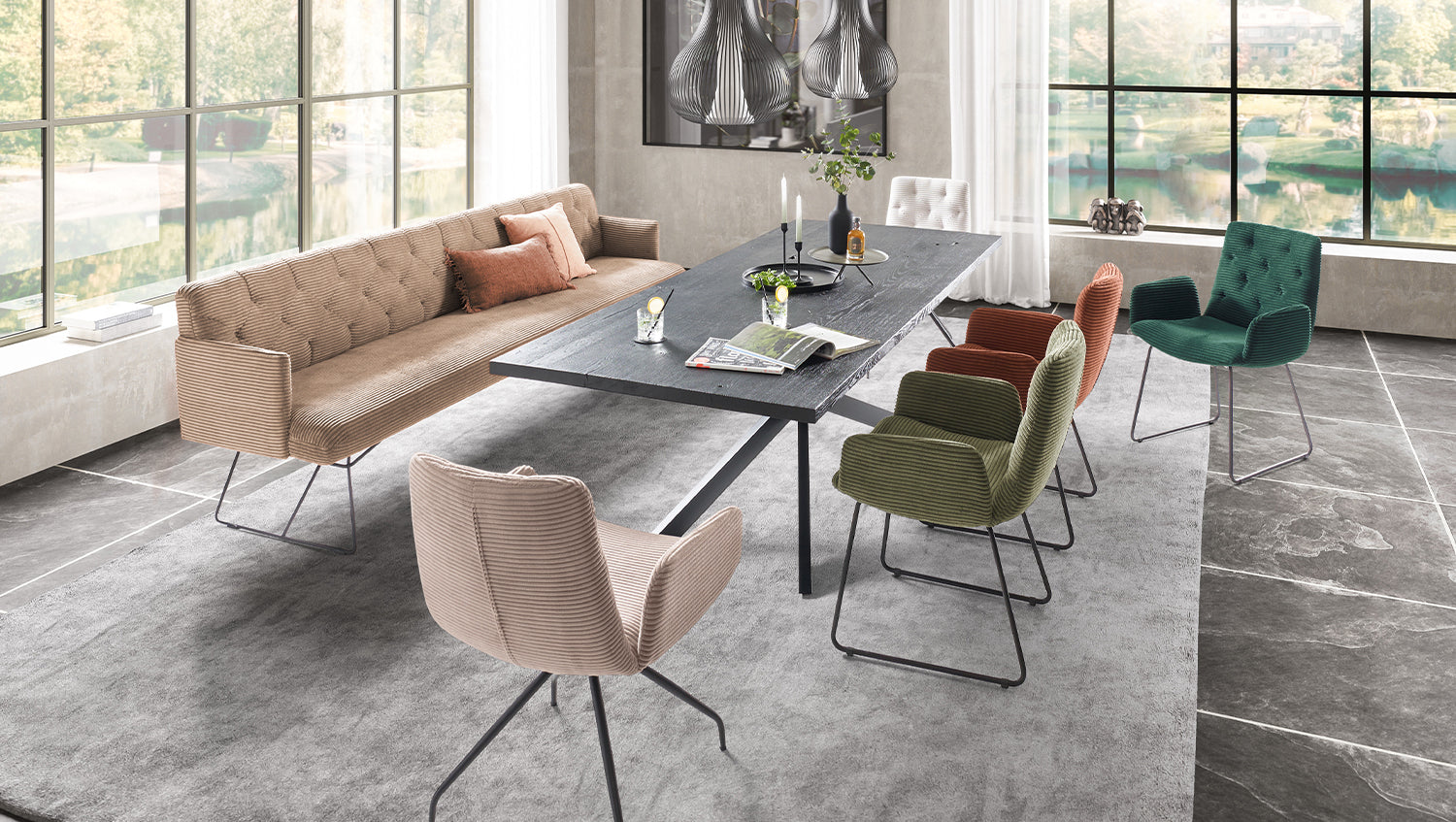 Da die Esszimmerbank CHARME rundum mit Stoff bezogen ist, kann sie auch frei in den Raum gestellt werden. Die Polsterbank fügt sich durch ihre Drahtfüße und den stilvollen Cordbezug passend in Ihr Zuhause ein. Auf der Bank finden bis zu vier Personen Platz, die uneingeschränkten Sitzkomfort genießen können.