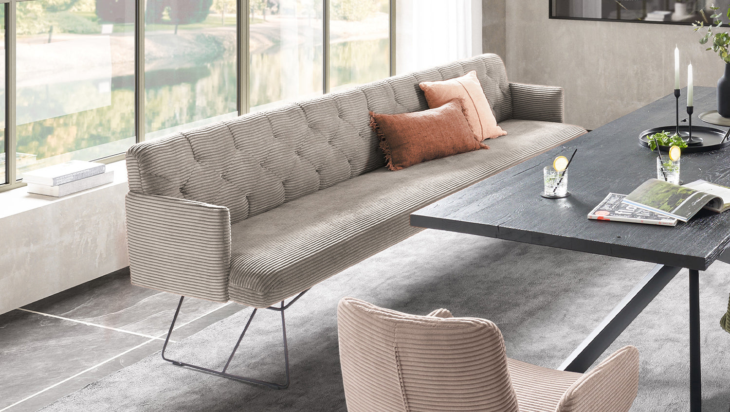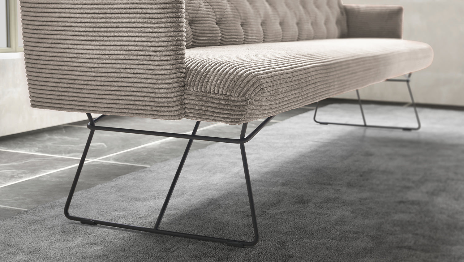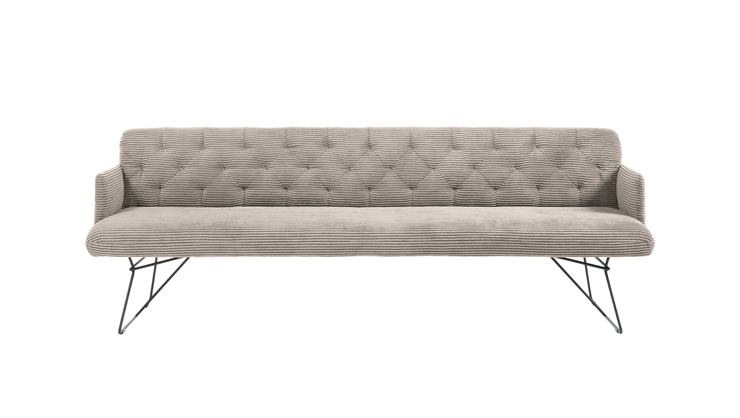 Die KAWOLA Esszimmerbank CHARME  bringt Vintage-Feeling in jeden Raum. Dank des minimalistischen Designs eignet sich die bequeme Polsterbank für jedes Heim und lädt ein zu gemeinsamen Spieleabenden mit Freunden oder Familie. Die Bank zeichnet sich durch Ihre legere Polsterung und den damit verbundenen hohen Sitzkomfort aus. Des Weiteren bringt die Rückenlehne mit ihrem Chesterfield-Stil den gewünschten Old-School-Look in Ihr Wohnzimmer. Durch den legeren Sitzaufbau ist eine modellbedingte und gestalterisch gewünschte Wellenbildung warentypisch und unterstreicht den gemütlichen Faktor der Sitzbank. Die behagliche Polsterung wird durch den weichen Bezug aus angesagtem Cord-Stoff noch einmal zusätzlich unterstrichen, sodass auch die Haptik der Bank gemütlich und kuschelig erscheint. Da die Esszimmerbank CHARME rundum mit Stoff bezogen ist, kann sie auch frei in den Raum gestellt werden. Die Polsterbank fügt sich durch ihre Drahtfüße und den stilvollen Cordbezug passend in Ihr Zuhause ein. Auf der Bank finden bis zu vier Personen Platz, die uneingeschränkten Sitzkomfort genießen können.