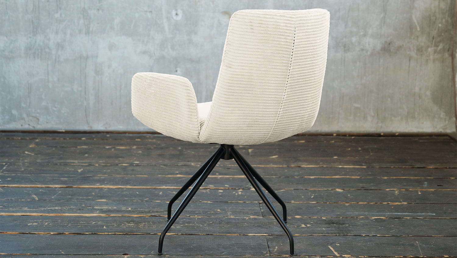 Der KAWOLA Esszimmerstuhl NEW CHARME ist nicht nur um ein Möbelstück, sondern ein wahres Design-Highlight, das in Ihrem Zuhause neue Akzente setzt. Der Stil der Serie NEW CHARME erinnert an die Sechziger Jahre: Der Rücken wurde aufwendig abgesteppt ohne Knöpfe; die Rückenlehne wurde an den beiden Seiten leicht nach vorne gewölbt und erinnert an die Form eines Ohrensessels; das Gestell aus Metall ist 360° drehbar. Zu der ausgefallenen Form des Stuhls NEW CHARME wurde hier der Bezug in angesagtem Cord-Stoff gewählt. Wer nicht nur einen Esszimmerstuhl sucht, sondern einen zeitlos-stylischen Trendsetter, liegt mit der Serie NEW CHARME von KAWOLA goldrichtig!