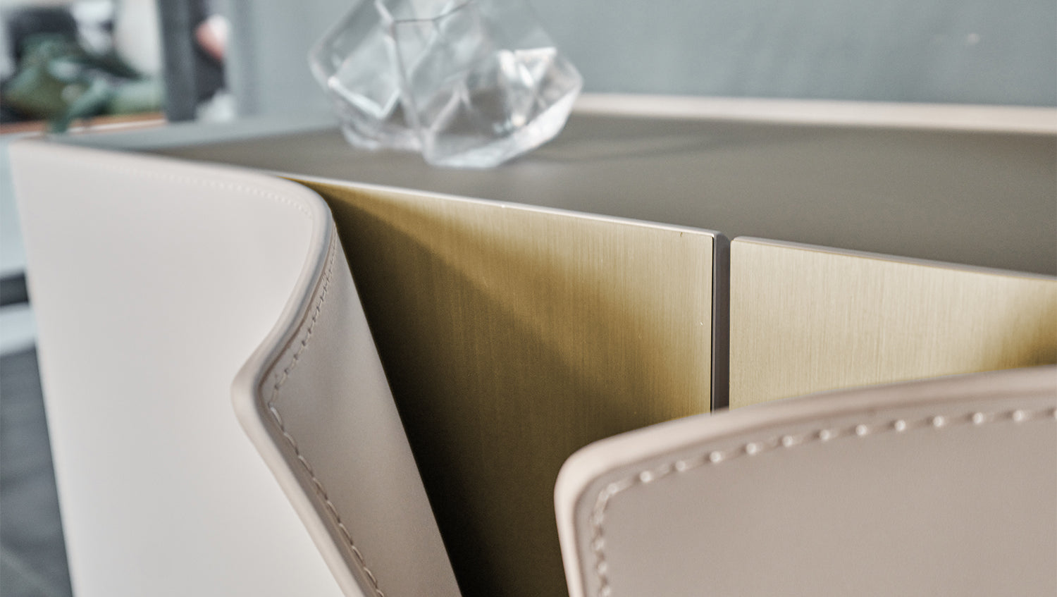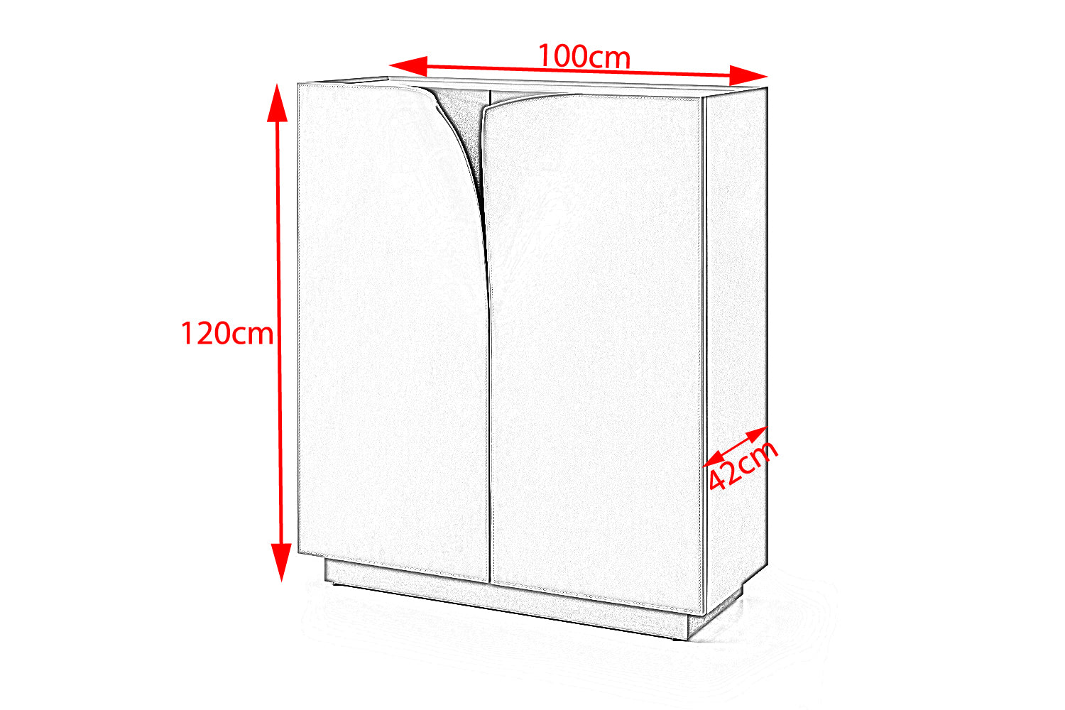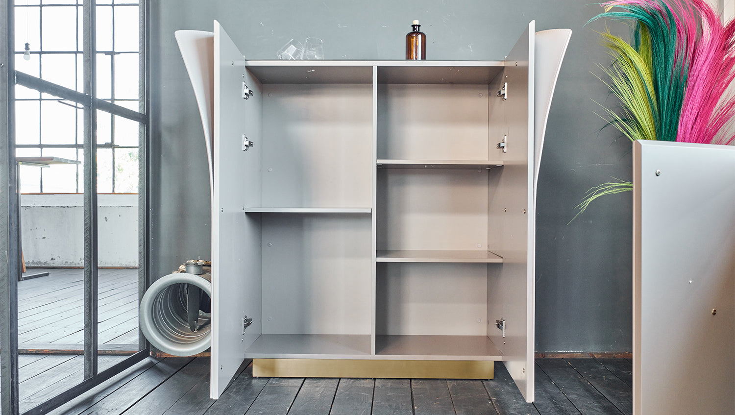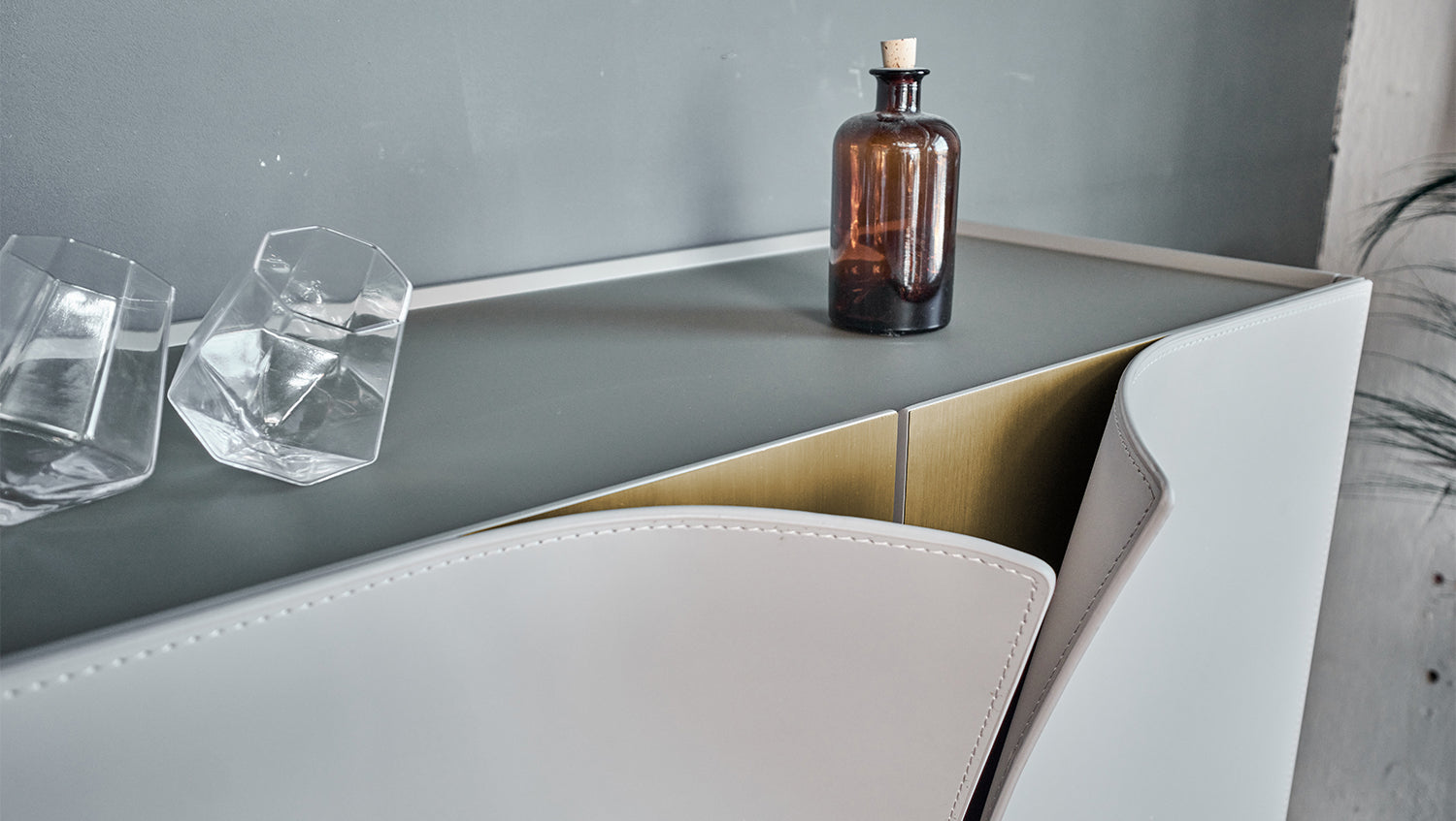 Das Highboard bietet großzügigen Stauraum für persönliche Gegenstände. Die fünf geräumigen Fächer ermöglichen eine organisierte Aufbewahrung, während die mit Kunstleder beschichtete Metallfront, leicht nach vorne gebogen an zwei Stellen, nicht nur als Griff dient, sondern auch ein raffiniertes Designelement ist.