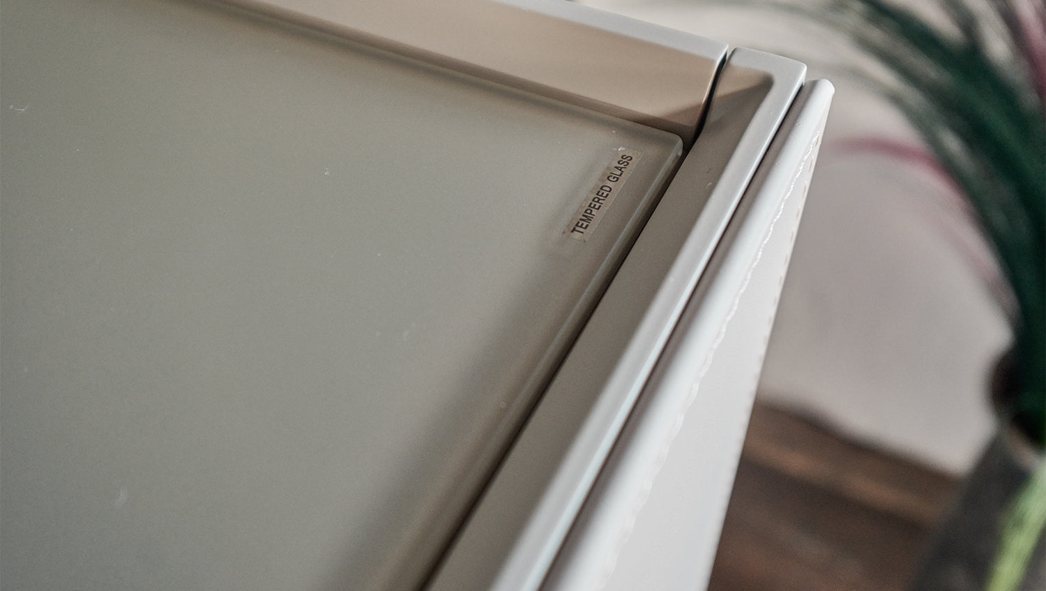 Die elegante Mattglas-Platte auf der Ablagefläche rundet das Gesamtbild ab und bietet eine robuste Oberfläche für Dekorationen. Der Sockel aus gebürstetem Edelstahl verleiht nicht nur zeitlose Eleganz, sondern auch Stabilität und Langlebigkeit.