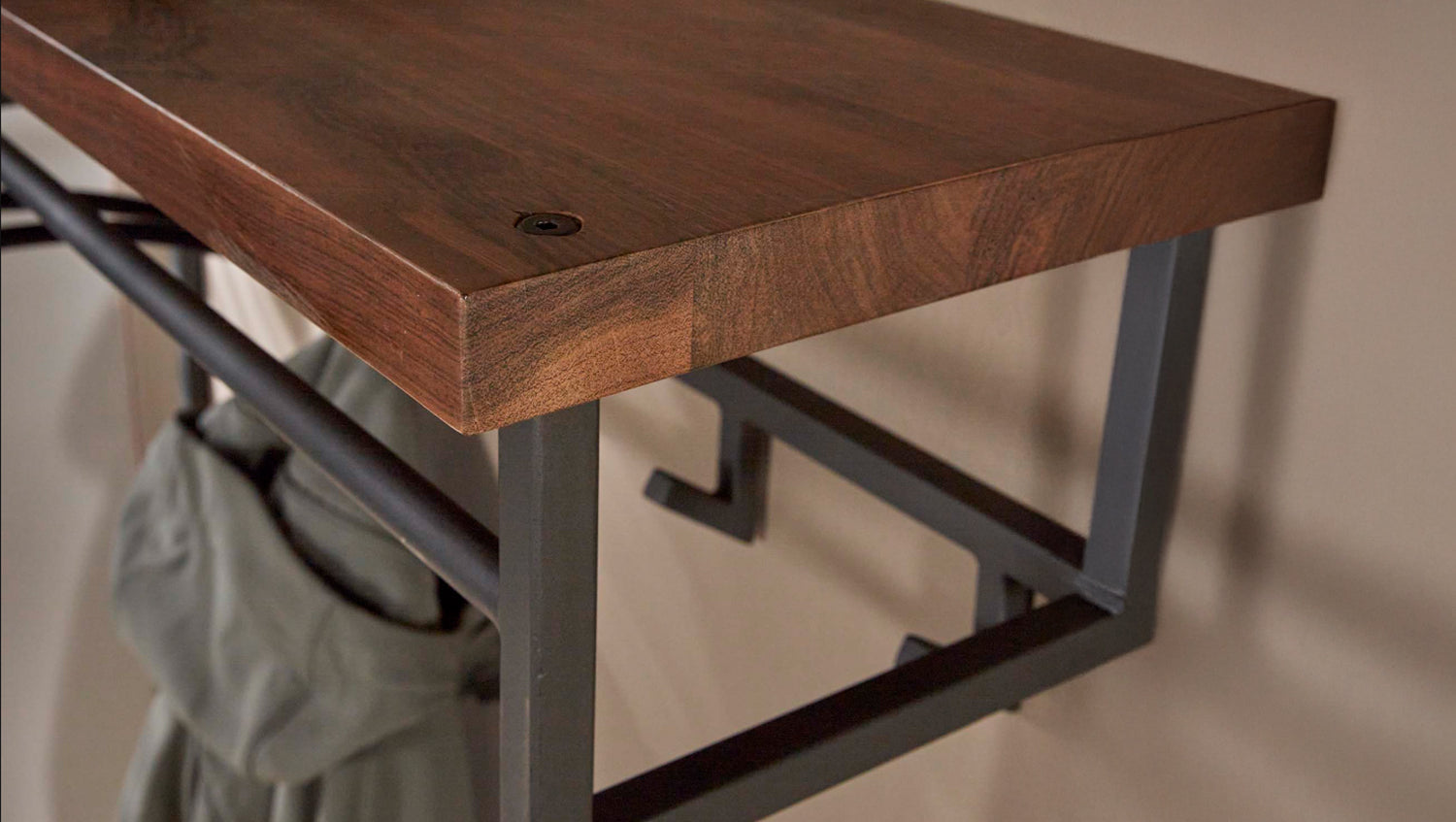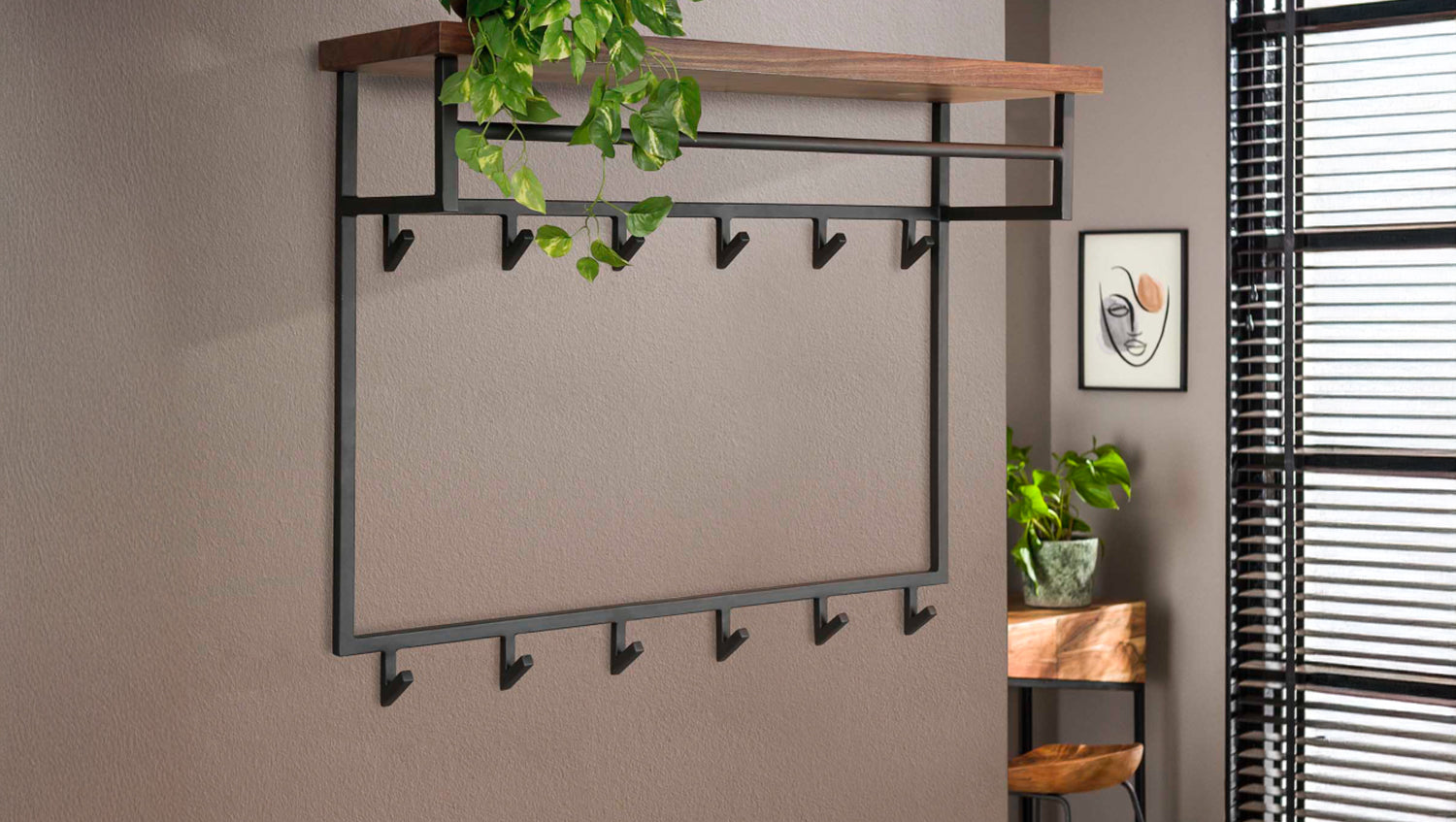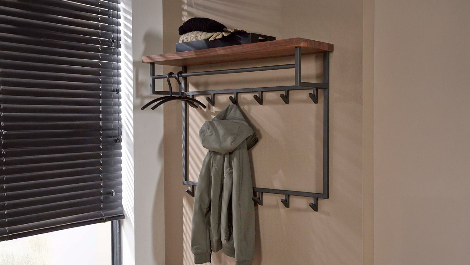 Die Wandgarderobe ADELIA von KAWOLA vereint elegantes Design mit Funktionalität. Der robuste Metallrahmen in dunkelgrauer Beschichtung sorgt für Stabilität, während die Hutablage aus Saja-Naturnussbaum eine natürliche Note verleiht. Mit 12 stabilen Haken bietet die Garderobe Platz für Mäntel, Jacken oder Taschen – wahlweise direkt am Haken oder auf einem Bügel. Dank der zwei Befestigungsösen an der Rückseite lässt sich die 100 cm breite, 80 cm hohe und 30 cm tiefe Wandgarderobe mühelos montieren. Perfekt für Flur, Diele oder Eingangsbereich, bietet ADELIA eine stilvolle Lösung für mehr Ordnung!