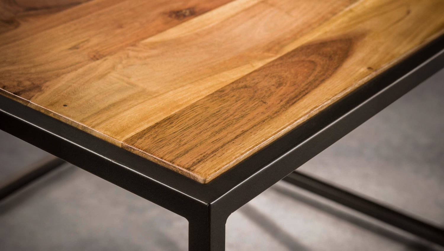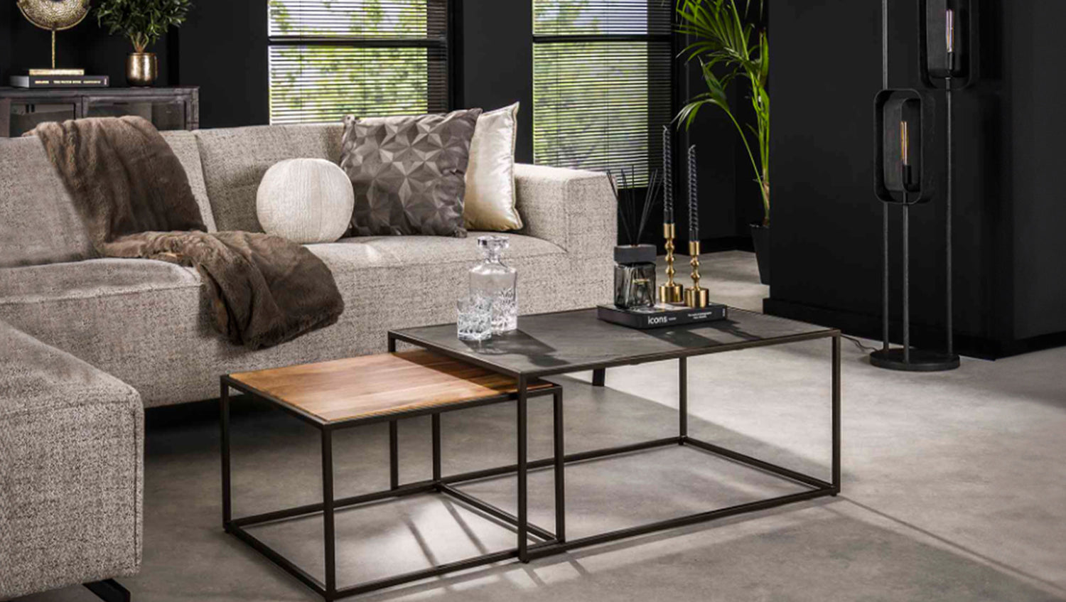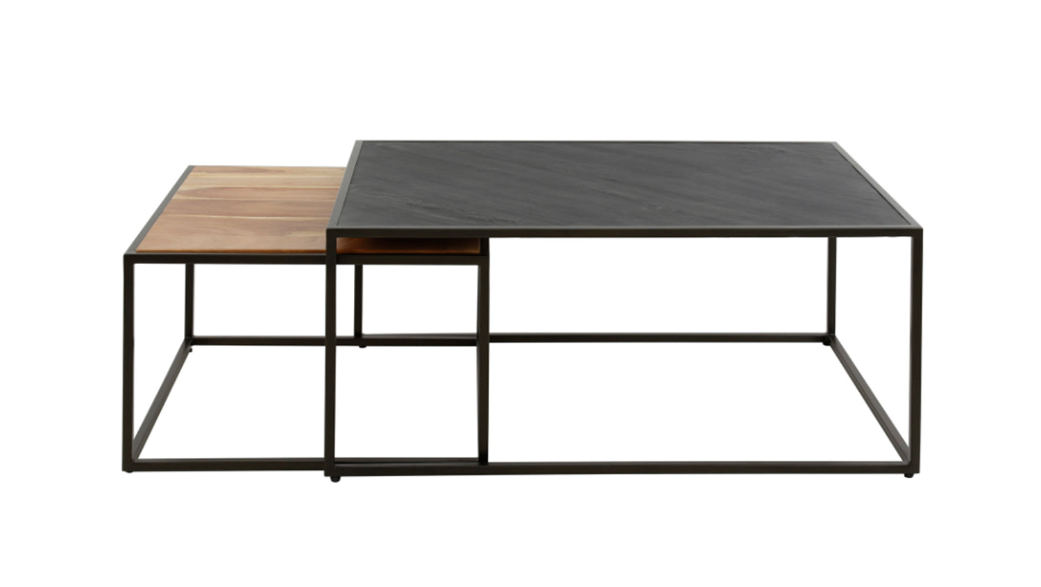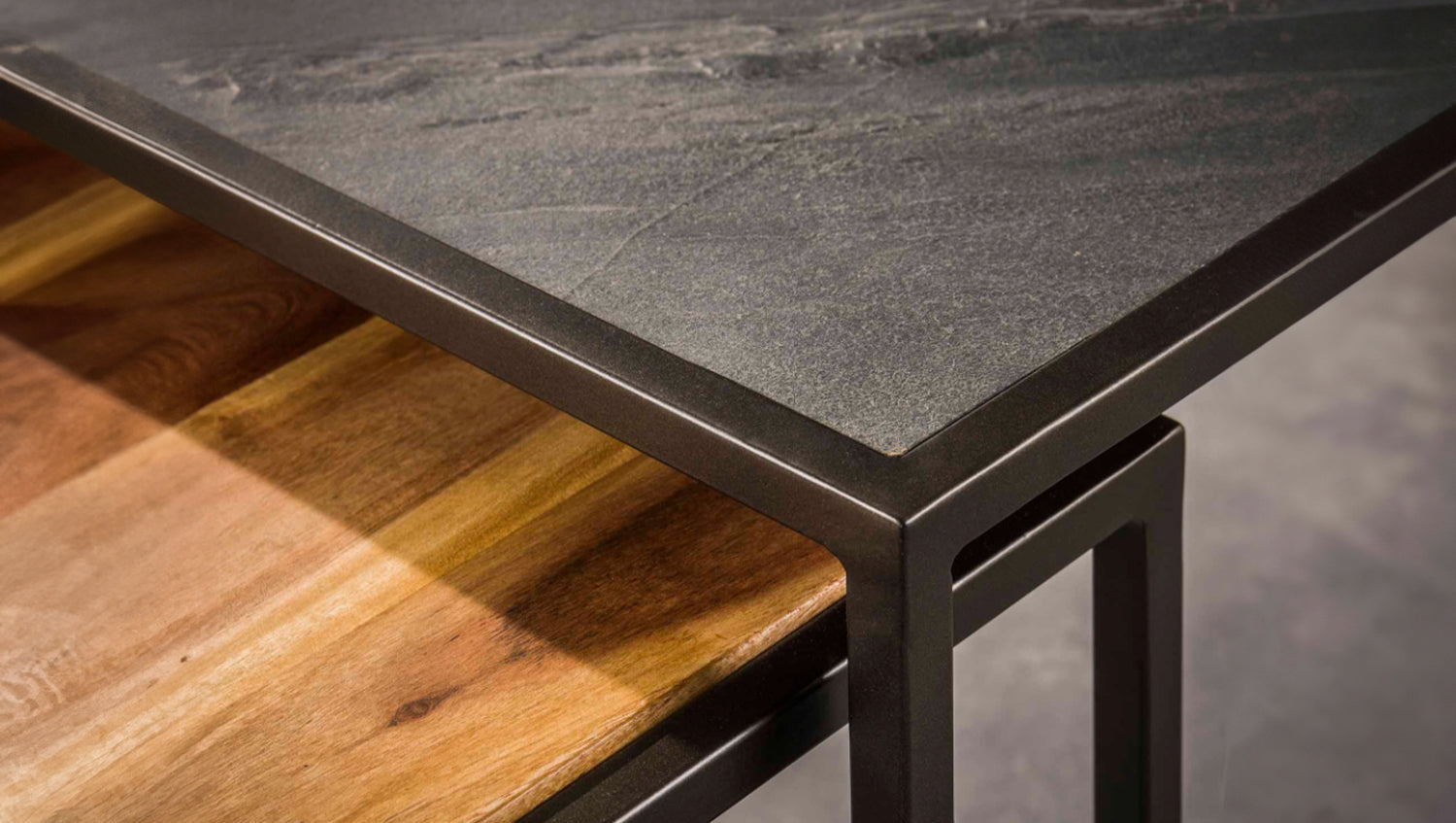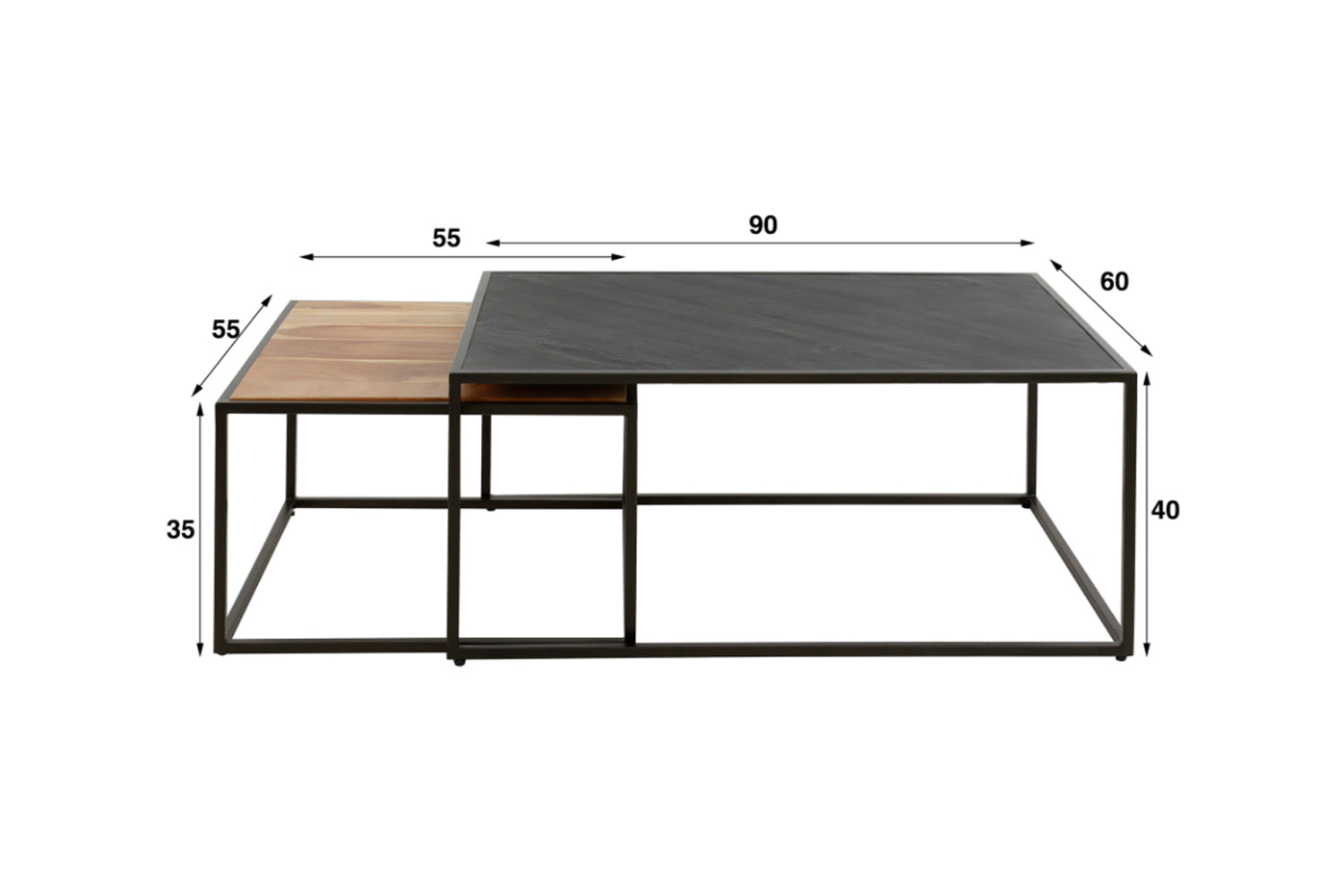 Das rechteckige Couchtisch-Set NUKA von KAWOLA besteht aus Akazienholz und Schiefer mit einem Metallgestell. Die Tische können nach Belieben zusammengeschoben werden. Das zeitlose Set passt zu jeder Einrichtung und besteht aus zwei Tischen. Der größere Tisch hat eine Fläche von 90 x 60 cm und eine Höhe von 40 cm, während der kleinere Tisch mit 55 x 55 cm und einer von Höhe von 35 cm perfekt darunter geschoben werden kann. Ob im Wohnzimmer, in der Lounge oder als stilvolle Ablage – das Couchtisch-Set NUKA passt in jedes Zuhause und setzt ein echtes Design-Statement.