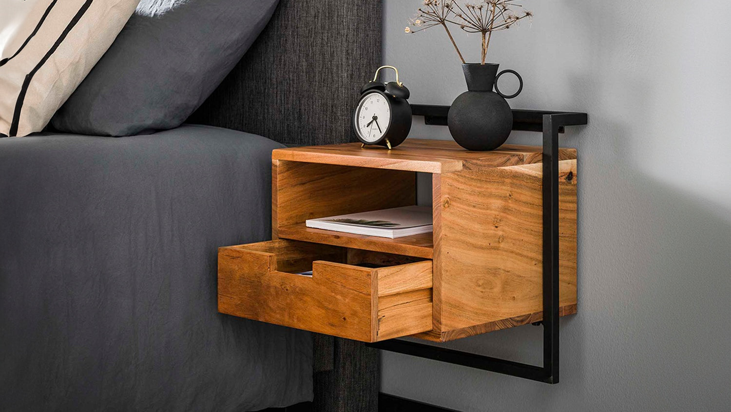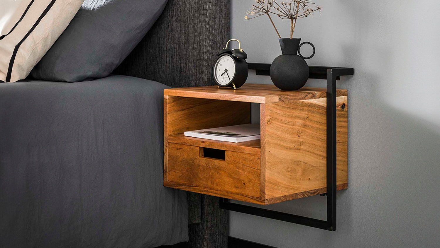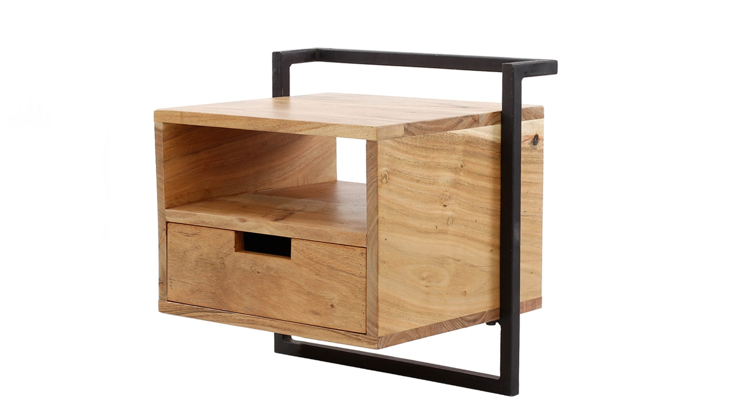 Der KAWOLA Nachttisch AIDY besticht durch modernes Design und hochwertige Materialien. Gefertigt aus massivem Akazienholz mit matt transparentem Lack, bringt er natürliche Eleganz in Ihr Schlafzimmer. Der Nachttisch verfügt über eine Schublade und ein offenes Fach. Der robuste Metallrahmen sorgt nicht nur für Stabilität, sondern auch für einen stilvollen, industriellen Look. Mithilfe einer stabilen Leiste mit drei Schraublöchern lässt sich der Nachttisch einfach und sicher an der Wand befestigen – für eine schwebende Optik und platzsparende Integration. Mit seinen Maßen von 44 x 35 x 45 cm bietet AIDY XL viel Stauraum und eignet sich ideal für Bücher, Deko oder Alltagsgegenstände. Der Nachttisch AIDY ist die perfekte Wahl für alle, die Funktionalität mit modernem Design und hochwertiger Verarbeitung verbinden möchten.