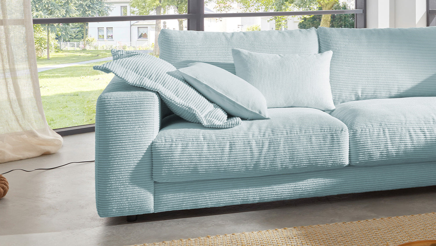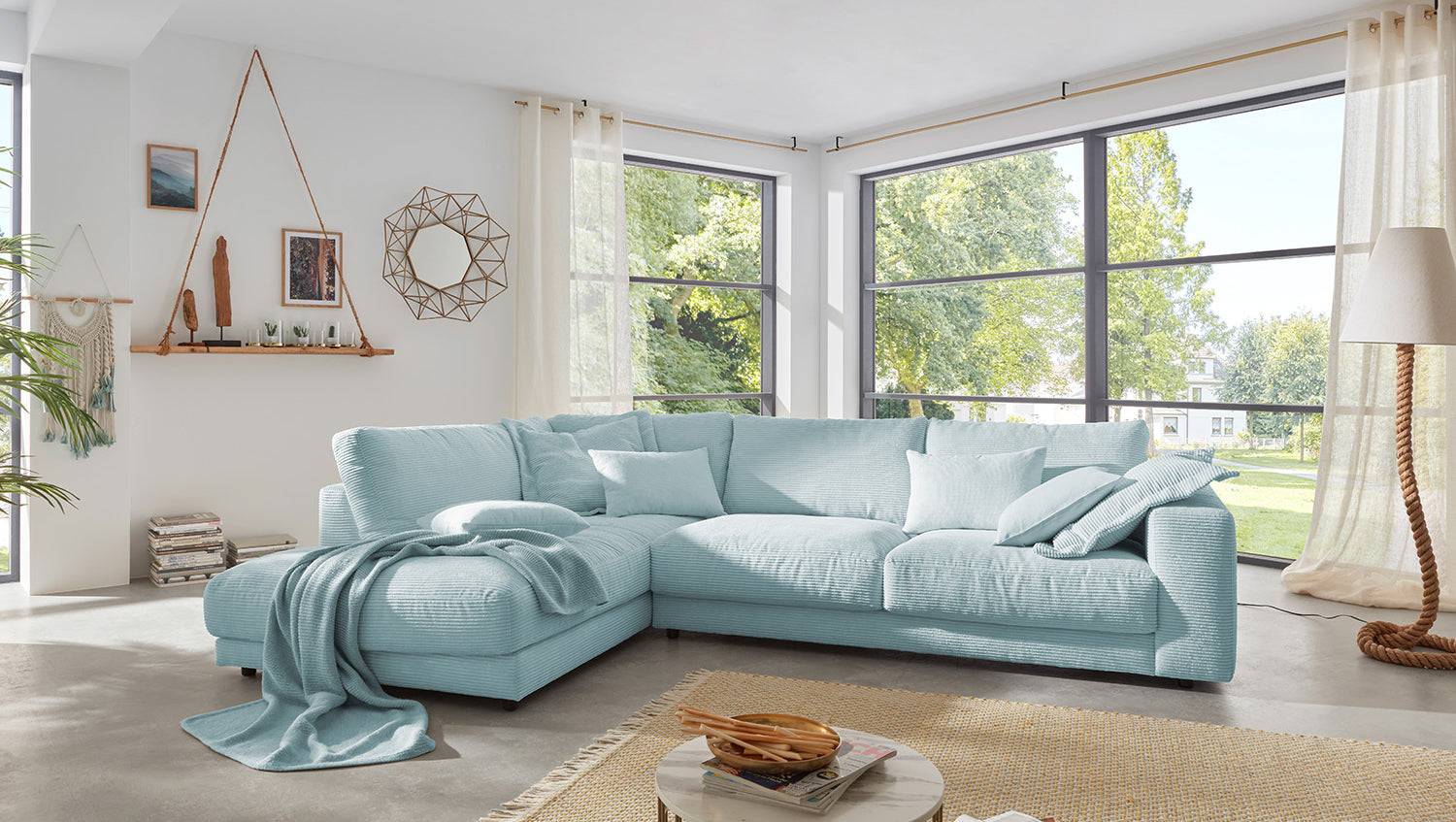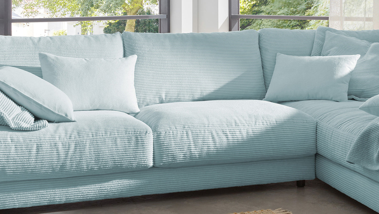 KAWOLA Sofa MADELINE Ecksofa Cord hellblau