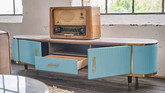 Mit seiner edlen Marmorplatte, der kunstlederbezogenen Front und feinen Edelstahl-Details vereint das Sideboard MARIA Retro-Charme mit moderner Eleganz. Ein echtes Designstück, das Stauraum schafft und gleichzeitig zum stilvollen Blickfang wird.