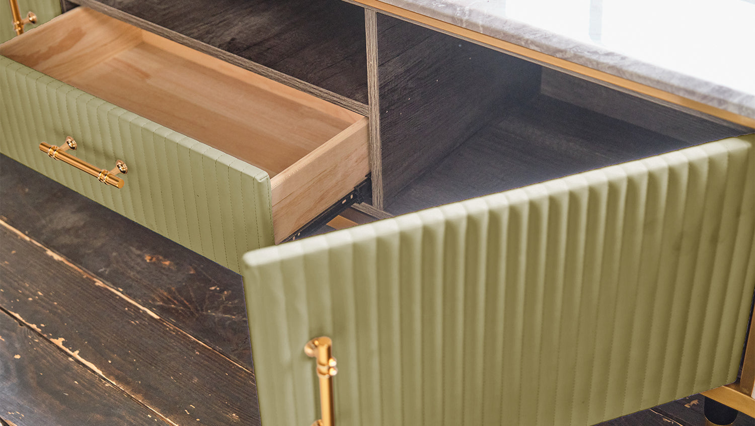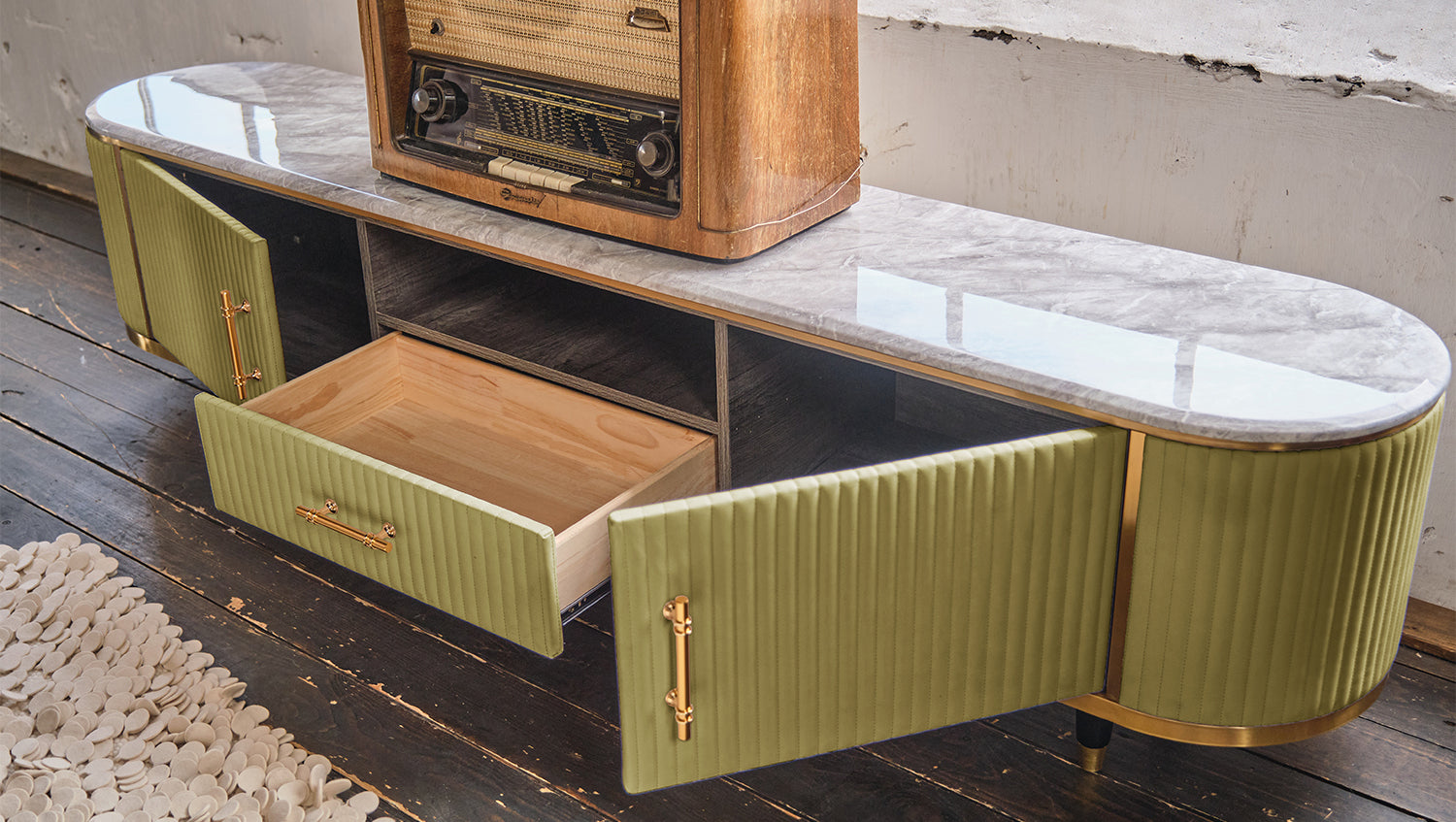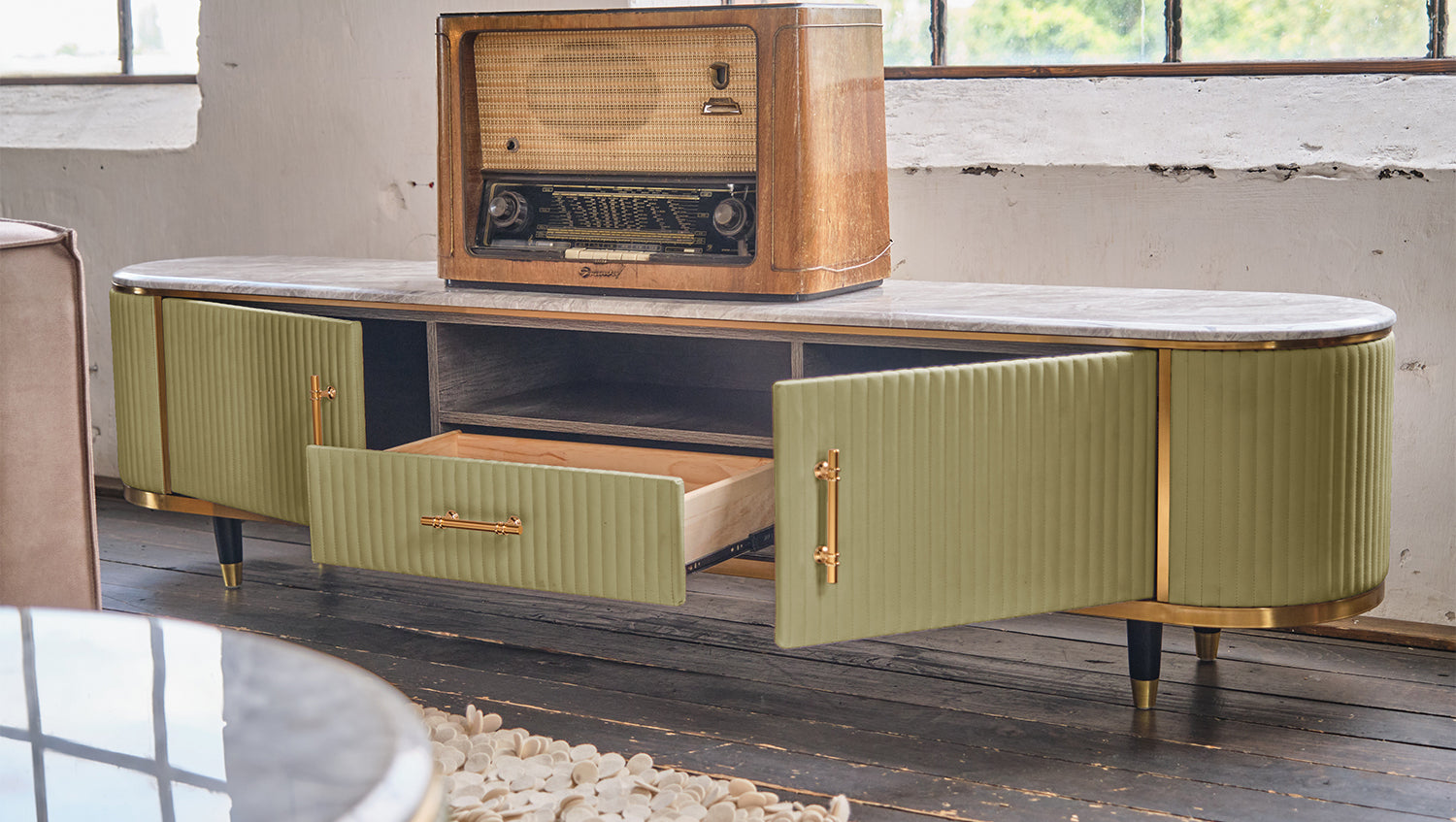 KAWOLA Lowboard MARIA TV-Bank Marmorplatte Kunstleder olivgrün