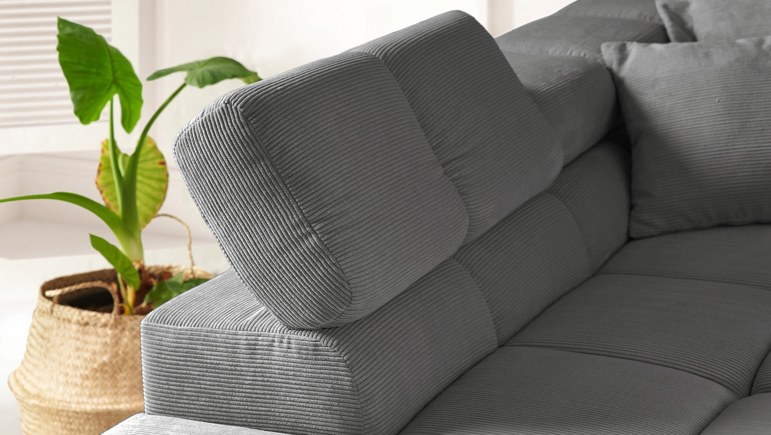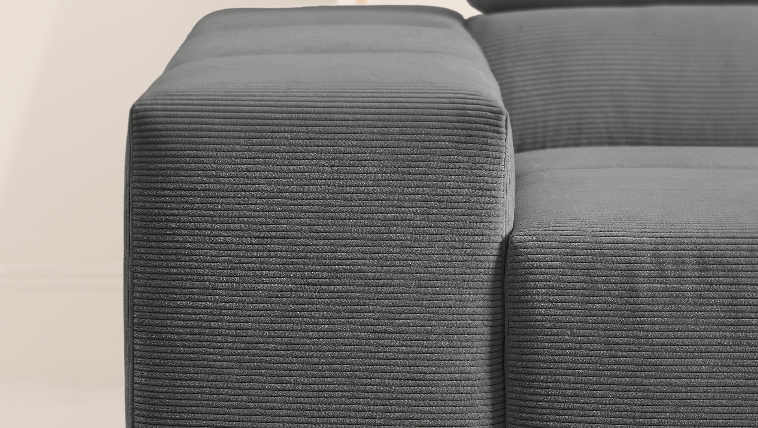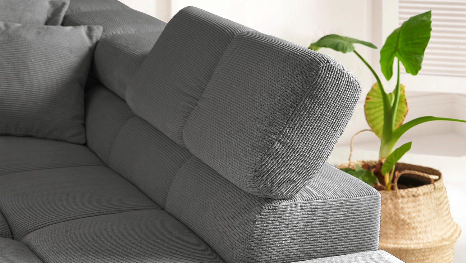 Das KAWOLA Ecksofa NEVADA verbindet moderne Designwelten mit zeitloser Eleganz und fügt sich nahtlos in jedes Interieur ein. Seine kubische Form und die unaufdringlichen Gleitfüße verleihen dem Sofa eine gewisse Leichtigkeit, die durch die quadratischen Absteppungen noch unterstrichen wird. Die Kopfstützen können ganz nach den individuellen Sitzvorlieben entweder hoch- oder heruntergeklappt werden. Die komplexe, 3-stufige Polsterung garantiert außerdem höchsten Sitzkomfort. Selbstverständlich wurde das Sofa auch auf der Rückseite mit dem filigranen Feincord-Stoff bezogen, sodass es auch frei in den Raum gestellt eine gute Figur macht. Egal zu welcher Gelegenheit - auf dem Sofa NEVADA findet jeder ein Plätzchen zum Entspannen!