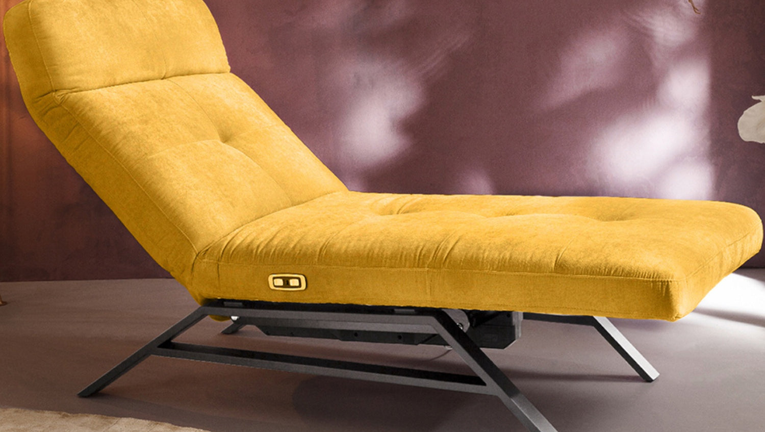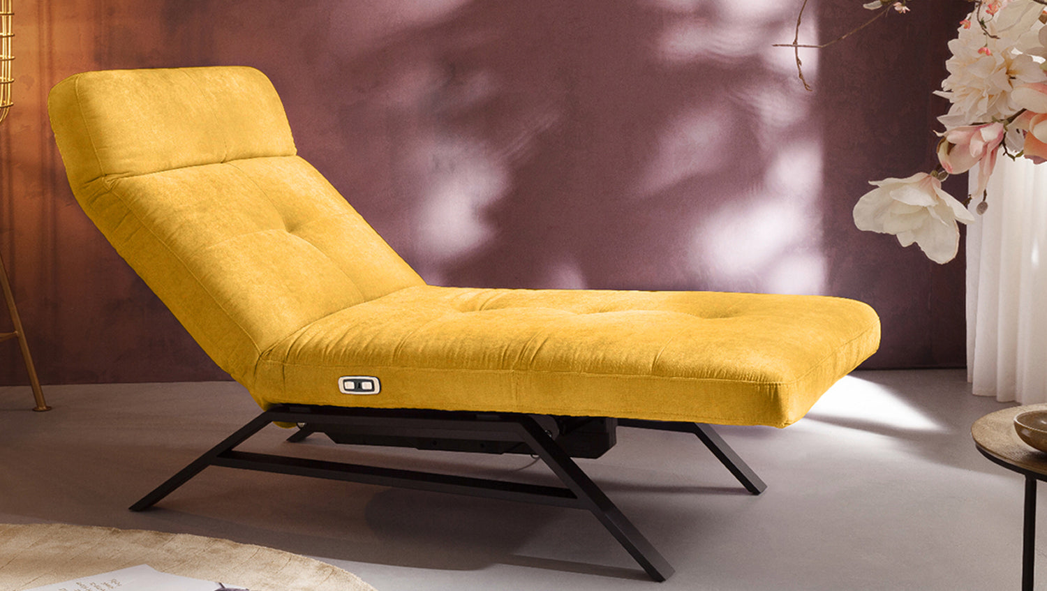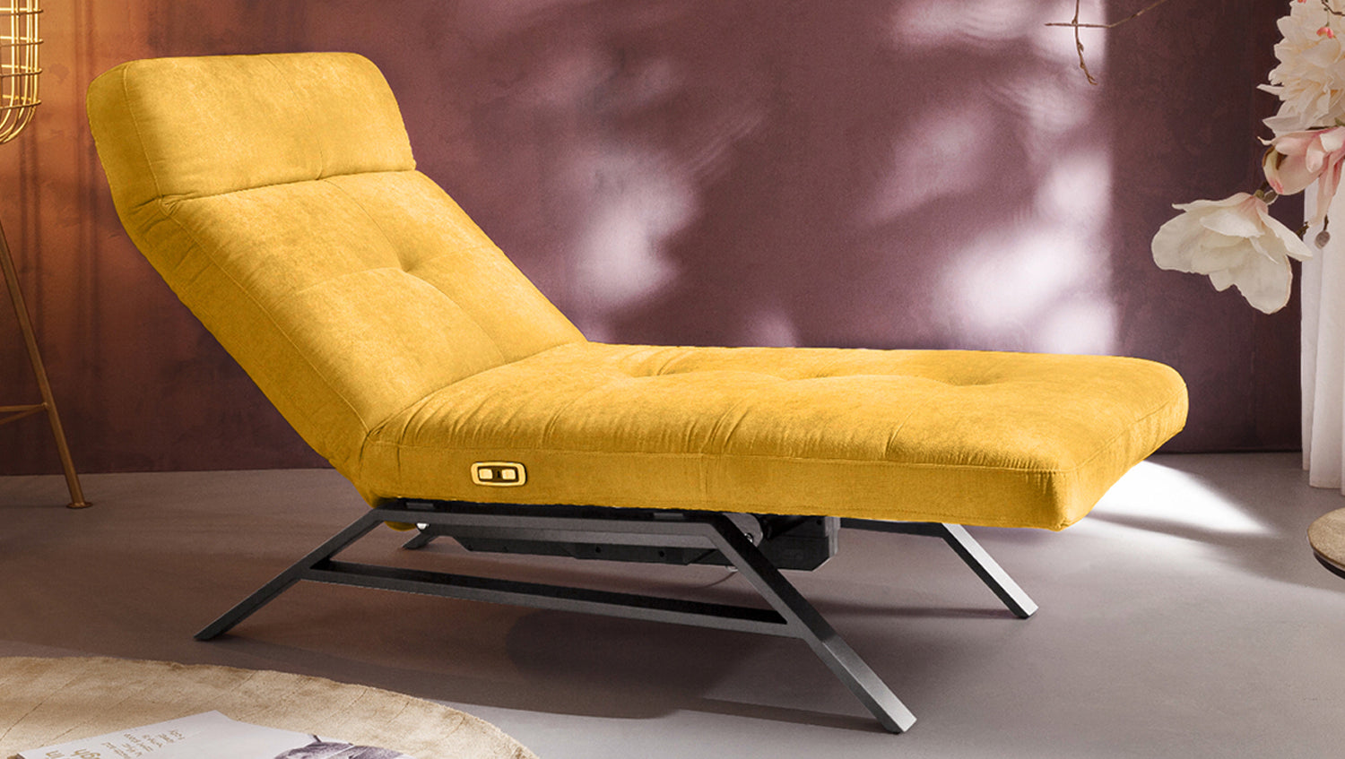 Die KAWOLA Liege AMERIVA ist eine wunderbare Kombination aus Design und Funktion. Die Metallkufen in schwarz matt bilden den Kontrast zum angesagten Velvet-Stoff. Allerdings ist die Relaxliege nicht nur rein optisch ein richtiges Highlight - auch die Funktionen betreffend bleibt hier kein Wunsch offen. Die motorische Funktion, die durch die Knöpfe auf der rechten Seite bedient werden kann, bietet eine stufenlos einstellbare Liegeposition. Zusätzlich verfügt die Liege über einen USB-Anschluss. Die Einsetzbarkeit dieses Möbelstücks ist so vielfältig wie seine Funktionen: Nicht nur im heimischen Wohnbereich, auch in der Lobby oder im Ruheraum macht die Relaxliege AMERIVA eine tolle Figur.
