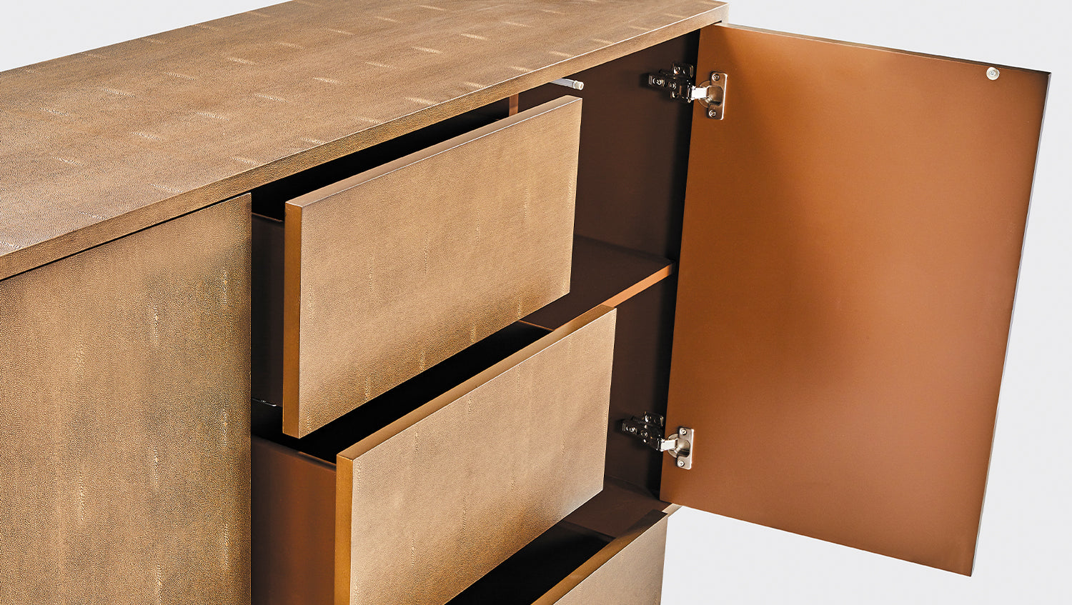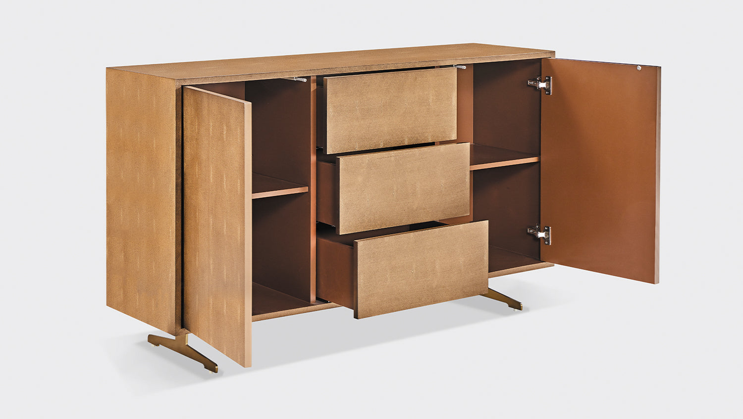 Das KAWOLA Sideboard GALA besticht durch seine elegante Kombination aus modernem Design und praktischer Funktionalität. Der Korpus, die Türen und die Schubladen sind stilvoll mit hochwertigem goldfarbenen Kunstleder bezogen, das dem Möbelstück eine luxuriöse Optik verleiht. Die zwei Türen und drei Schubladen bieten großzügigen Stauraum und lassen sich dank des komfortablen Push-to-Open-Mechanismus mühelos öffnen. Die goldfarbenen Kufenfüße aus gebürstetem Edelstahl sorgen für einen modernen, zeitlosen Look und bieten gleichzeitig stabile Standfestigkeit. Variabel einsetzbare Einlegeböden ermöglichen eine flexible Nutzung des Innenraums und passen sich Ihren Bedürfnissen an. Das Sideboard GALA von KAWOLA fügt sich perfekt in jedes Wohnambiente ein und ist ideal für Liebhaber von schlichten, aber dennoch eleganten Möbelstücken. Entdecken Sie die perfekte Kombination aus Design und Funktionalität mit dem Sideboard GALA!