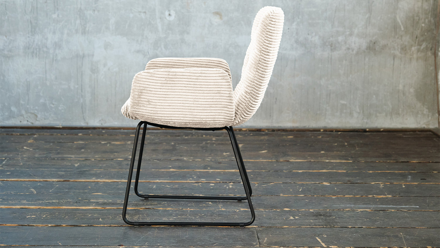 Der KAWOLA Esszimmerstuhl NEW CHARME ist nicht nur um ein Möbelstück, sondern ein wahres Design-Highlight, das in Ihrem Zuhause neue Akzente setzt. Der Stil der Serie NEW CHARME erinnert an die Sechziger Jahre: Der Rücken wurde aufwendig abgesteppt ohne Knöpfe; die Rückenlehne wurde an den beiden Seiten leicht nach vorne gewölbt und erinnert an die Form eines Ohrensessels; die Kufenfüße aus Metall sind pulverbeschichtet. Zu der ausgefallenen Form des Stuhls NEW CHARME wurde hier der Bezug in angesagtem Cord-Stoff gewählt. Wer nicht nur einen Esszimmerstuhl sucht, sondern einen zeitlos-stylischen Trendsetter, liegt mit der Serie NEW CHARME von KAWOLA goldrichtig!