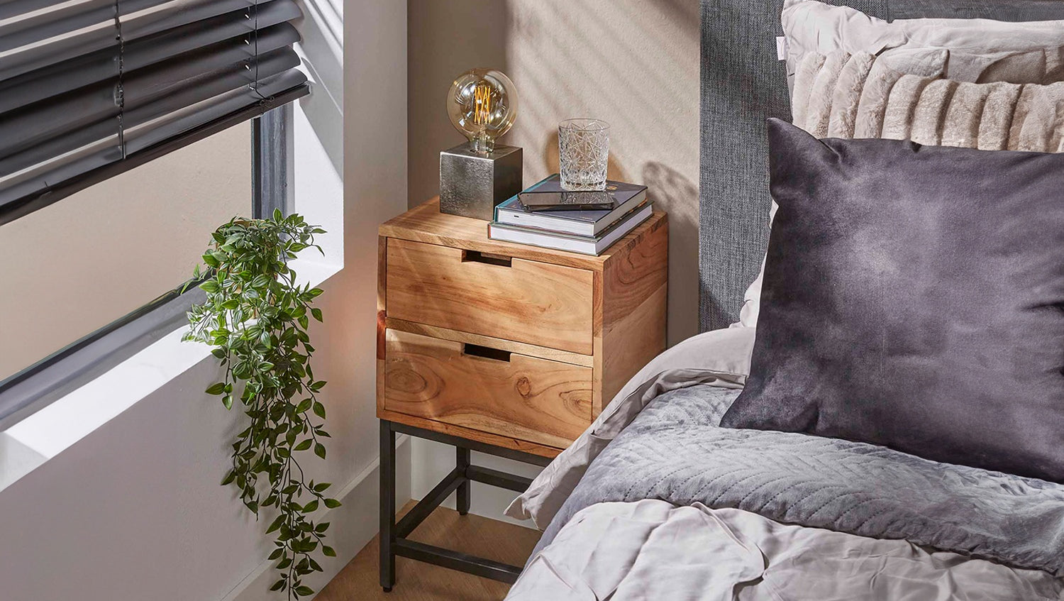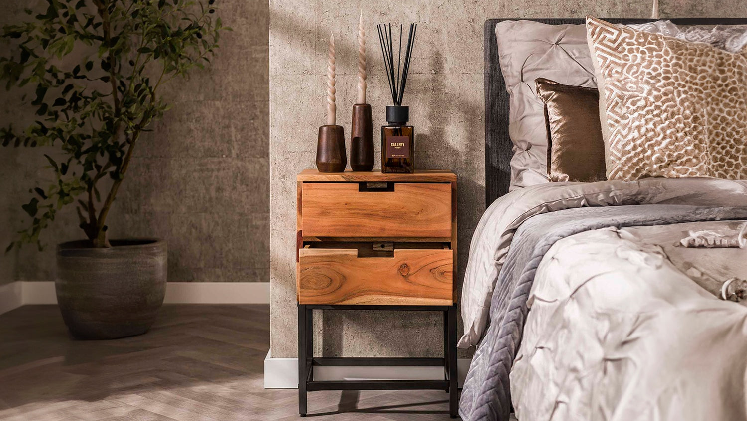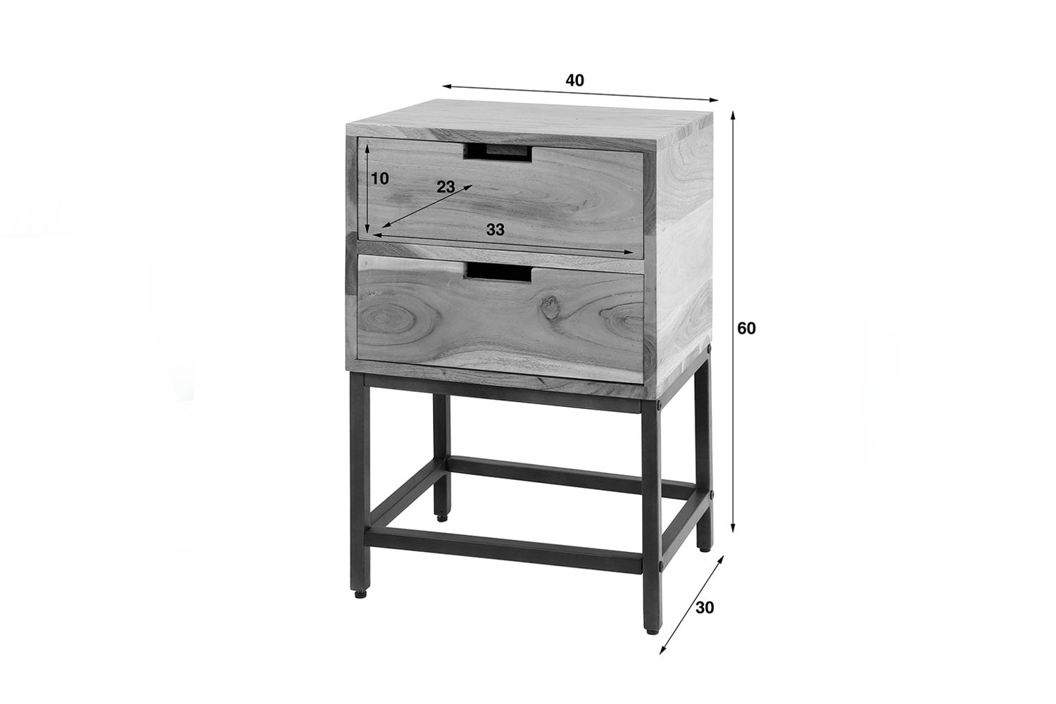 Der Nachttisch FATY von KAWOLA vereint modernes Design mit natürlicher Eleganz. Er ist aus Akazienholz gefertigt und mit einem matten, transparenten Lack versehen, der die natürliche Optik des Holzes betont. Der Nachttisch verfügt über zwei geräumige Schubladen und einen Metallrahmen, der für ein modernes und elegantes Aussehen sorgt. Mit seinen kompakten Maßen von 40 x 30 cm und einer Höhe von 60 cm ist er die ideale Lösung für kleinere Räume. Der Nachttisch FATY ist nicht nur funktional, sondern auch ein echter Blickfang – perfekt für moderne, minimalistische oder rustikale Einrichtungen. Setzen Sie stilvolle Akzente mit diesem platzsparenden Nachttisch aus Akazienholz!