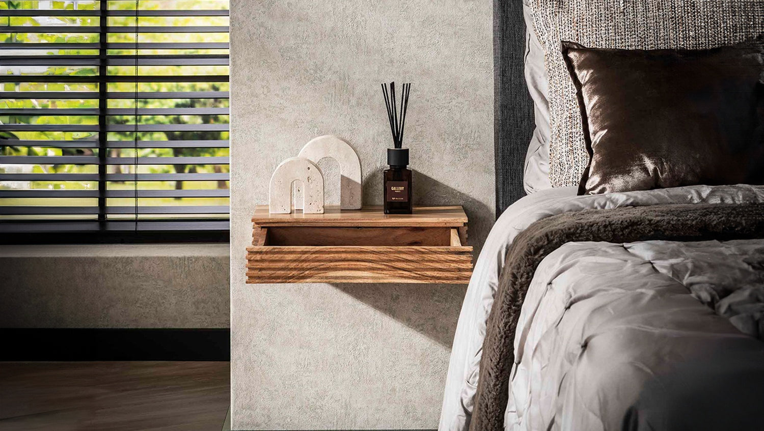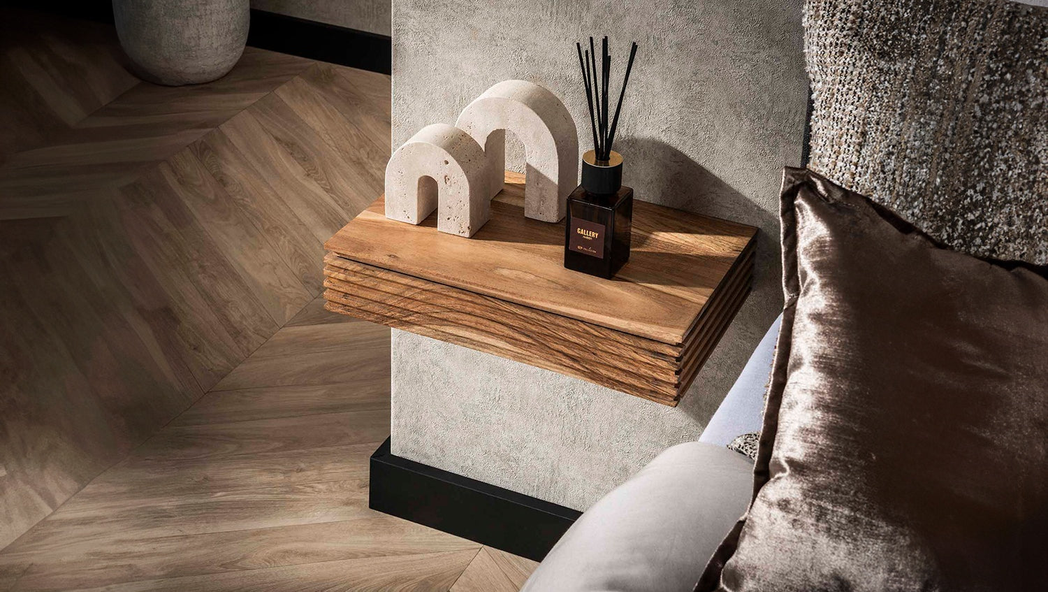Das KAWOLA Nachttisch-Set FIRU XL, bestehend aus zwei Tischen, überzeugt mit stilvollem Design und hochwertiger Verarbeitung. Gefertigt aus massivem Akazienholz mit markantem Wellenmuster und mattem, transparentem Lack, bringt dieses Wand-Nachttisch-Set natürliche Eleganz in Ihr Schlafzimmer. Die schwebende Optik entsteht durch die einfache Wandmontage mit nur zwei Schrauben – ideal für moderne, platzsparende Raumkonzepte. Mit kompakten Maßen von 40 x 25 x 8 cm eignet sich das Set perfekt als Ablagefläche für Bücher, Handy oder Deko. Die edle Holzstruktur und das minimalistische Design machen den Wandnachttisch FIRU XL zu einem funktionalen Highlight in jedem Schlafzimmer. Optimal für kleine Räume, Boxspringbetten oder als stilvolle Alternative zur klassischen Nachtkommode.