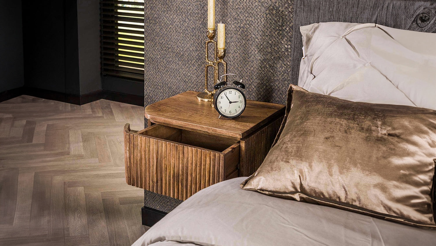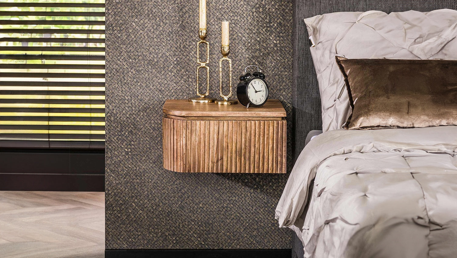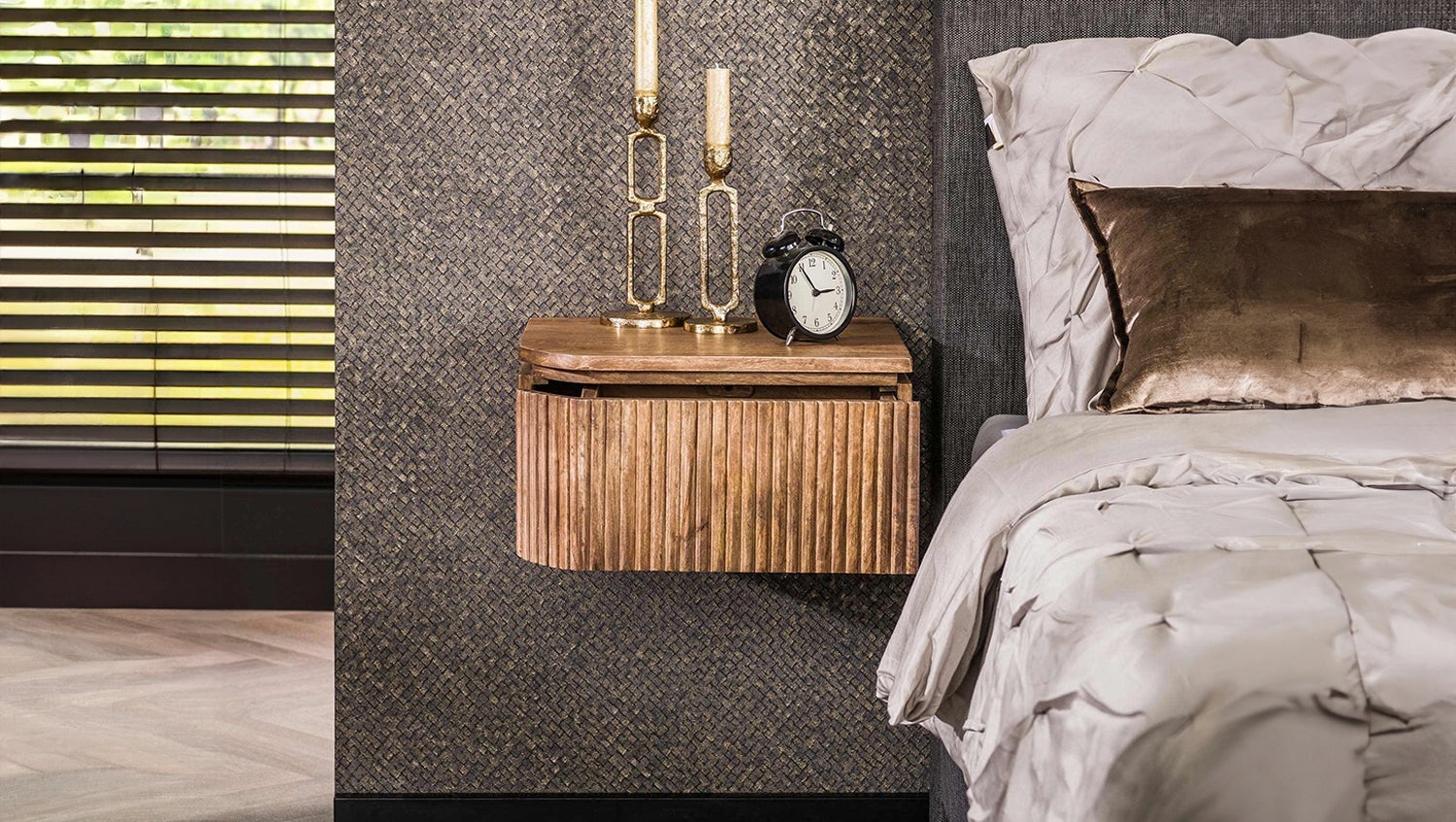 Das KAWOLA Nachttisch-Set HEVE, bestehend aus zwei Tischen, überzeugt mit modernem Design und nachhaltigen Materialien. Gefertigt aus hochwertigem Mangoholz mit sandfarbenem Finish, bringen sie natürliche Eleganz in Ihr Schlafzimmer. Das stilvolle Wellendesign verleiht den Möbelstücken eine besondere Optik. Jeweils eine praktische Schublade bietet Platz für persönliche Gegenstände wie Bücher, Brillen oder Handy. Dank der Wandmontage über eine stabile Leiste mit drei Schraublöchern wirken die Nachttische HEVE, in einer linken und einer rechten Variante, schwebend und sorgen für ein luftiges, platzsparendes Raumgefühl. Mit kompakten Maßen von 40 x 35 x 20 cm sind sie ideal für moderne Schlafzimmer, kleine Räume oder als stilvolle Alternativen zur klassischen Nachtkommode. Das HEVE Wandnachttisch-Set vereint Funktionalität, Design und Nachhaltigkeit – perfekt für alle, die Wert auf Qualität und Ästhetik legen.