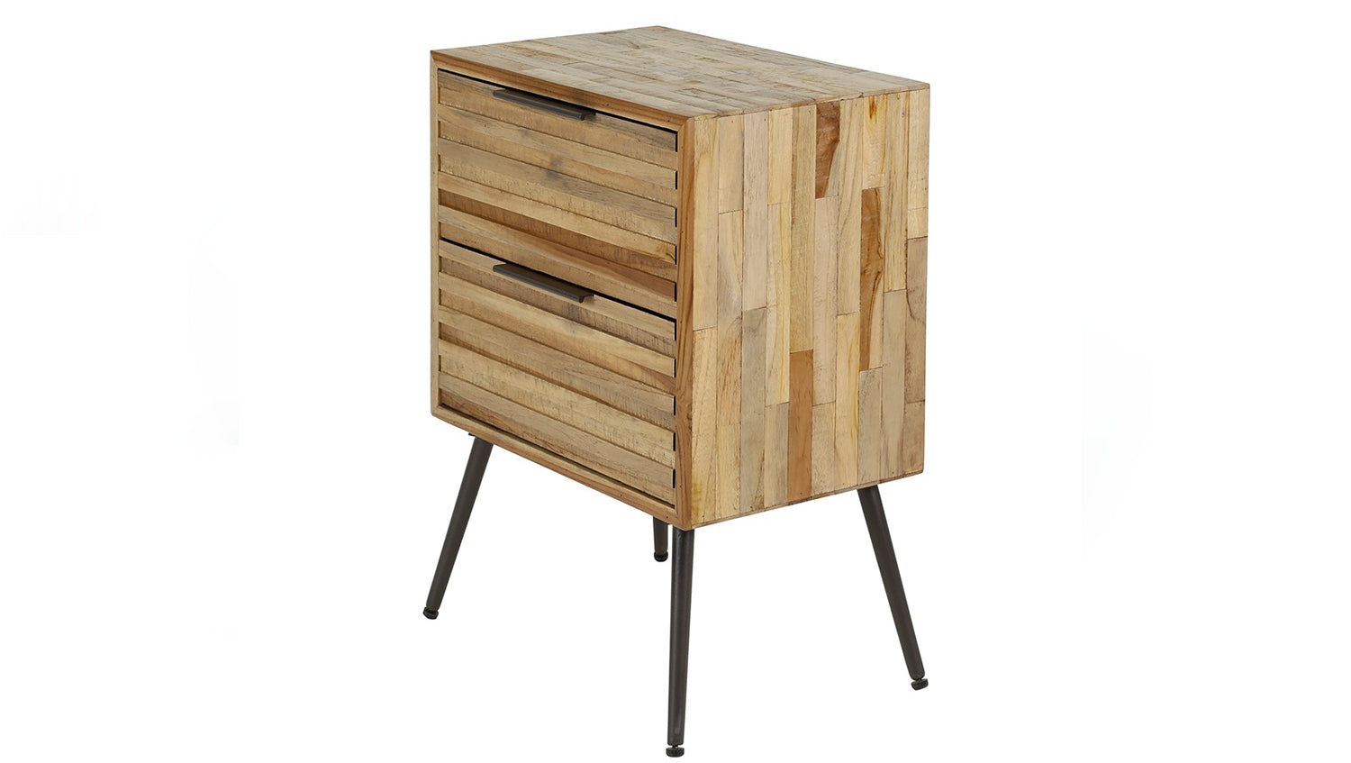 Der KAWOLA Nachttisch TICAR vereint rustikalen Charme mit modernem Stil. Gefertigt aus verwittertem, in Streifen verlegtem Teakholz, besticht er durch seine natürliche, einzigartige Maserung und langlebige Qualität. Für die Fronten der Schubladen wurden Leisten aus dem gleichen Holz verwendet. Der Nachttisch verfügt über zwei Schubladen, die innen mit glattem Holz in einem dunkelgrauen Farbton versehen sind. Die konischen Metallbeine setzen einen eleganten Akzent und verleihen dem Nachttisch eine leichte, filigrane Optik. Mit den Maßen 45 x 30 x 60 cm ist TICAR vielseitig einsetzbar und passt perfekt in moderne sowie klassische Wohnräume. Der Nachttisch TICAR überzeugt durch hochwertige Materialien, funktionales Design und eine zeitlose Ästhetik – ideal für ein gemütliches und stilvolles Schlafzimmer.