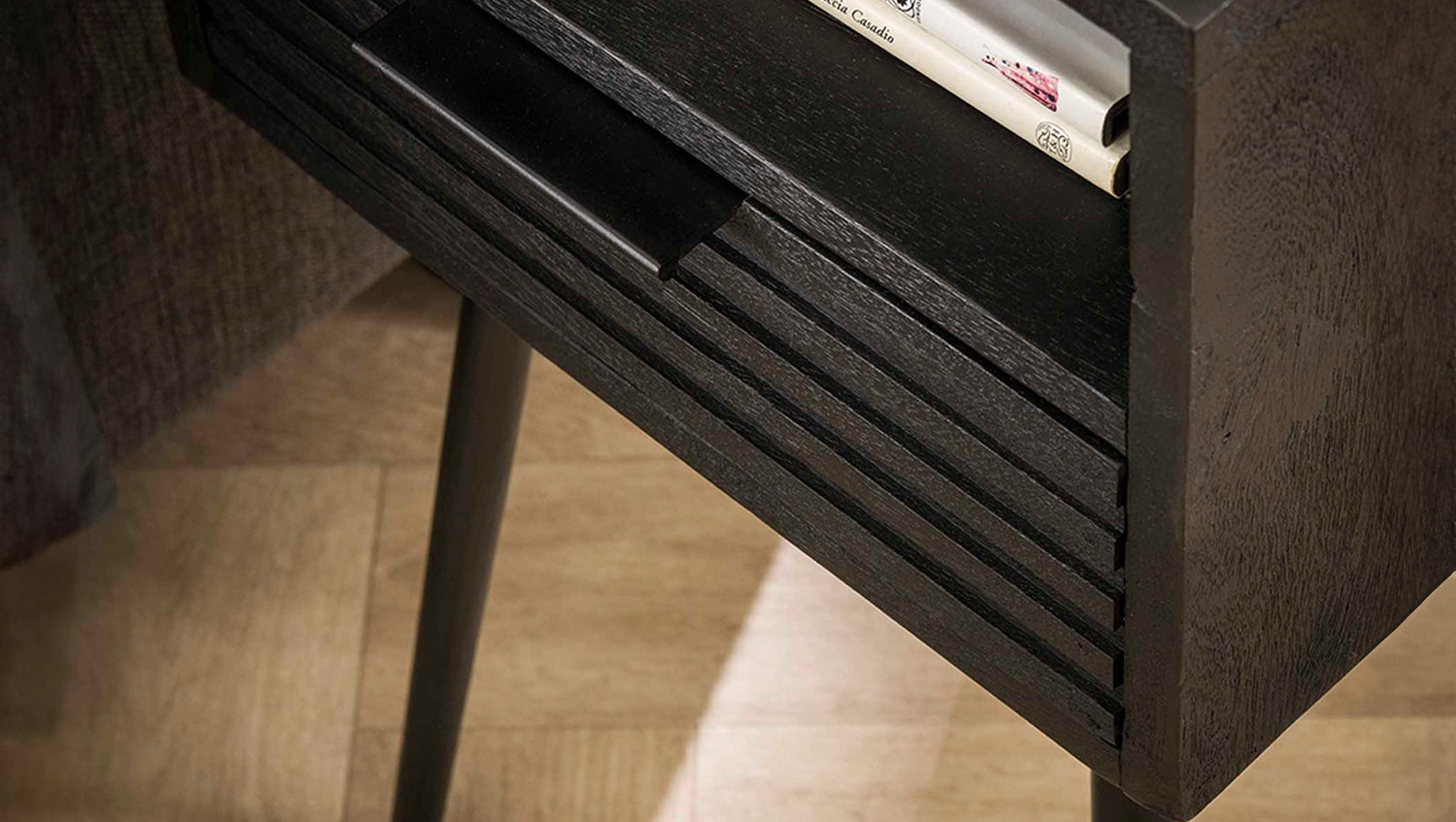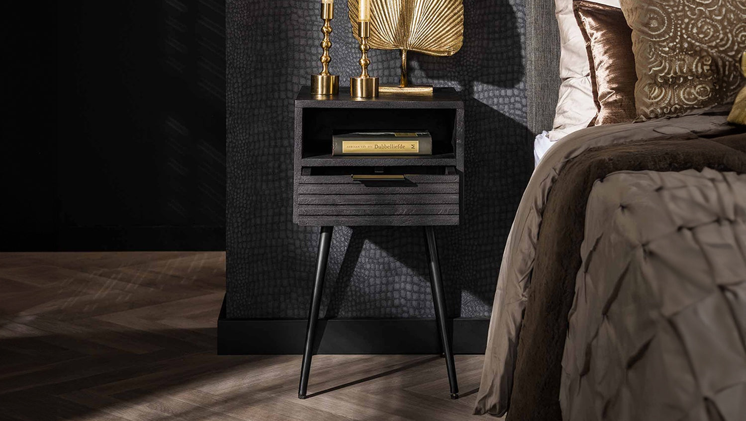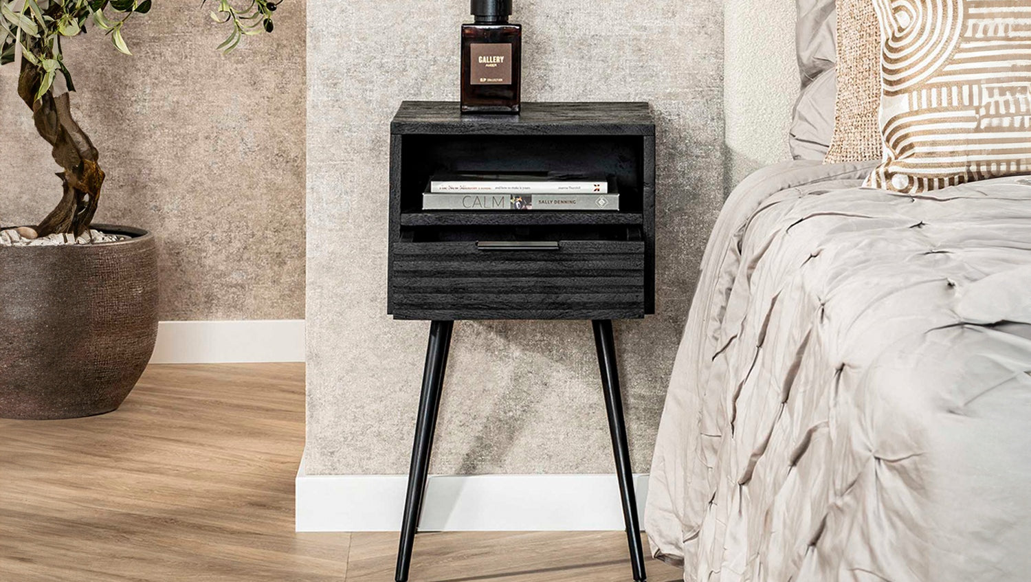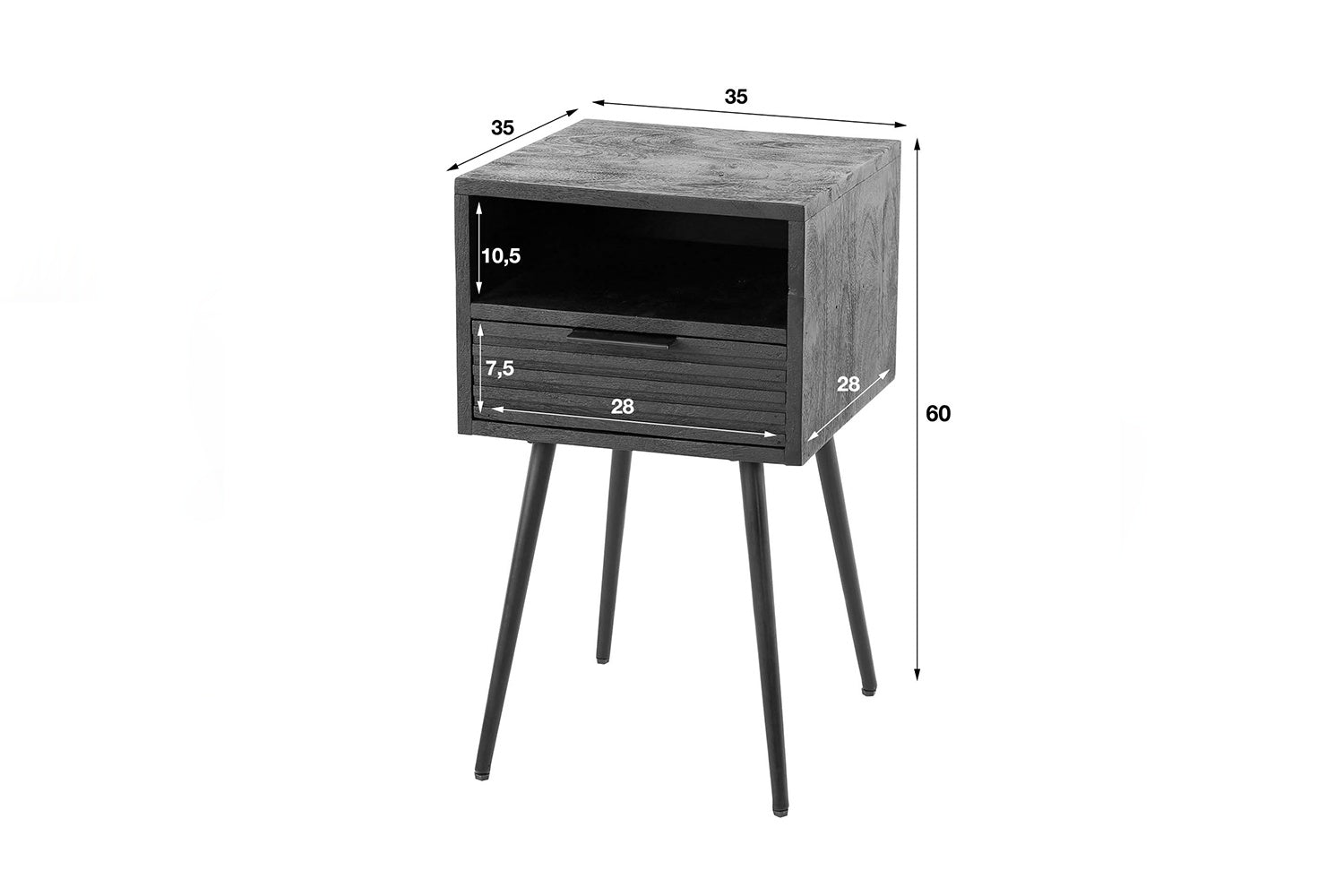 Der KAWOLA Nachttisch MIENA überzeugt mit modernem Design und hochwertiger Verarbeitung. Gefertigt aus Mangoholz mit schwarzem Finish, besticht er durch seine glatte Oberfläche, die die natürliche Holzmaserung besonders schön zur Geltung bringt. Der stabile Metallrahmen verleiht dem Nachttisch einen industriellen Touch und sorgt für langlebige Stabilität. MIENA verfügt über eine praktische Schublade sowie ein offenes Fach, die ausreichend Stauraum für Bücher, Handy oder persönliche Gegenstände bieten. Mit den Maßen 55 x 35 x 60 cm passt dieser stilvolle Nachttisch perfekt in moderne Schlafzimmer und Wohnbereiche. Der Nachttisch MIENA verbindet Ästhetik, Funktionalität und Qualität – ideal für ein stilvolles und organisiertes Ambiente.
