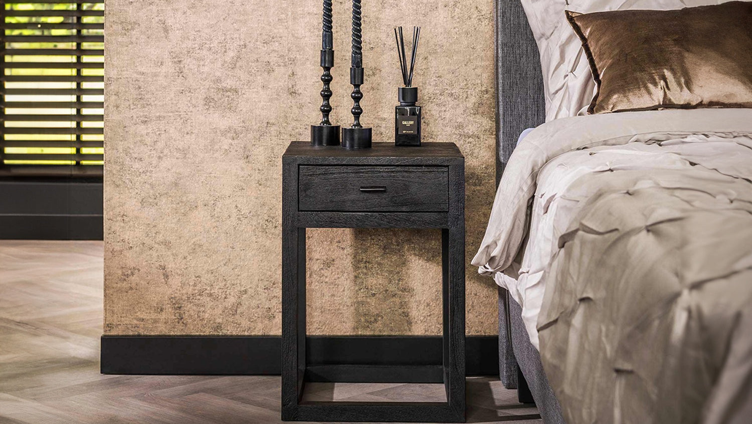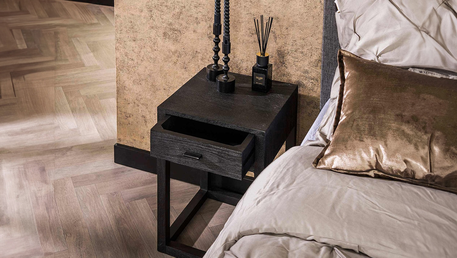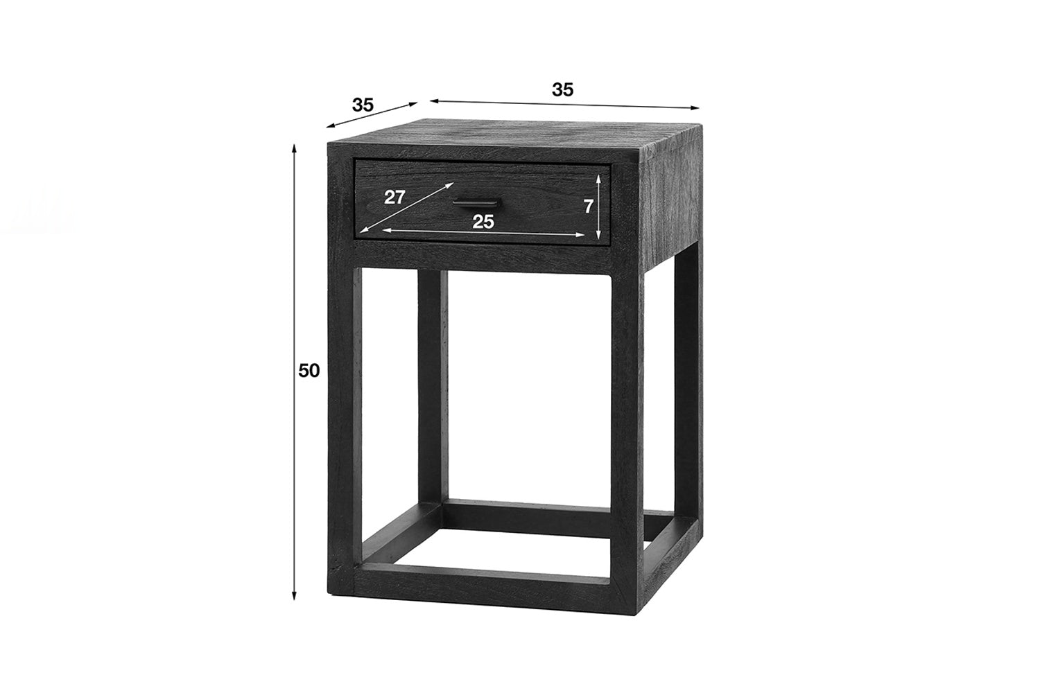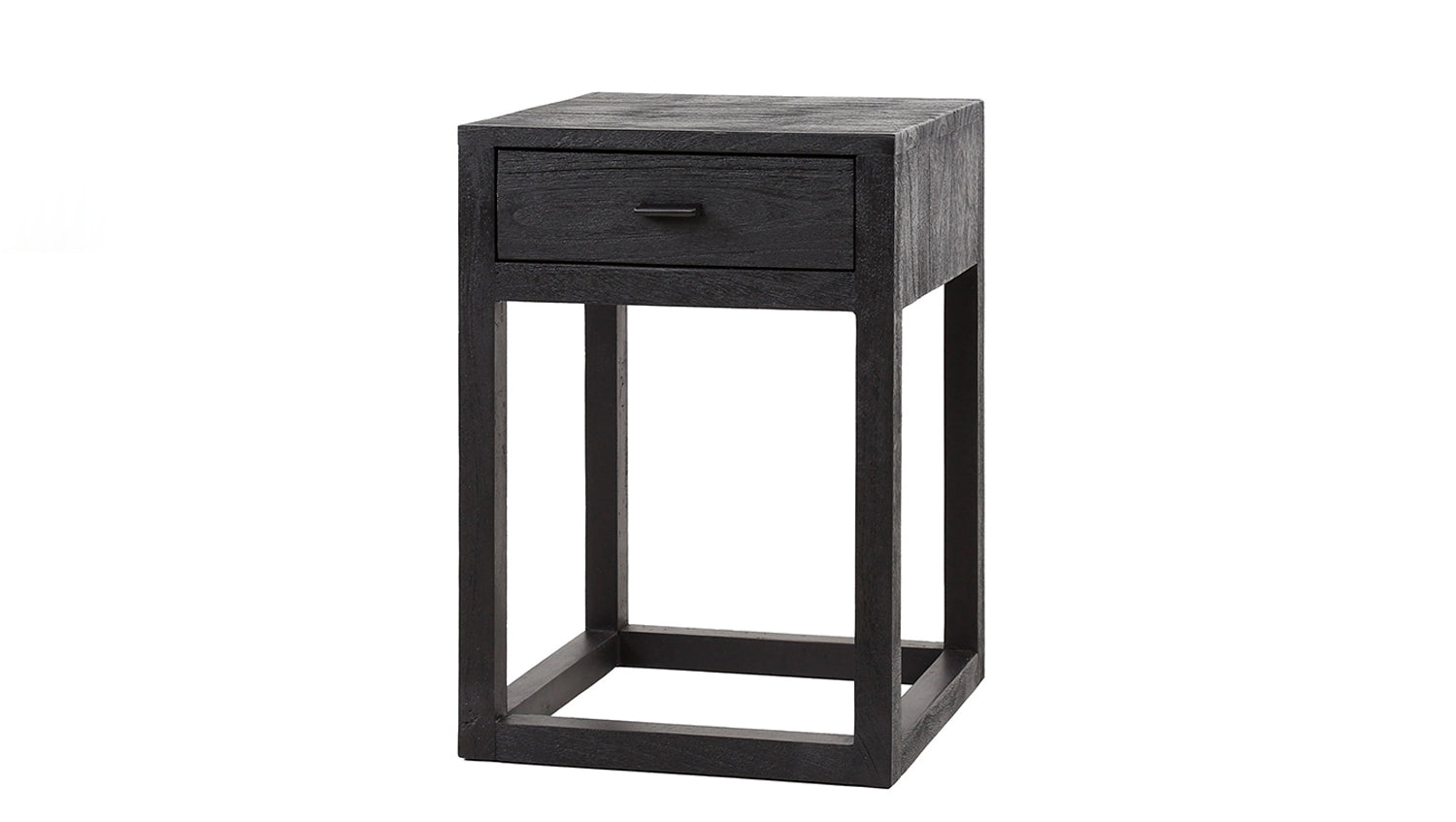 Der KAWOLA Nachttisch GUNAR besticht durch modernes Design und hochwertige Materialien. Gefertigt aus Mangoholz mit schwarzem Finish und umrahmt von einem eleganten Holzrahmen, vereint er natürliche Ästhetik mit zeitloser Eleganz. Die glatt geschliffene Oberfläche betont die charakteristische Holzmaserung und sorgt für eine edle Optik. Ausgestattet mit einer praktischen Schublade bietet GUNAR ausreichend Stauraum für persönliche Gegenstände wie Bücher oder Accessoires. Mit kompakten Maßen von 35 x 35 x 50 cm ist der Nachttisch ideal für kleine Räume und vielseitig einsetzbar. Der Nachttisch GUNAR kombiniert Funktionalität, Stil und Qualität – perfekt für ein modernes und gemütliches Schlafzimmerambiente.