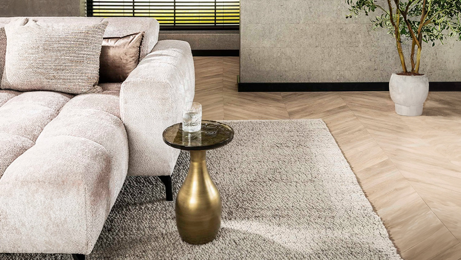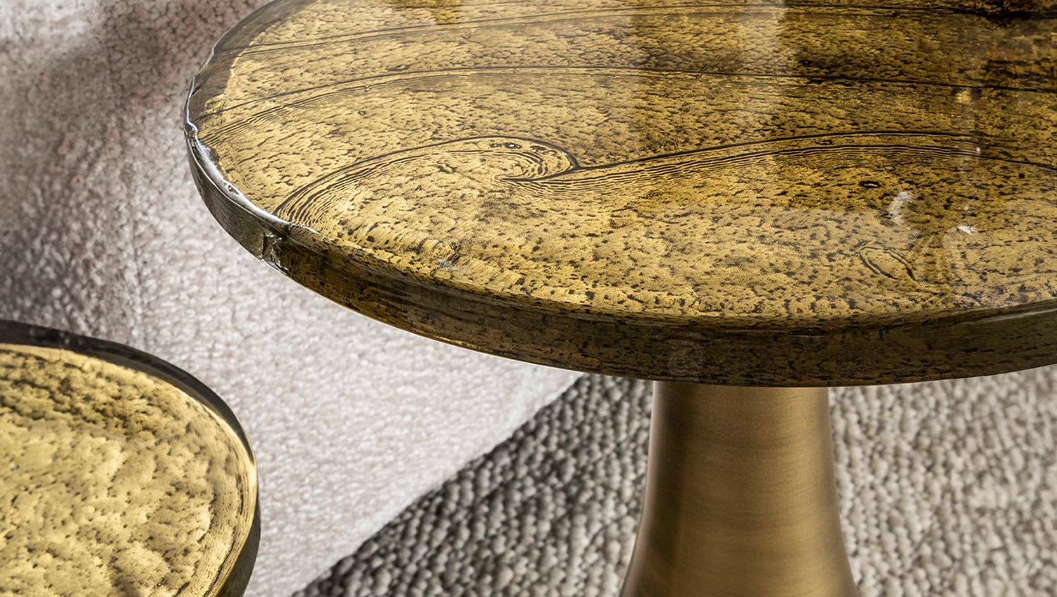 Der Beistelltisch MOKKA von KAWOLA ist ein stilvolles Designobjekt, das Eleganz und Funktionalität harmonisch verbindet. Sein tropfenförmiges Metallgestell in edlem Antikgold setzt einen luxuriösen Akzent und sorgt zugleich für eine solide Standfestigkeit. Die Tischplatte aus gezogenem Glas besticht durch ihre sanft gewellte Oberfläche und feinen Unregelmäßigkeiten, die jedem Stück eine individuelle Note verleihen. Mit seiner kompakten Form eignet sich der Tisch hervorragend, um kleine dekorative Highlights, Pflanzen oder Getränke geschmackvoll zu präsentieren. Durch das raffinierte Design fügt sich MOKKA mühelos in moderne wie klassische Wohnkonzepte ein und wird im Handumdrehen zum charmanten Blickfang. Ein vielseitiges Möbelstück, das Ihrem Zuhause eine besondere Note verleiht.