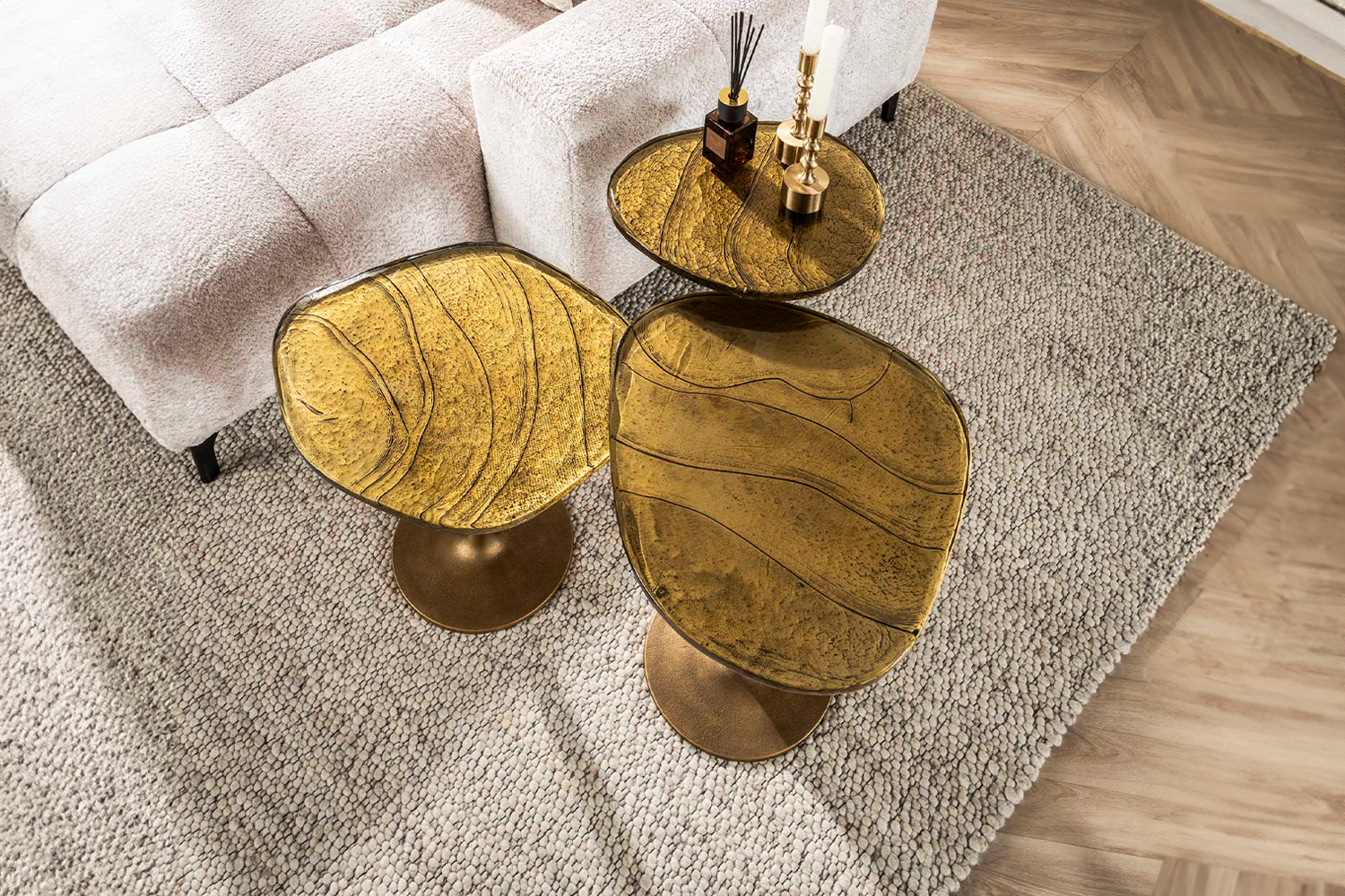 Ergänzende Details:Edle Glasplatte mit lebendiger handwerklicher Struktur Metallgestell in warm schimmerndem Antikgold Stilvoller Akzent für moderne Wohnräume Perfekte Bühne für Deko Drinks oder Lieblingsobjekte
