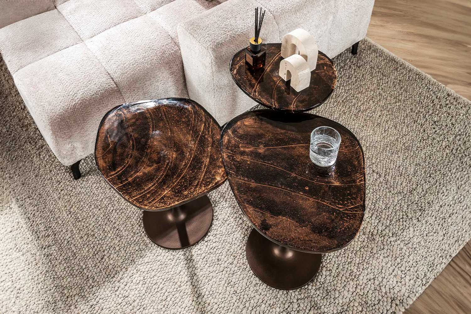 Der Beistelltisch DARI S von KAWOLA bringt Eleganz und Charakter in jeden Wohnraum. Die runde Glasplatte aus gezogenem Glas überzeugt mit einer feinen, sanft gewellten Oberfläche, die das Licht auf charmante Weise reflektiert. Die kleinen Unregelmäßigkeiten der Glasstruktur verleihen jedem Tisch eine individuelle Note und machen ihn zu einem besonderen Einzelstück. Das schlanke Metallgestell in warmem Antikkupfer rundet das Design harmonisch ab und sorgt für einen edlen, zeitlosen Look. Mit seiner kompakten Größe ist DARI die perfekte Lösung für kleinere Wohnbereiche oder als dezenter Begleiter neben Sofa oder Sessel. Er bietet eine stilvolle Ablagefläche für Getränke, Bücher oder Dekorationen und lässt sich dank seines minimalistischen Designs mühelos in jede Einrichtung integrieren. Ob als einzelner Blickfang oder als Ergänzung zu weiteren Akzentmöbeln – DARI sorgt immer für eine elegante, moderne Note.
