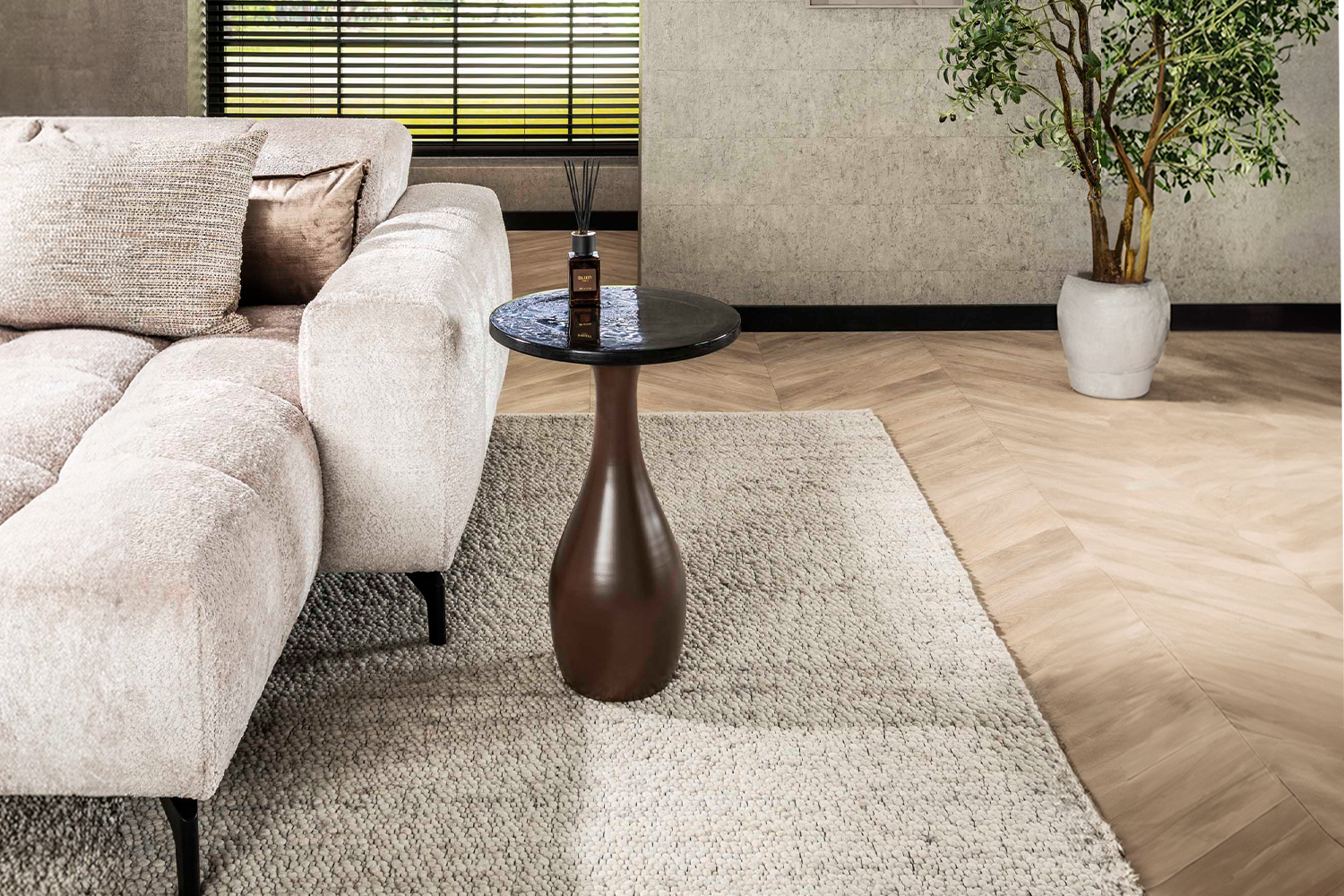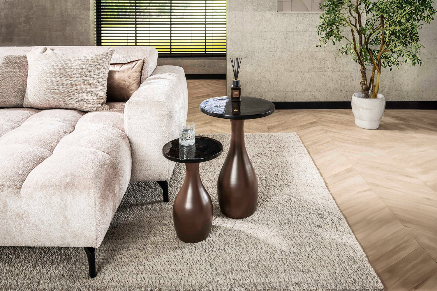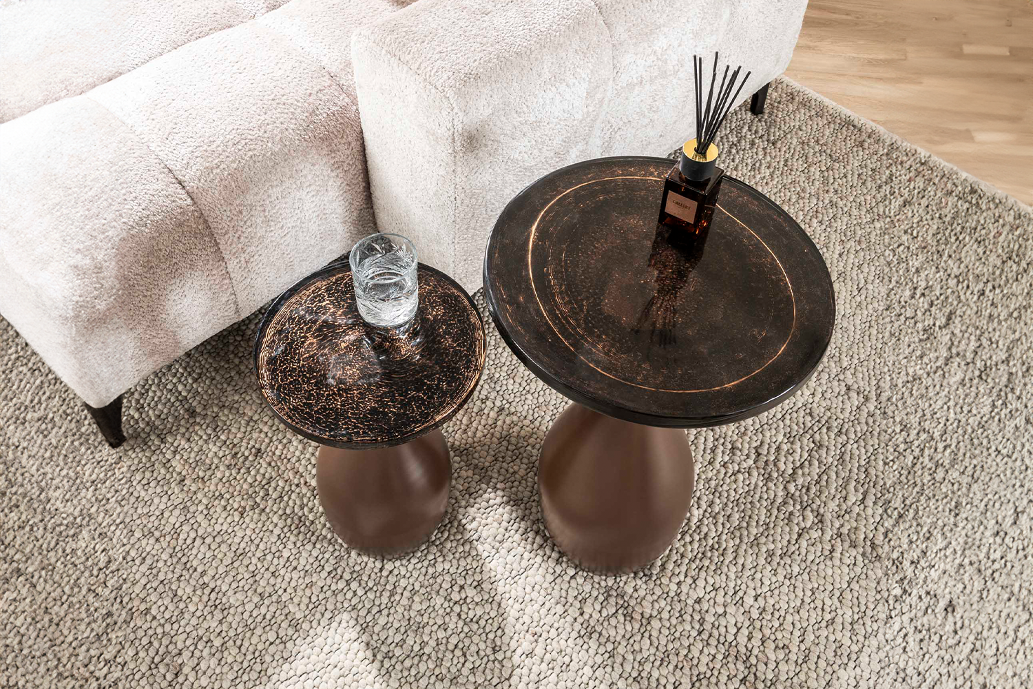 Der Beistelltisch MOKKA in Größe M von KAWOLA vereint zeitlose Formgebung mit einem Hauch von Extravaganz. Das tropfenförmige Metallgestell in edlem Antikkupfer ist nicht nur ein Blickfang, sondern verleiht dem Tisch auch seine besondere Eleganz. Die Tischplatte aus gezogenem Glas fasziniert mit einer sanft gewellten Oberfläche und dezenten Unregelmäßigkeiten, die an traditionelle Glasherstellung erinnern und jeden Tisch zu einem Unikat machen. Durch die mittlere Größe eignet sich MOKKA hervorragend als praktische Ablagefläche neben dem Sofa, als dekorativer Beisteller oder als stilvoller Platz für Ihre Lieblingspflanzen. Mit seiner harmonischen Kombination aus Glas und Metall bringt dieser Tisch modernes Flair in Ihr Zuhause und sorgt gleichzeitig für eine warme, einladende Atmosphäre.