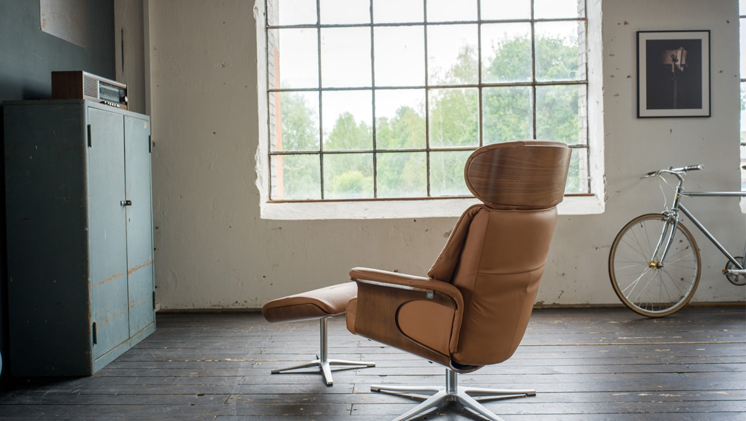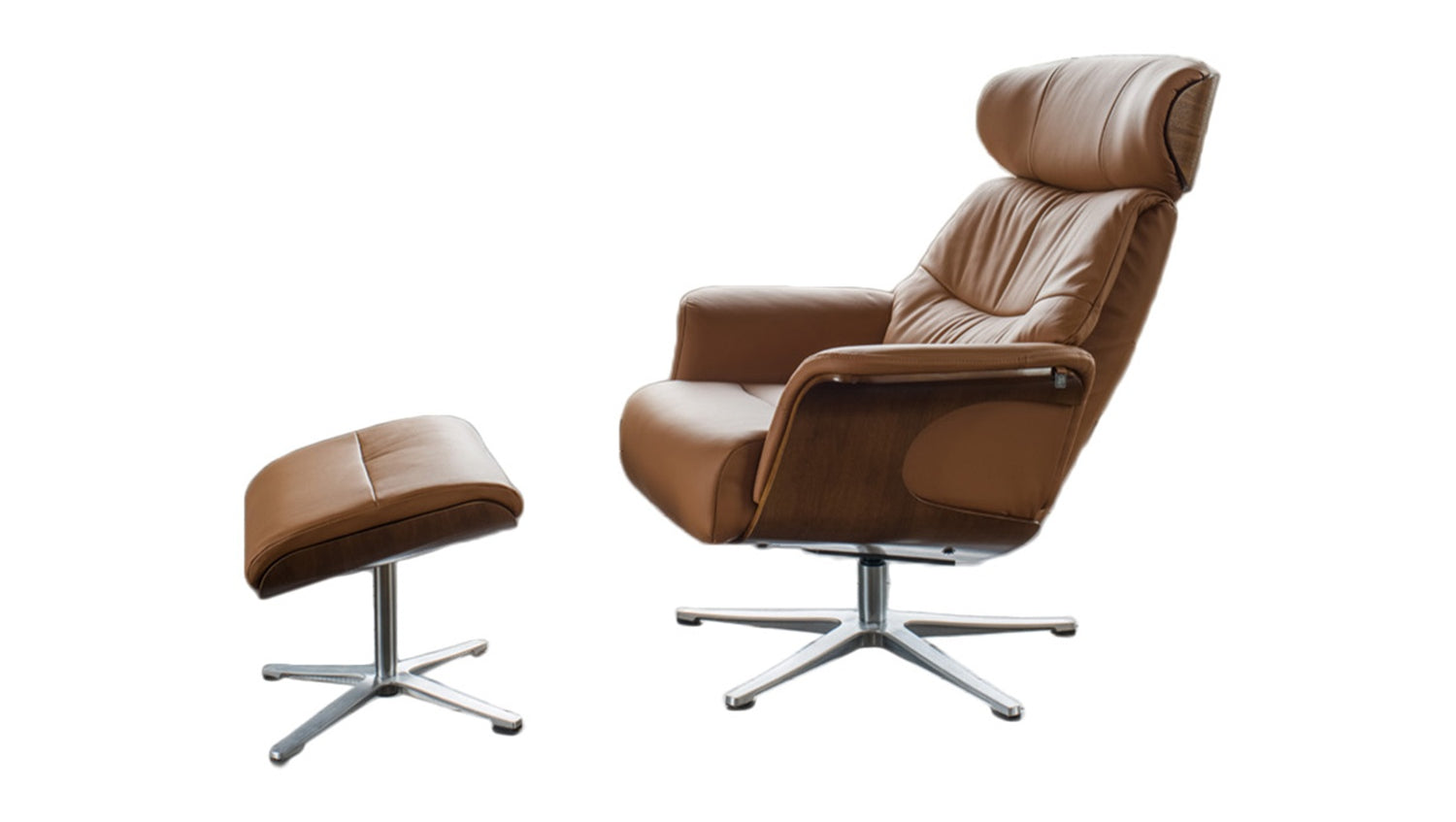 KAWOLA sillón TOSAR reclinable giratorio cuero marrón con Puf