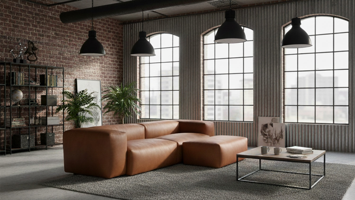 KAWOLA Sofá CELESTE 4 plazas con Puf cuero fibra tejido coñac