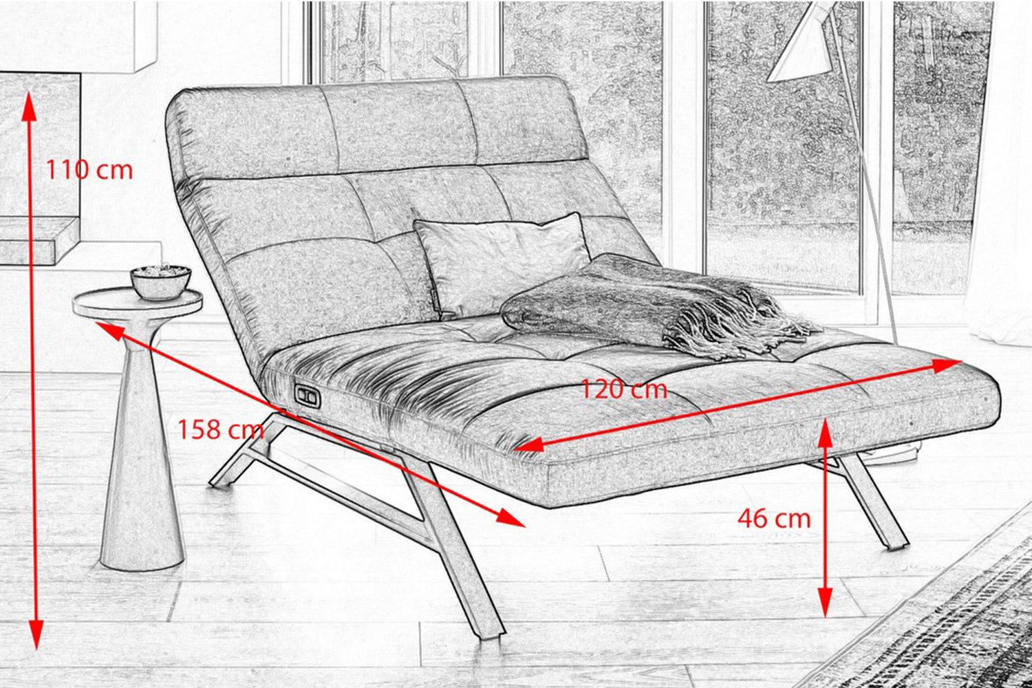 La Chaise longue AMERIVA de KAWOLA es una maravillosa combinación de diseño y funcionalidad. Las guías metálicas en negro mate contrastan con el moderno tejido de terciopelo. Sin embargo, la chaise longue no es sólo un verdadero atractivo visual, sino que también cumple todos los deseos en cuanto a funcionalidad. La función motorizada, que puede accionarse con los botones del lado derecho, ofrece una posición de reclinación infinitamente ajustable. La Chaise longue también dispone de conexión USB. La versatilidad de este mueble es tan variada como sus funciones: La chaise longue AMERIVA no sólo es ideal para el salón de casa, sino también para el vestíbulo o la sala de descanso.