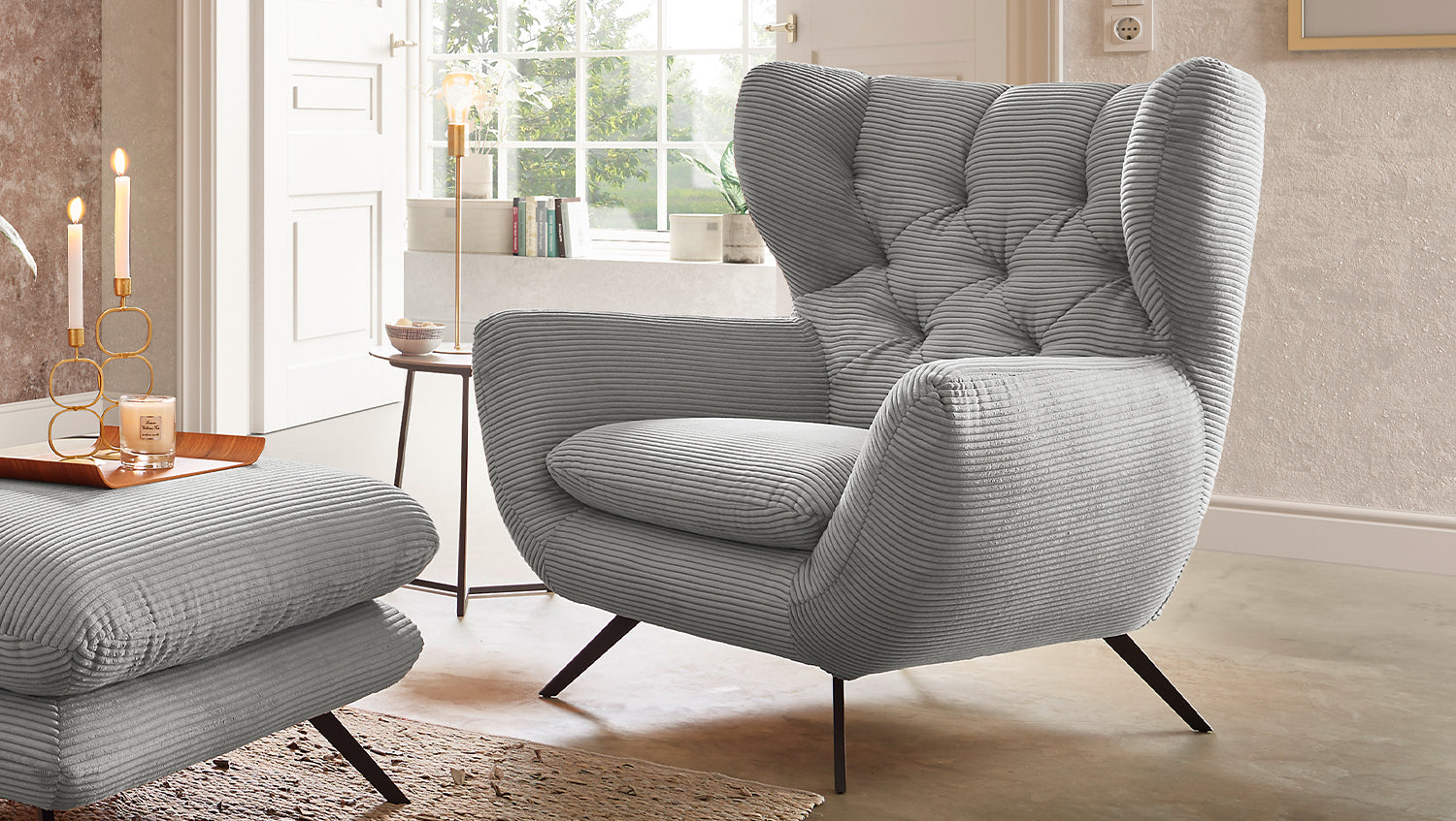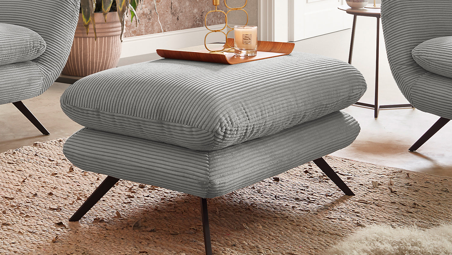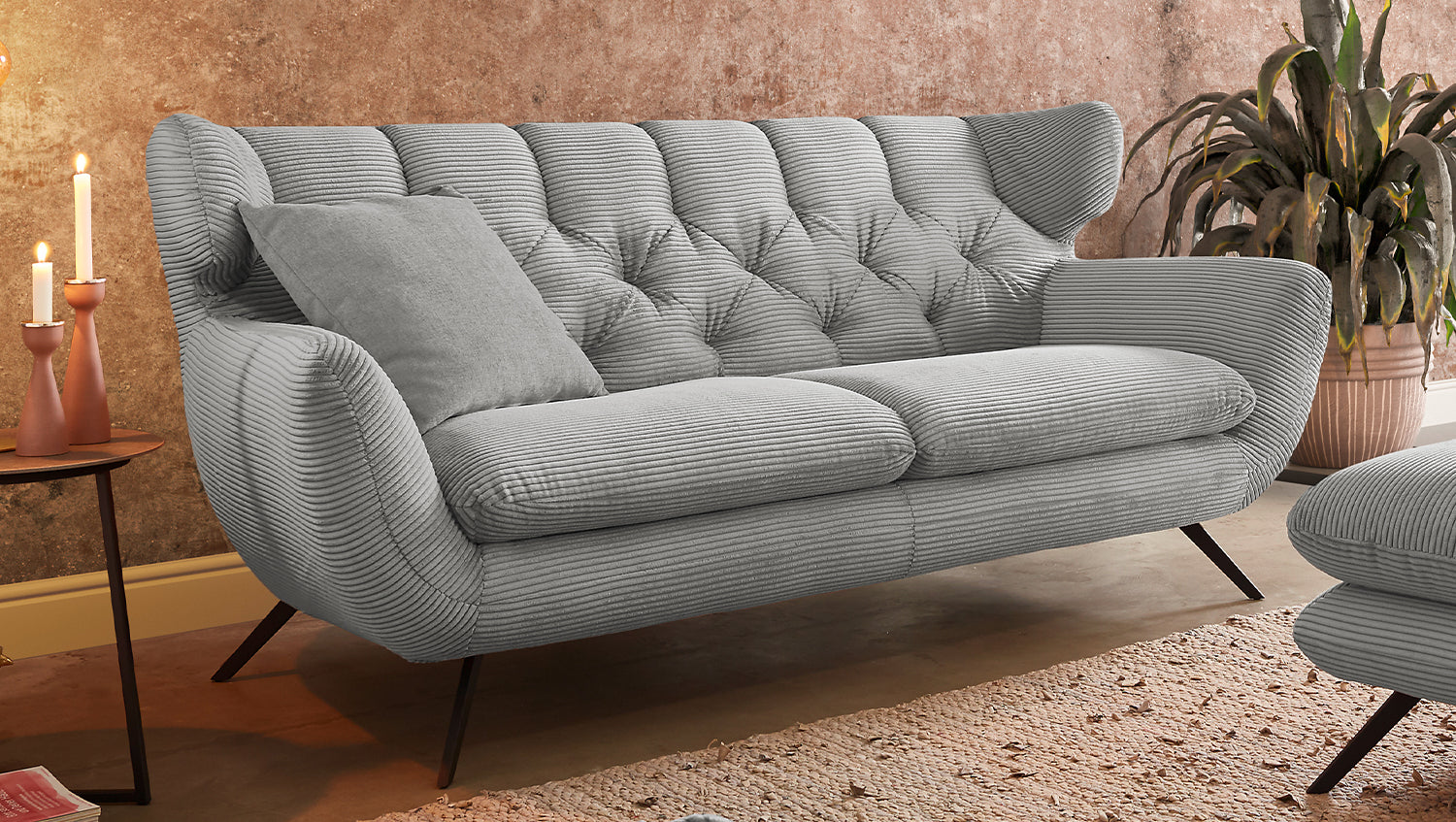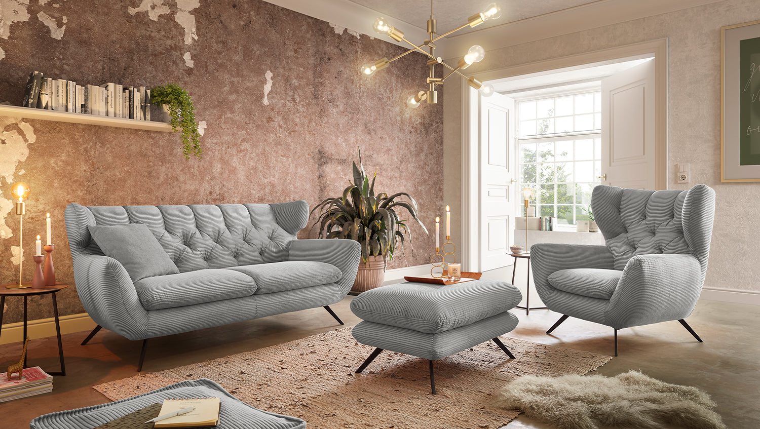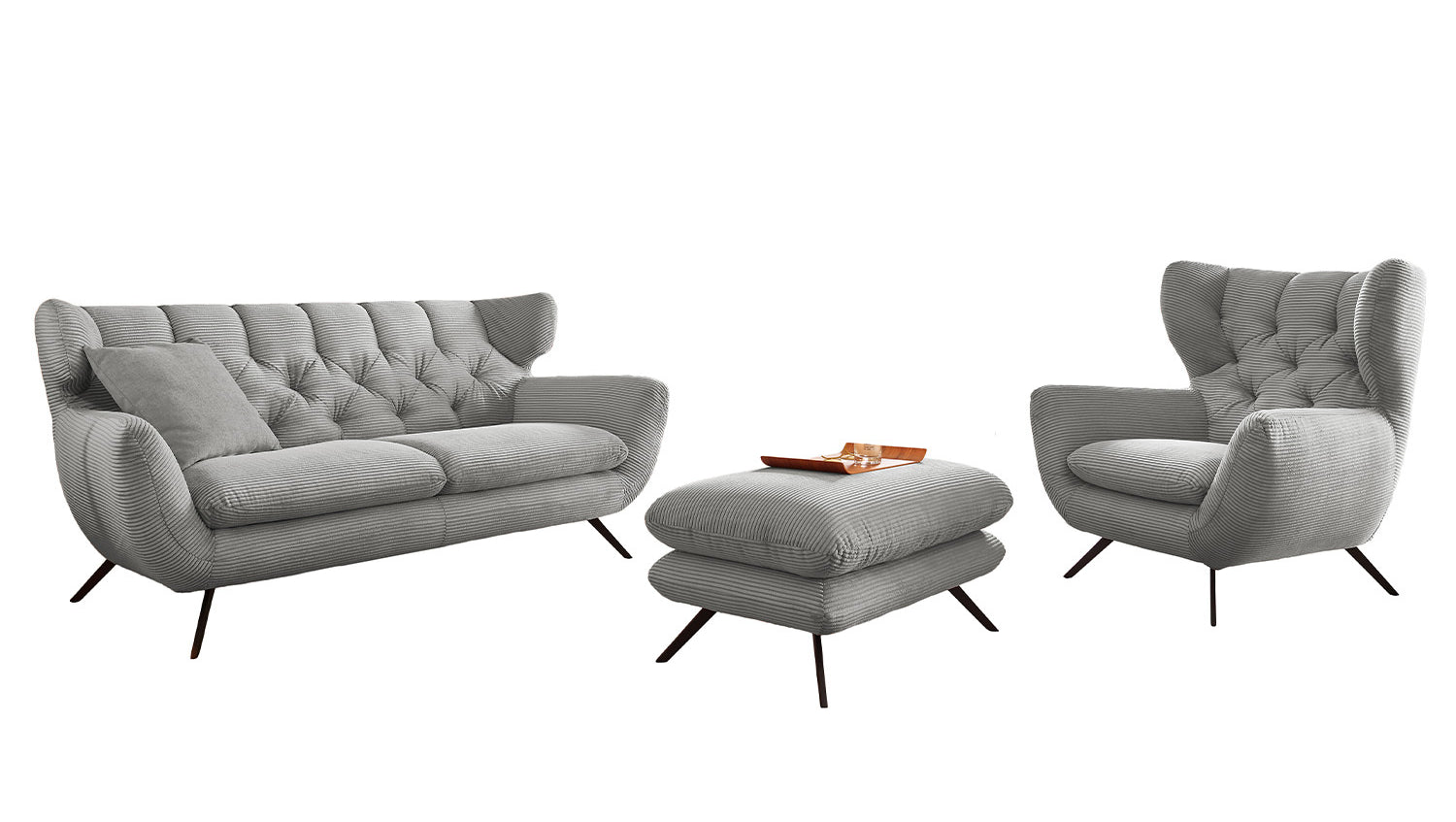 El grupo de asientos KAWOLA CHARME, compuesto por un sofá, un sillón y un Puf, está completamente revestido de pana. El respaldo también es de pana, lo que permite colocar el sofá y el sillón en cualquier lugar de la habitación. El estilo recuerda a los años sesenta: los respaldos del sofá y el sillón se han acolchado de forma elaborada sin botones; los respaldos se han curvado ligeramente hacia delante en ambos lados y recuerdan la forma de un sillón de ala; los pies de metal negro son ligeramente acampanados. La tapicería de la colección KAWOLA CHARME es de espuma PUR e impresiona por su comodidad de asiento suave y desenfadada. Los cojines del asiento se amoldan cómodamente a la forma del cuerpo. Si lo que busca no es simplemente un lugar donde sentarse, sino un punto de atracción muy especial, el grupo de asientos CHARME es la elección perfecta.