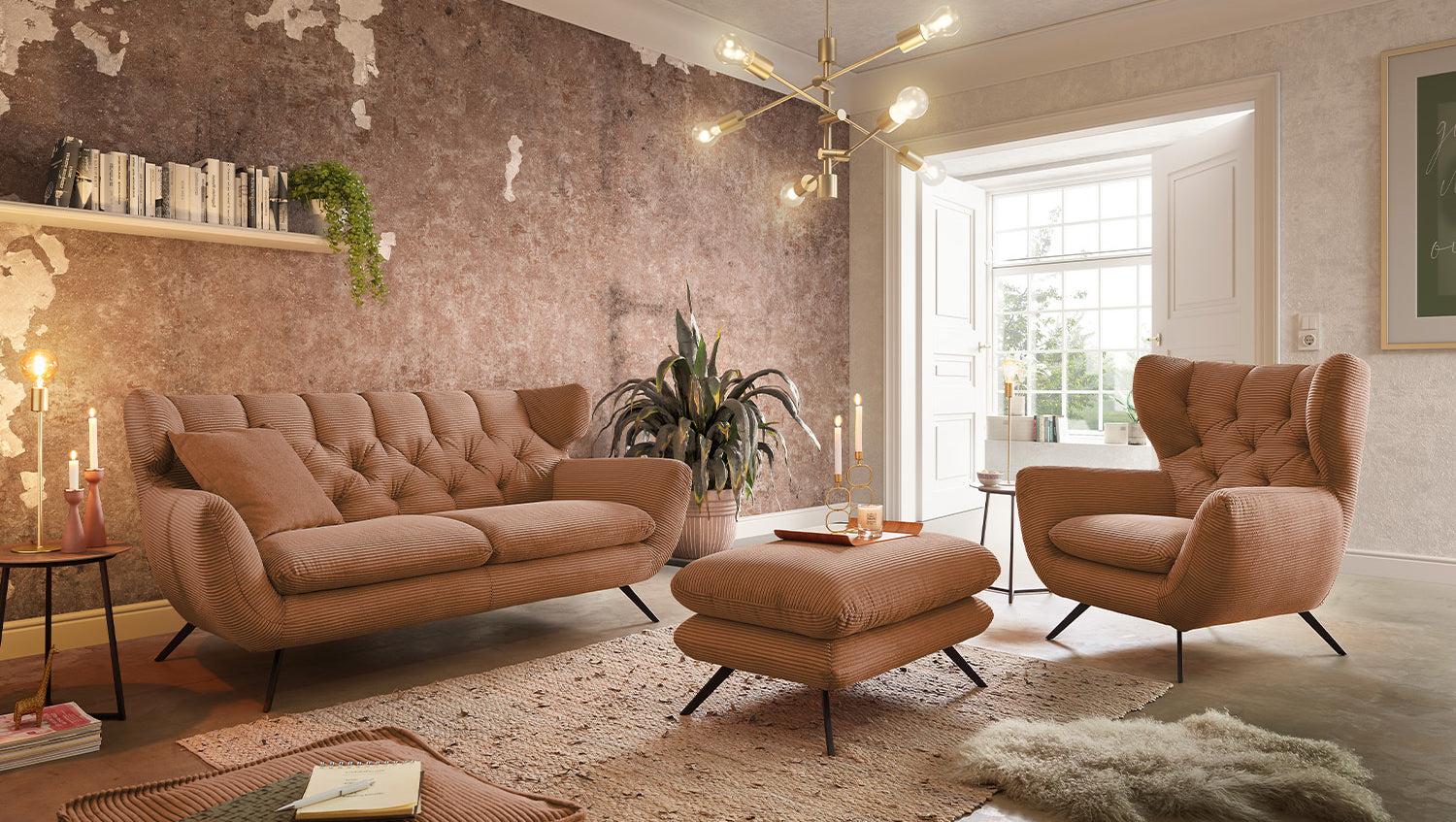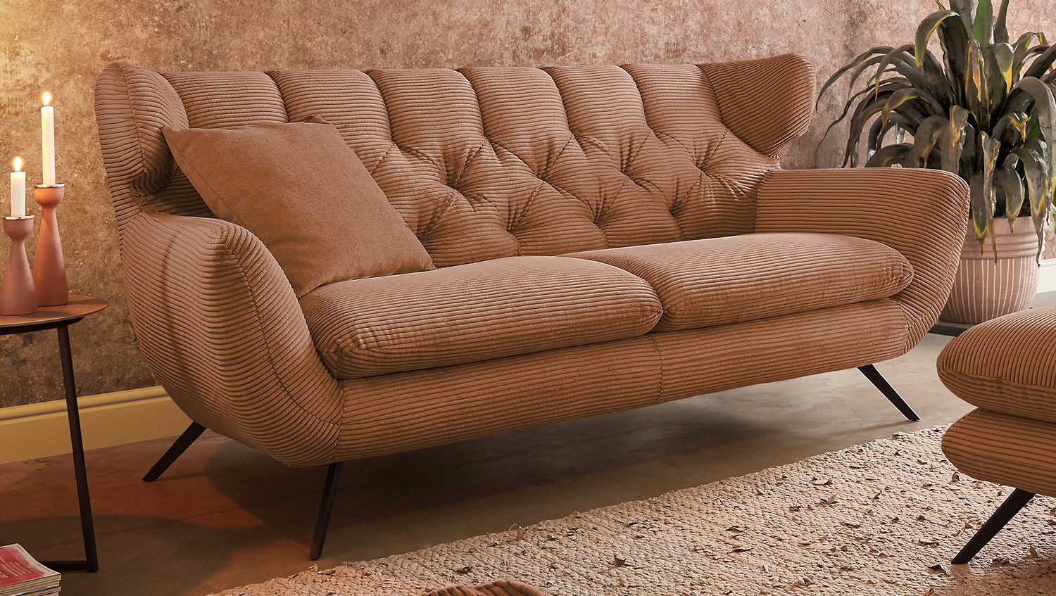 El grupo de asientos KAWOLA CHARME, compuesto por un sofá, un sillón y un Puf, está completamente revestido de pana. El respaldo también es de pana, lo que permite colocar el sofá y el sillón en cualquier lugar de la habitación. El estilo recuerda a los años sesenta: los respaldos del sofá y el sillón se han acolchado de forma elaborada sin botones; los respaldos se han curvado ligeramente hacia delante en ambos lados y recuerdan la forma de un sillón de ala; los pies de metal negro son ligeramente acampanados. La tapicería de la colección KAWOLA CHARME es de espuma PUR e impresiona por su comodidad de asiento suave y desenfadada. Los cojines del asiento se amoldan cómodamente a la forma del cuerpo. Si lo que busca no es simplemente un lugar donde sentarse, sino un punto de atracción muy especial, el grupo de asientos CHARME es la elección perfecta.