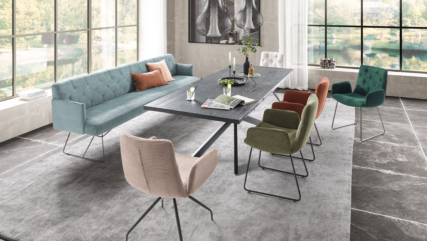 El banco de comedor KAWOLA CHARME aporta un aire vintage a cualquier habitación. Gracias a su diseño minimalista, el cómodo Banco tapizado se adapta a cualquier hogar e invita a pasar las tardes jugando con los amigos o la familia. El banco se caracteriza por su tapizado desenfadado y el elevado confort de asiento que conlleva. La estructura desenfadada del asiento es típica del modelo y el diseño ondulado acentúa el factor acogedor del banco. El acogedor tapizado se acentúa aún más con la suave funda de tela de pana de moda, que hace que la sensación del banco sea acogedora y cómoda. Como el banco de comedor CHARME está revestido totalmente de tela, también se puede colocar en cualquier lugar de la habitación. El Banco tapizado encaja perfectamente en su hogar gracias a sus pies de alambre y a su elegante tapizado de pana. El banco tiene capacidad para cuatro personas que pueden disfrutar de una comodidad de asiento sin restricciones.