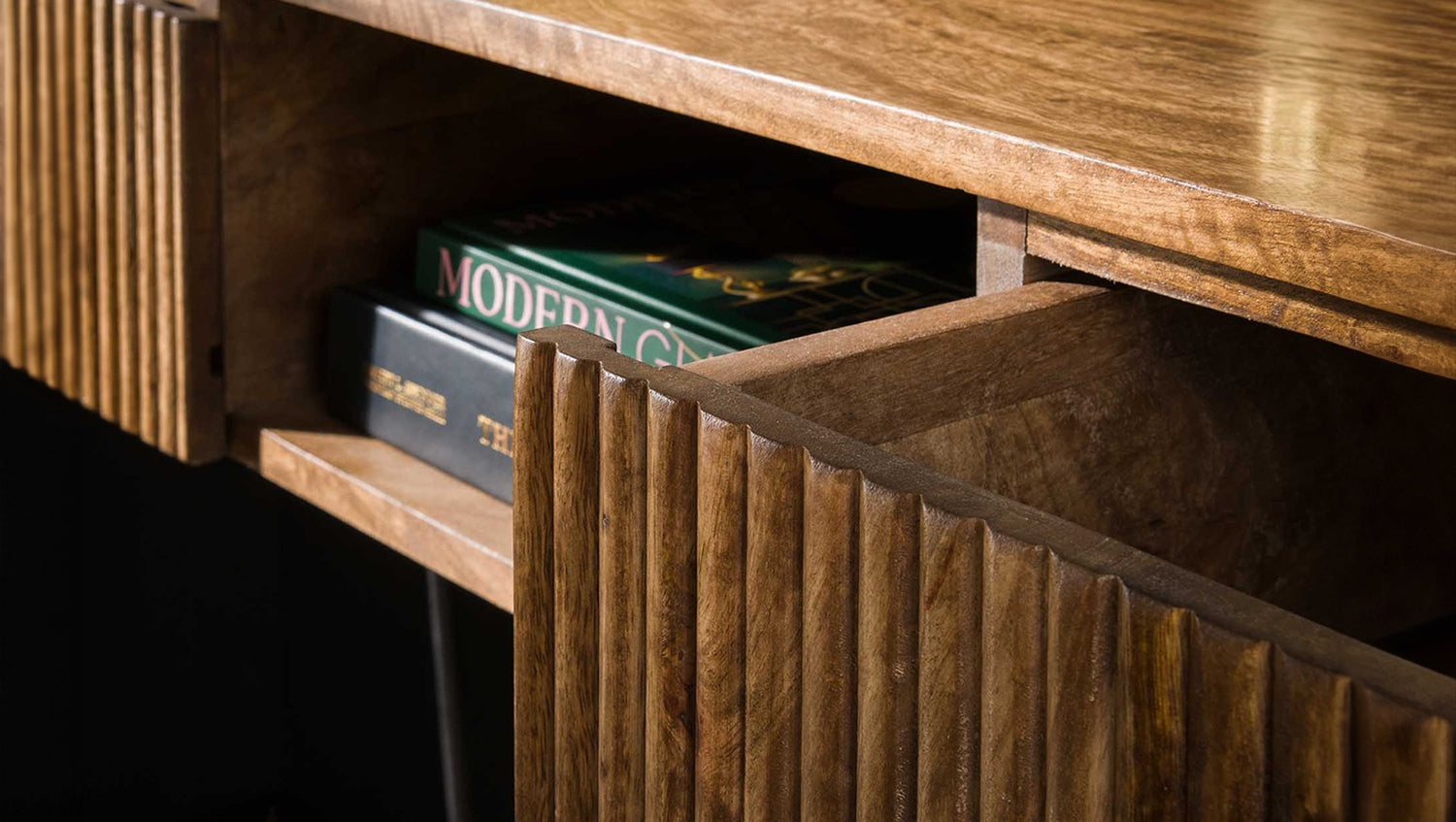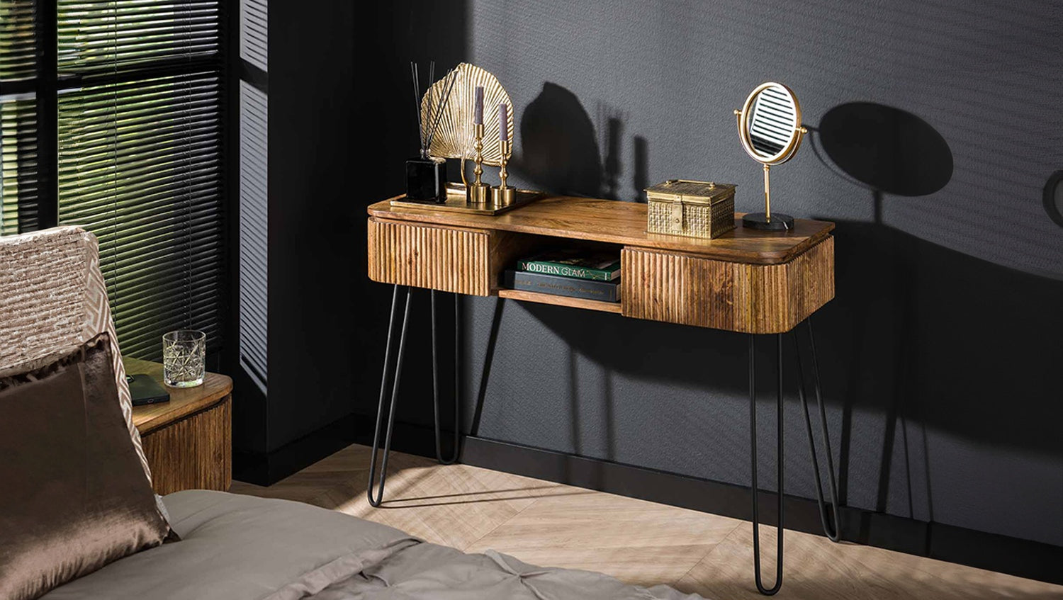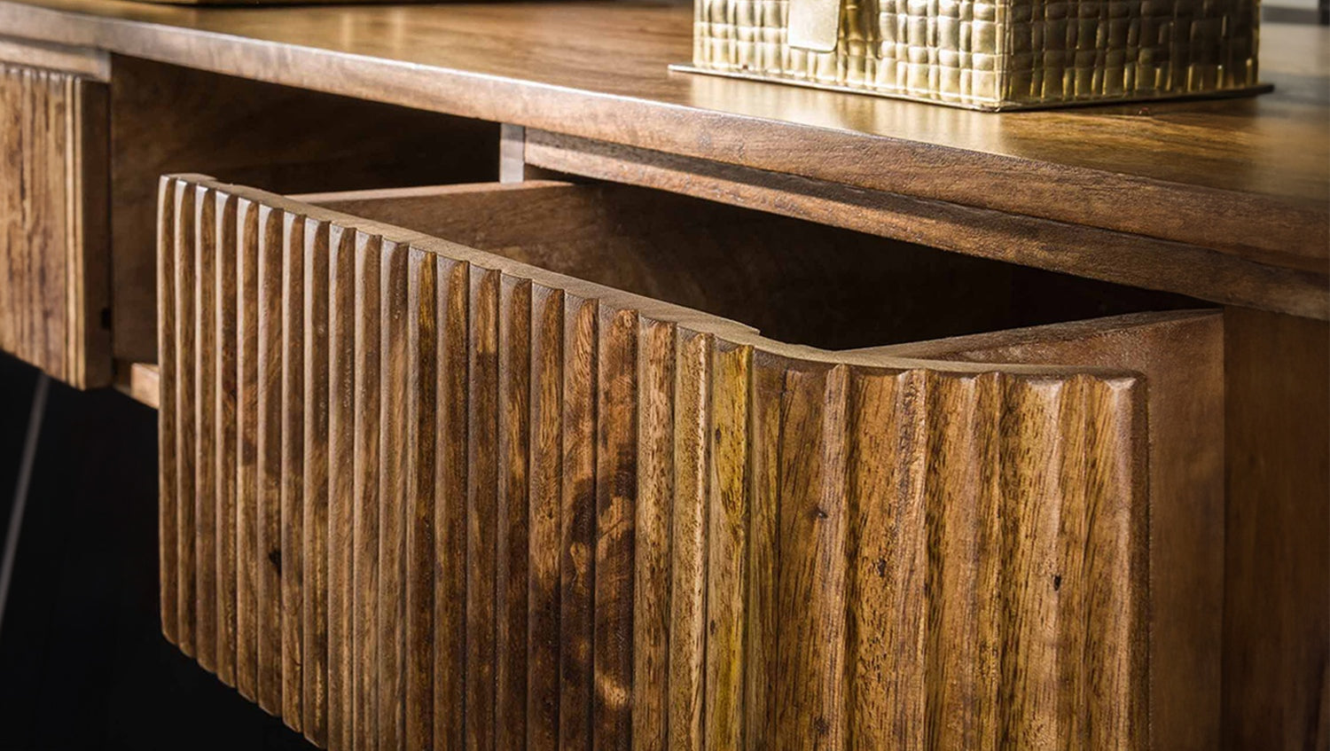 El tocador HEVE de KAWOLA es una obra maestra del diseño moderno con un toque especial. Fabricado en madera de mango de alta calidad y refinado con un cálido acabado en color arena, irradia elegancia natural. Lo más destacado es el moderno diseño ondulado de los frentes, que confiere al mueble una textura dinámica única y atrae los sentidos. Con dos prácticos cajones y un compartimento abierto, HEVE ofrece un espacio de almacenamiento inteligentemente organizado. Este mueble versátil puede utilizarse tanto como elegante tocador como acogedora mesa de recibidor y es un elemento definitorio de la exclusiva gama HEVE.
