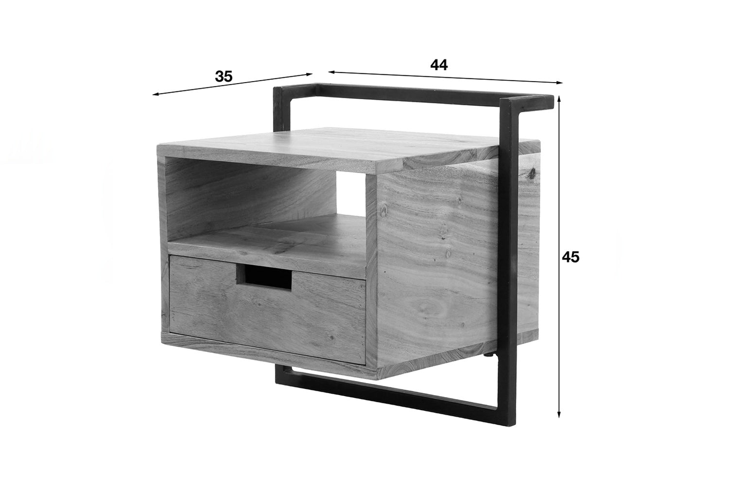 La mesilla de noche KAWOLA AIDY impresiona por su moderno diseño y sus materiales de alta calidad. Fabricada en madera de acacia maciza con un lacado transparente mate, aporta una elegancia natural a su dormitorio. La mesita de noche dispone de un cajón y un compartimento abierto. El robusto armazón de metal no sólo proporciona estabilidad, sino también un aspecto elegante e industrial. La mesilla de noche puede fijarse a la pared de forma fácil y segura mediante un robusto listón con tres orificios para tornillos, para conseguir un aspecto flotante y ahorrar espacio. Con unas medidas de 44 x 35 x 45 cm, AIDY XL ofrece mucho espacio de almacenamiento y es ideal para libros, adornos u objetos cotidianos. La mesilla de noche AIDY es la elección perfecta para cualquiera que desee combinar funcionalidad con diseño moderno y mano de obra de alta calidad.