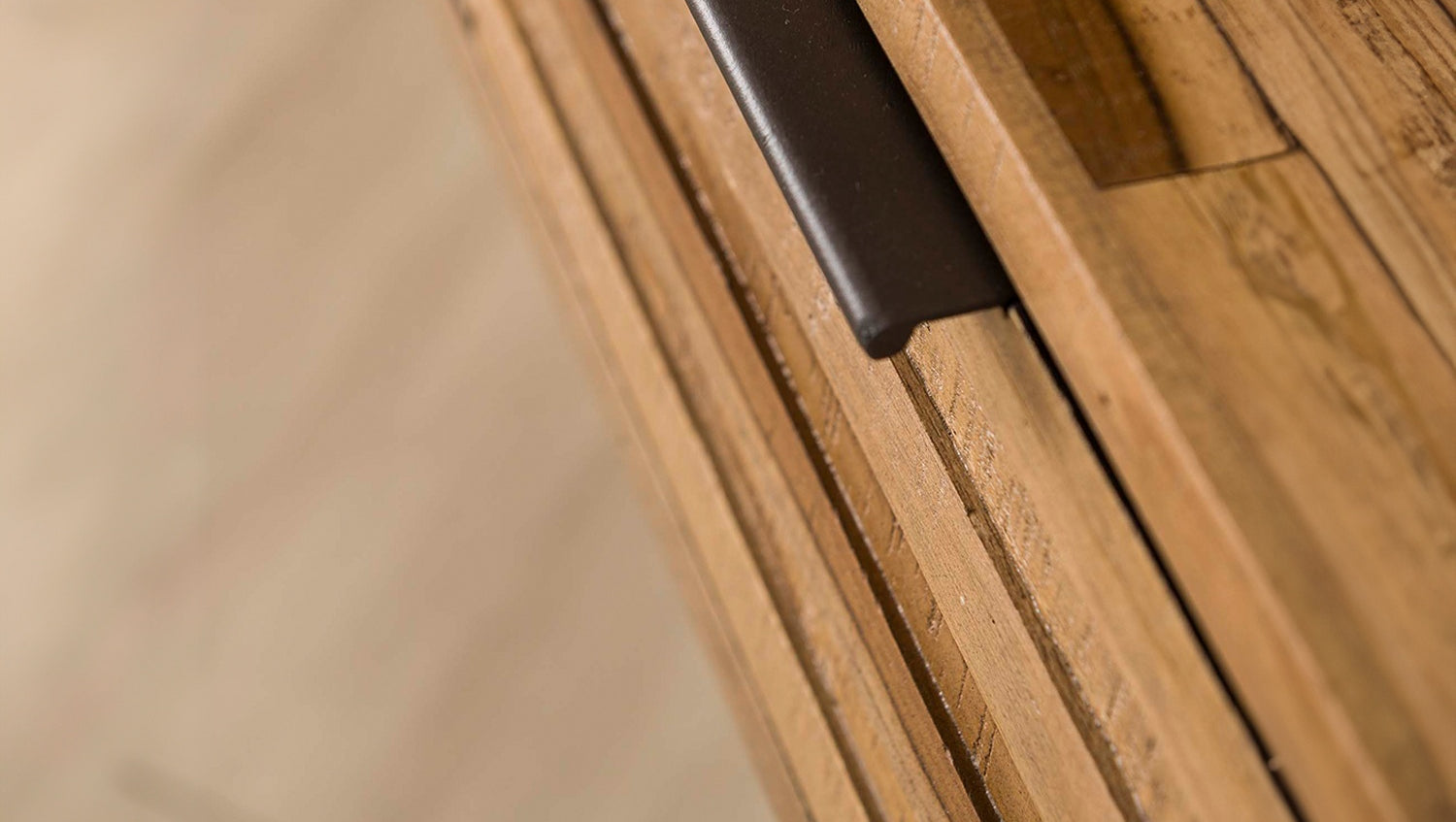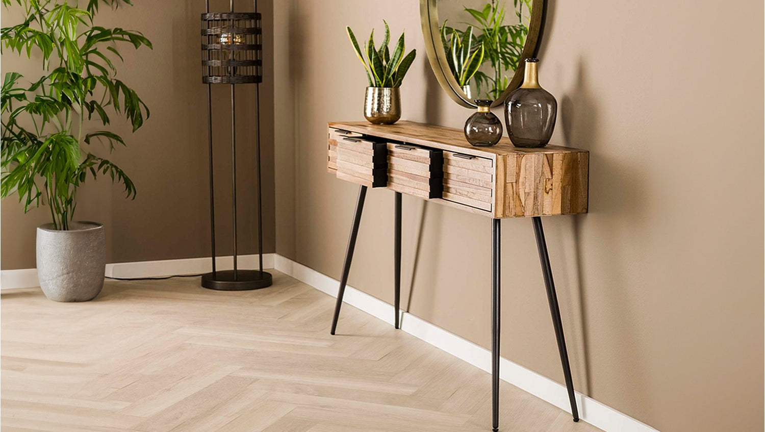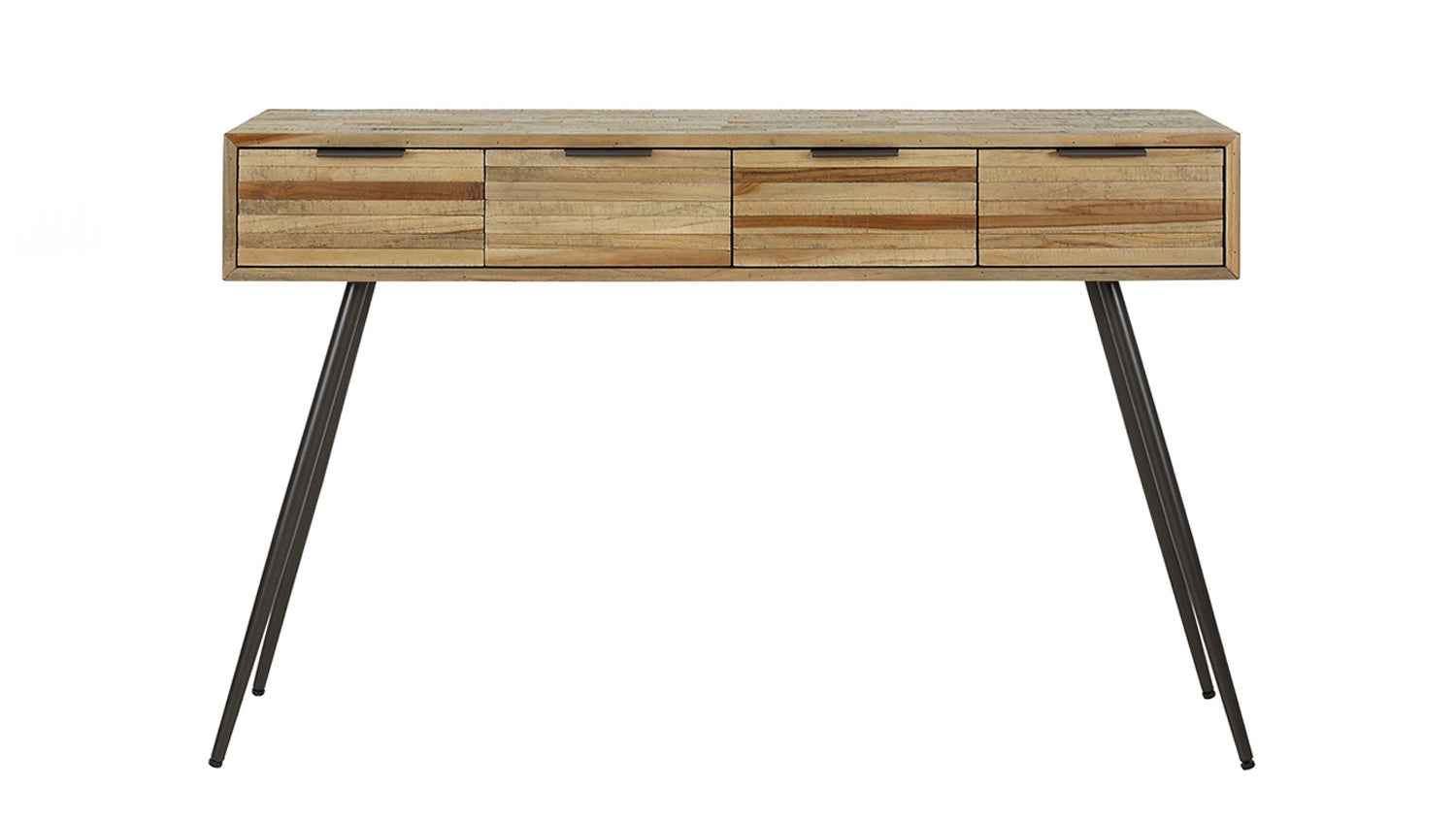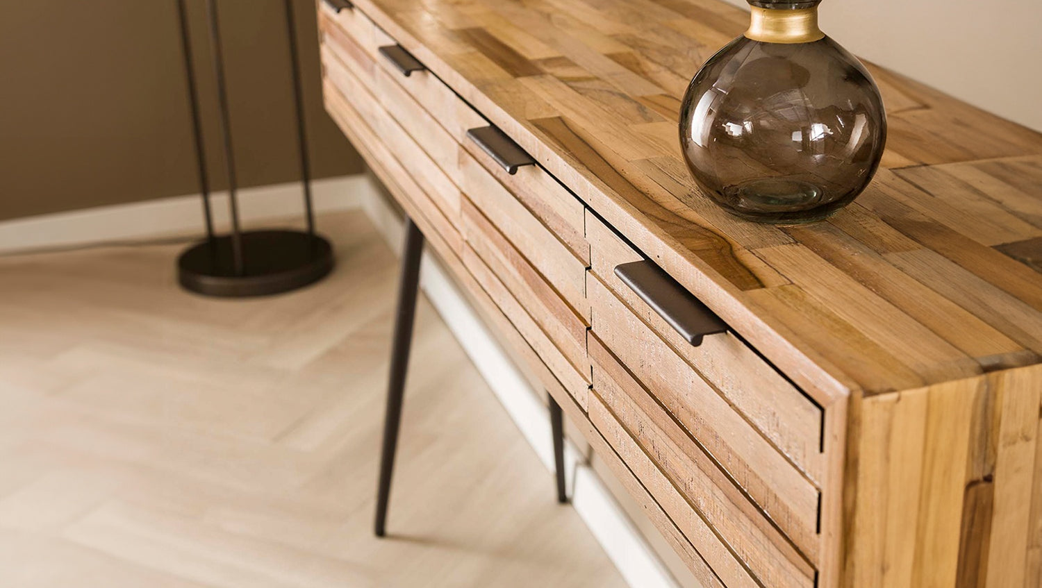 El tocador TICAR de KAWOLA es una declaración de auténtica naturalidad y diseño sofisticado. Fabricado en madera de teca envejecida y con carácter, con un acabado lacado mate transparente, irradia una historia única. Su aspecto especial se debe a la disposición de los listones de madera en los frentes y el tablero, que crea una textura fascinante. Apoyado sobre patas metálicas cónicas que dan al mueble un aspecto moderno, TICAR ofrece mucho espacio de almacenamiento con cuatro prácticos cajones. El interior de los cajones está forrado de madera lisa de color gris oscuro, un detalle de lujo. Con unas medidas de 120x30x76 cm, este versátil mueble es ideal como acogedora mesa de recibidor o como elegante tocador. Un elemento definitorio de la exclusiva serie Strip.
